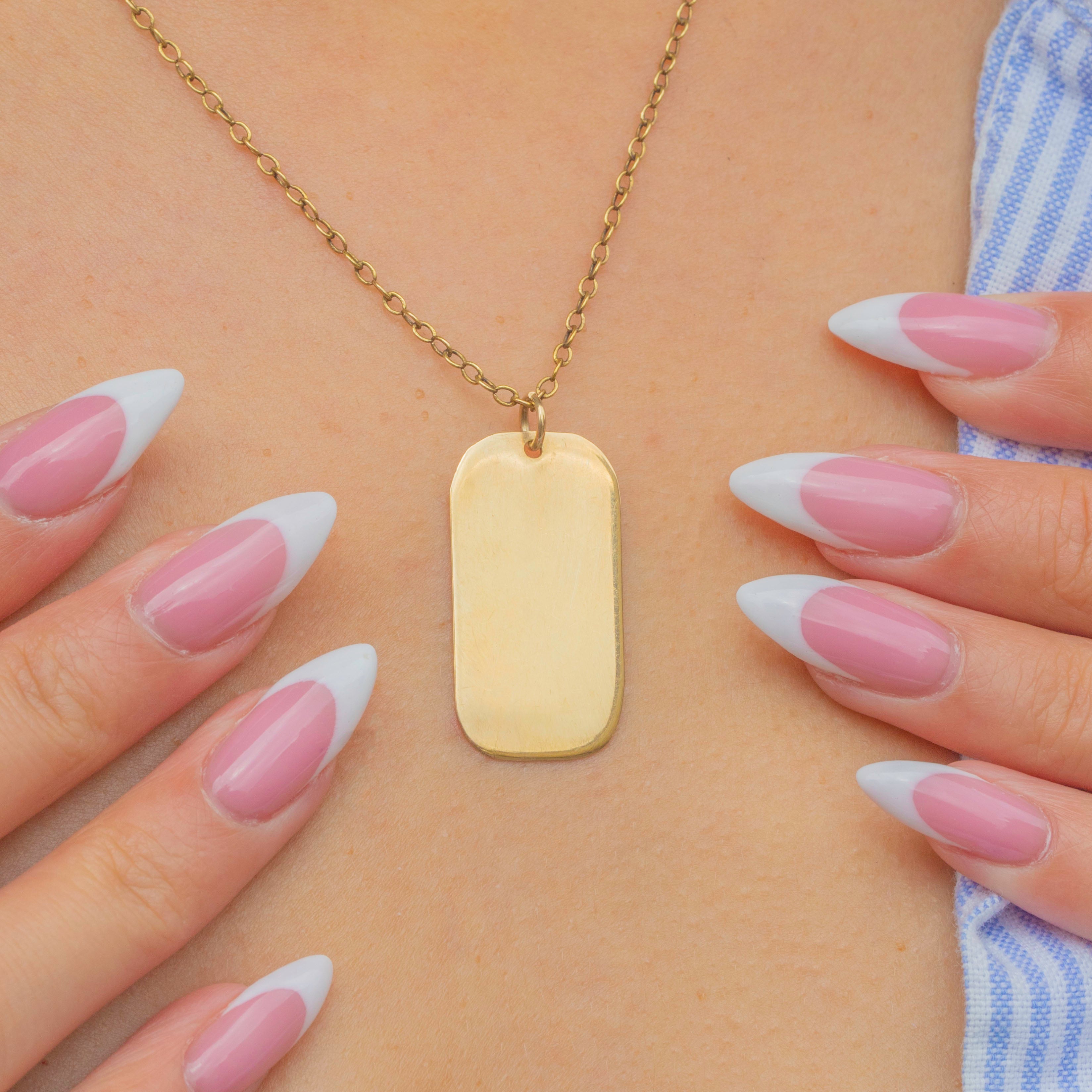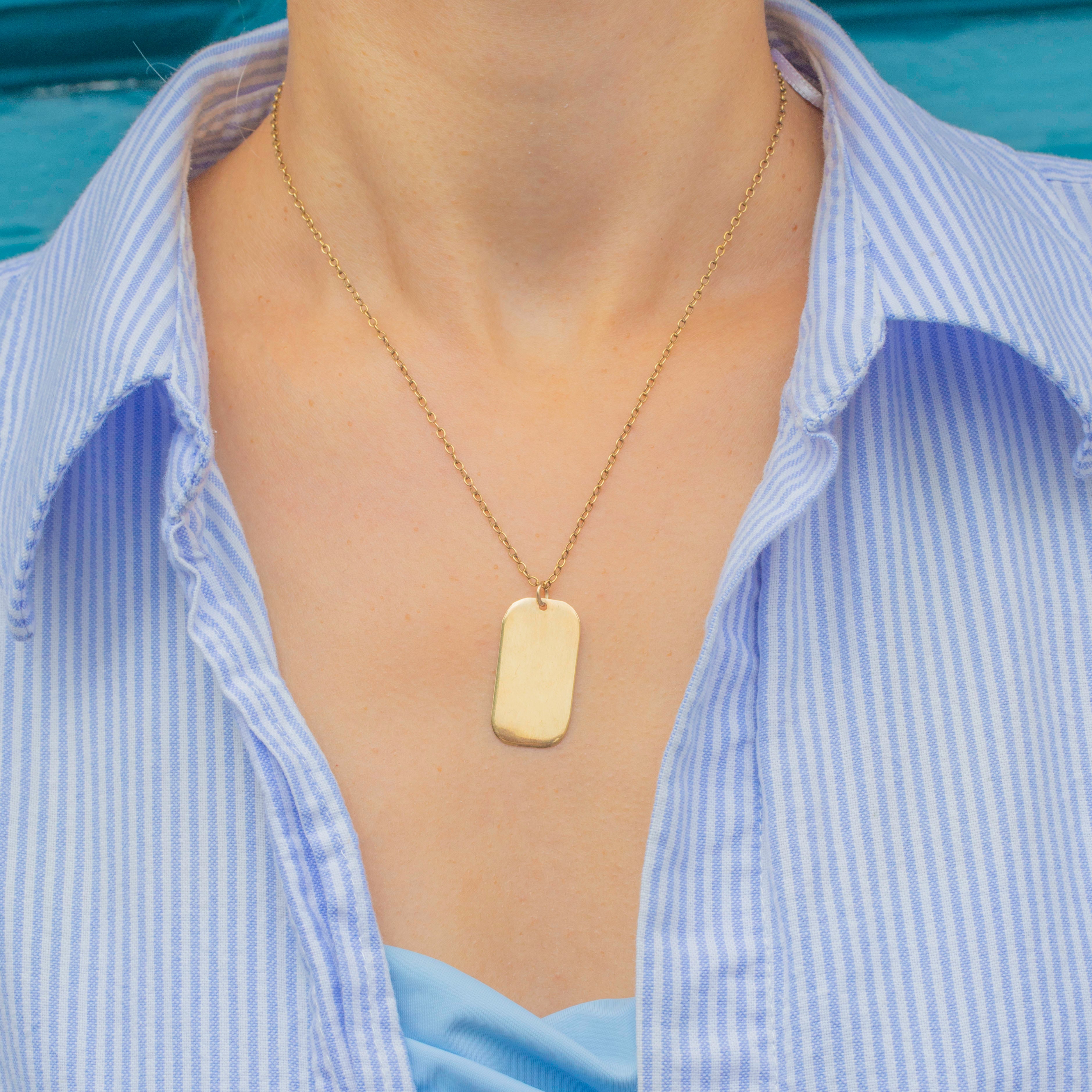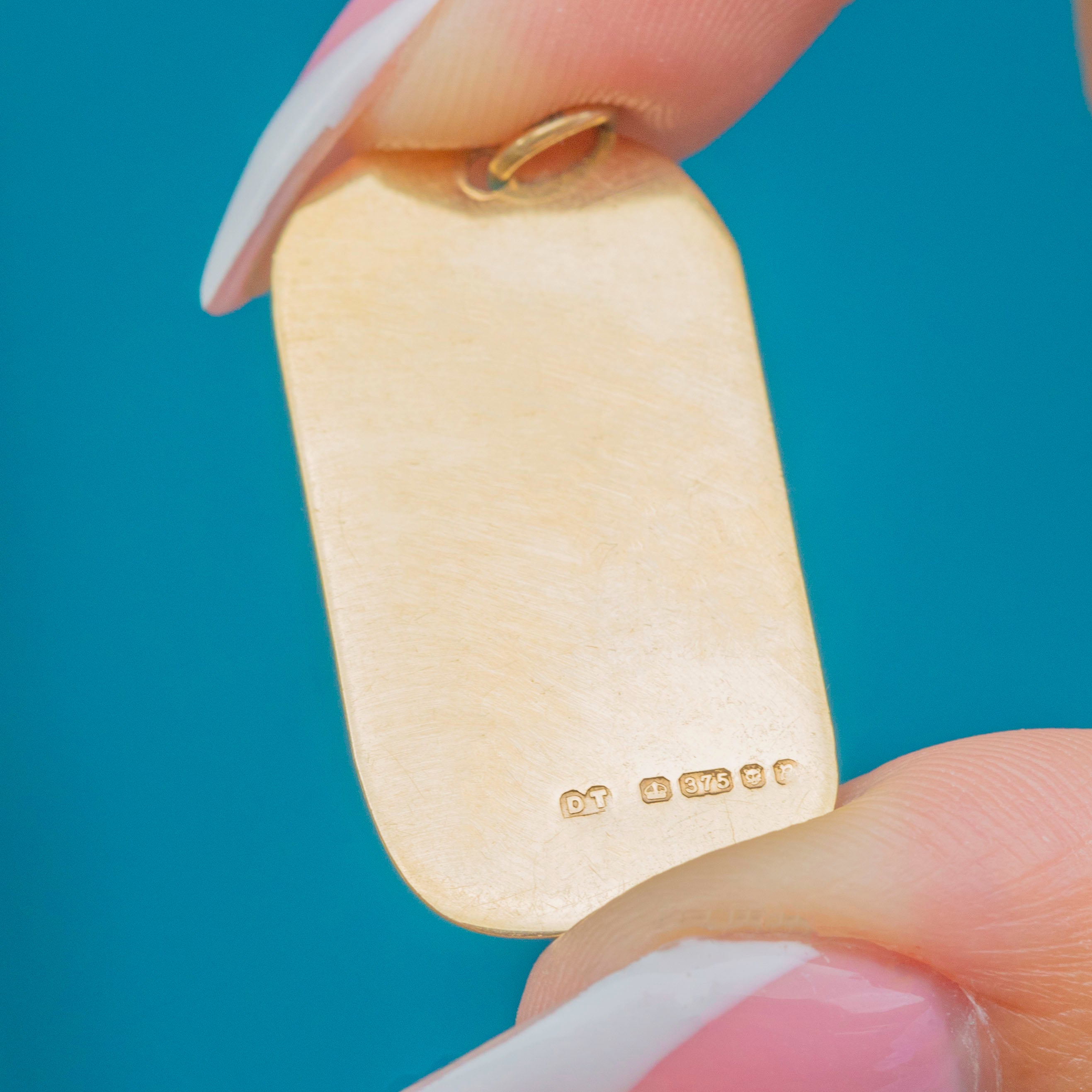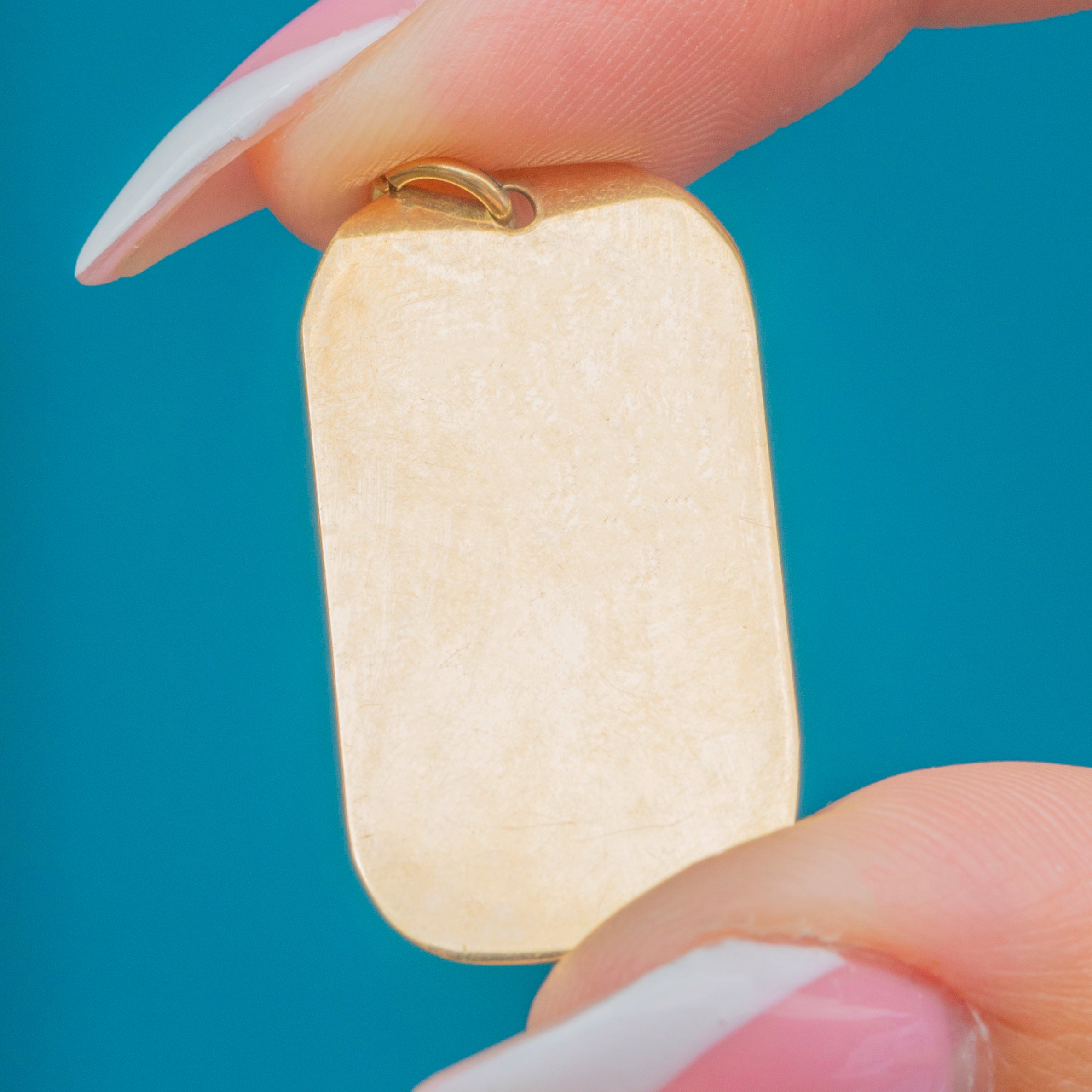 This Mid-Century Vintage pendant is crafted in solid 9ct Gold and formed into a classic dog tag. The smooth, polished surface offers a timeless, minimalist look and can be personalised with engravings if desired.
