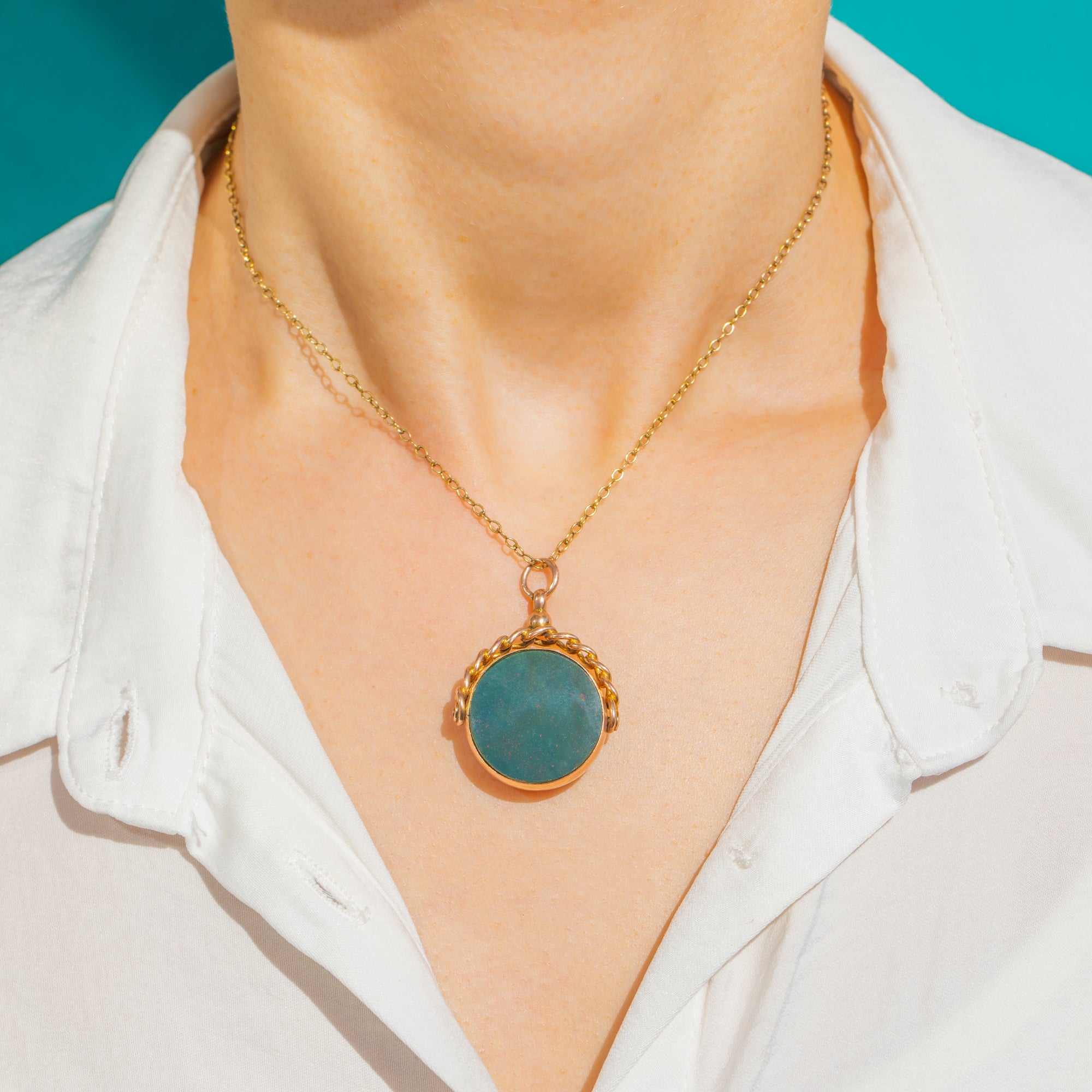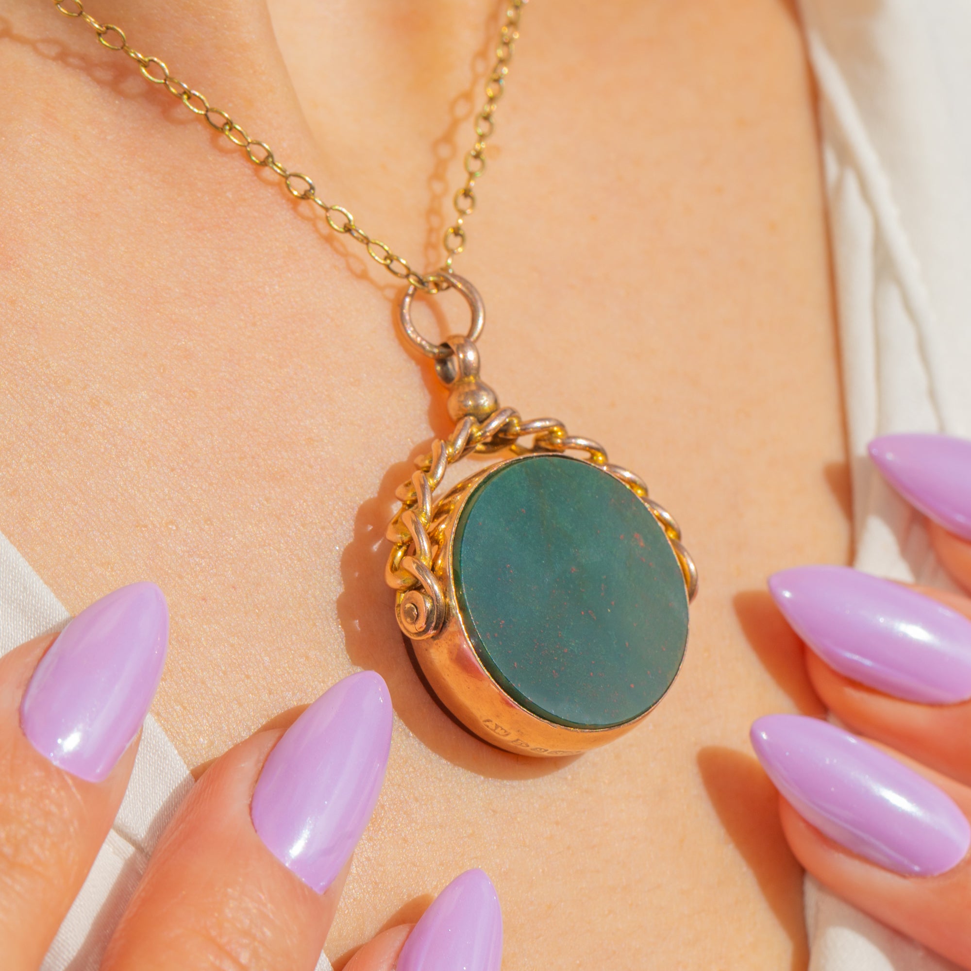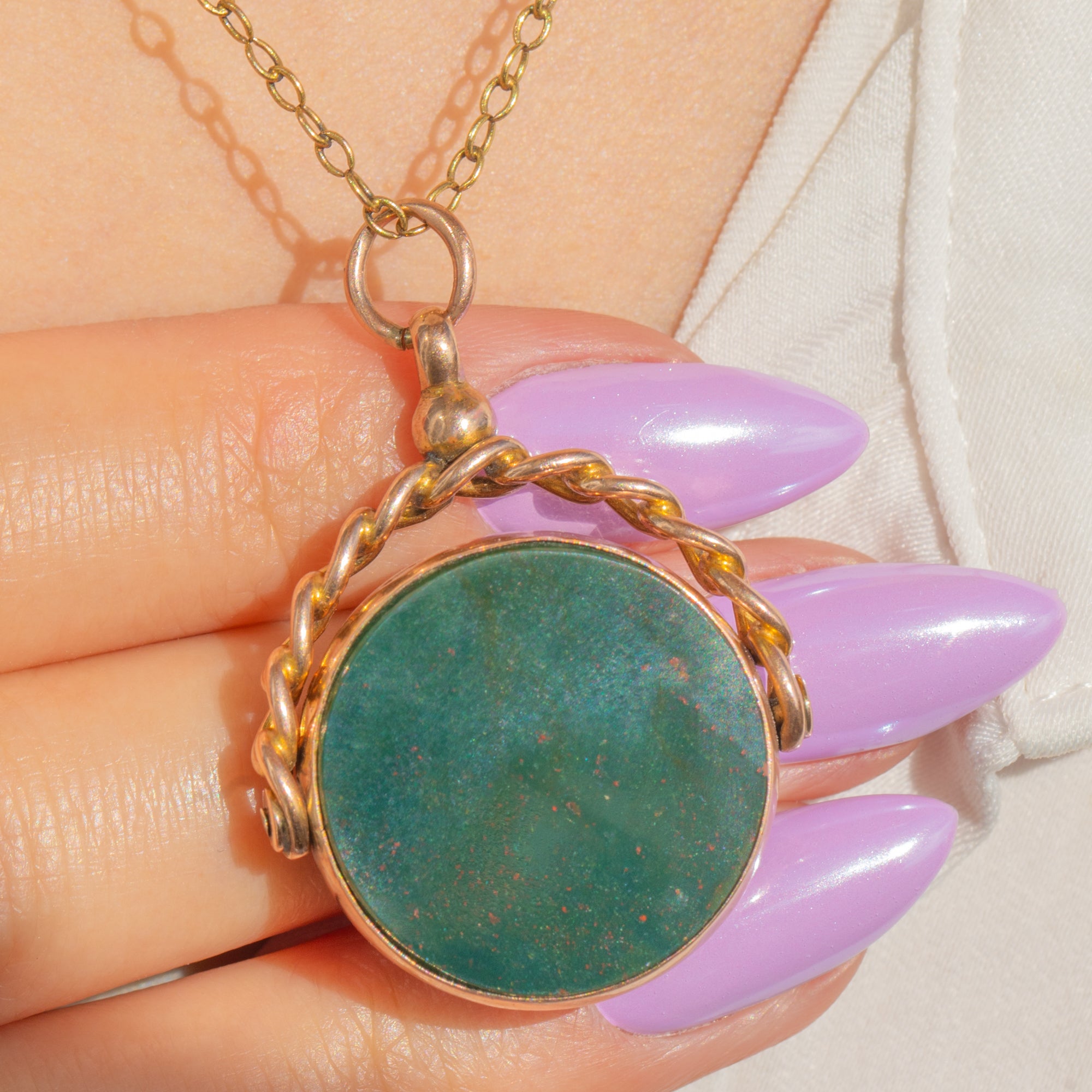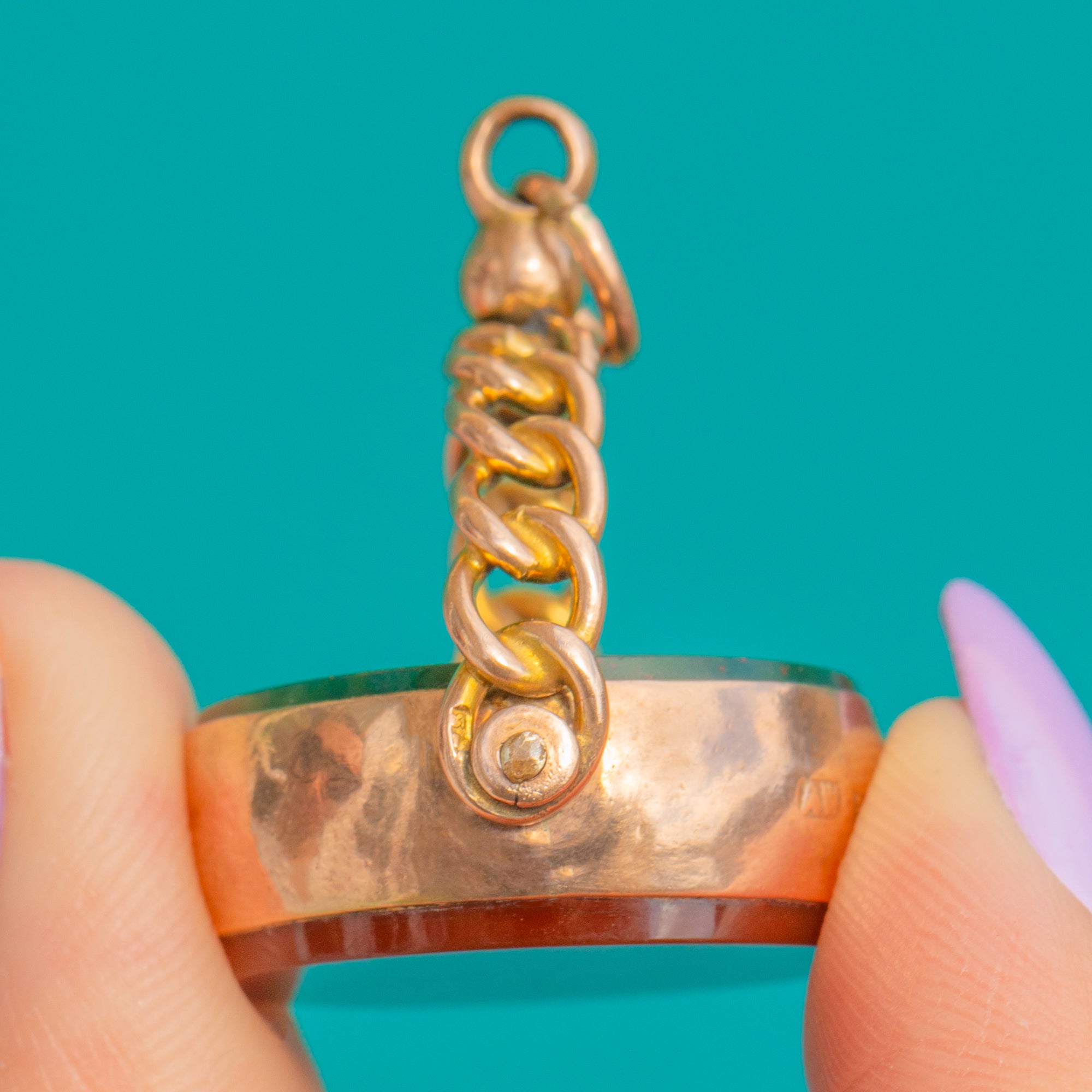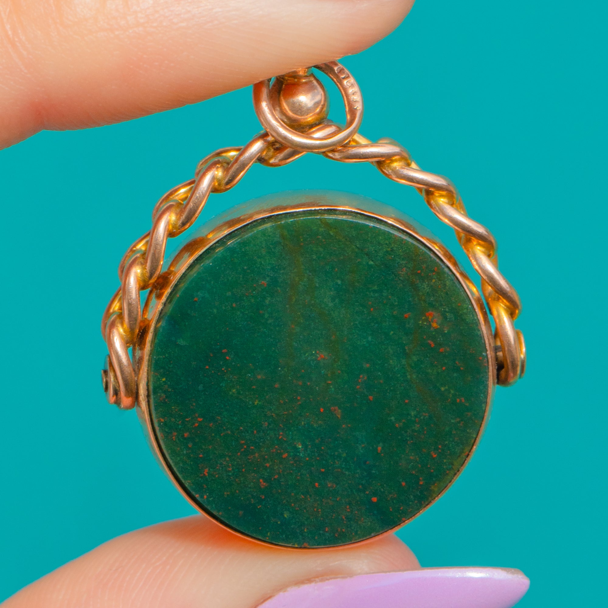 エレガントなEdwardian期のスピナーフォブ。9カラットゴールド製で、片面には深いグリーンに赤い斑点が美しいブラッドストーン、もう一方には艶やかなカーネリアンがセットされています。円形のジェムストーンはツイストロープのマウントとアーチ型のハンドルで縁取られ、ひとつの洗練されたジュエリーで二通りの表情をお楽しみいただけます。