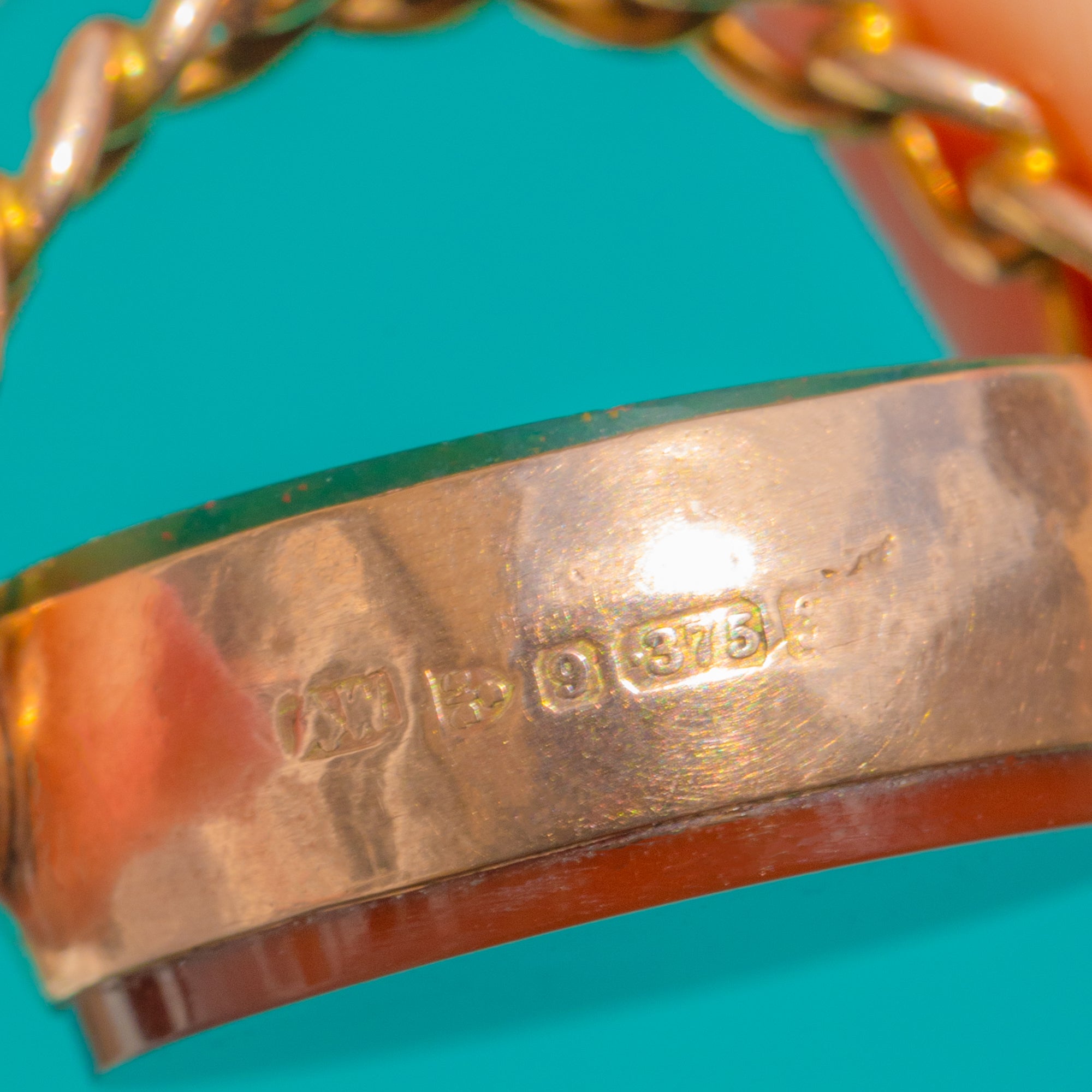 優美:ブラッドストーンとカーネリアンのカボションは、拡大してわずかな表面の擦れが見られるのみで、非常に良好な状態です。9カラットゴールドのマウントも、経年によるごく僅かなパティナとしっかりとしたセッティングを保ち、目立つ凹みや修復跡はありません。丁寧に保管されてきた、すぐにお使いいただける逸品です。