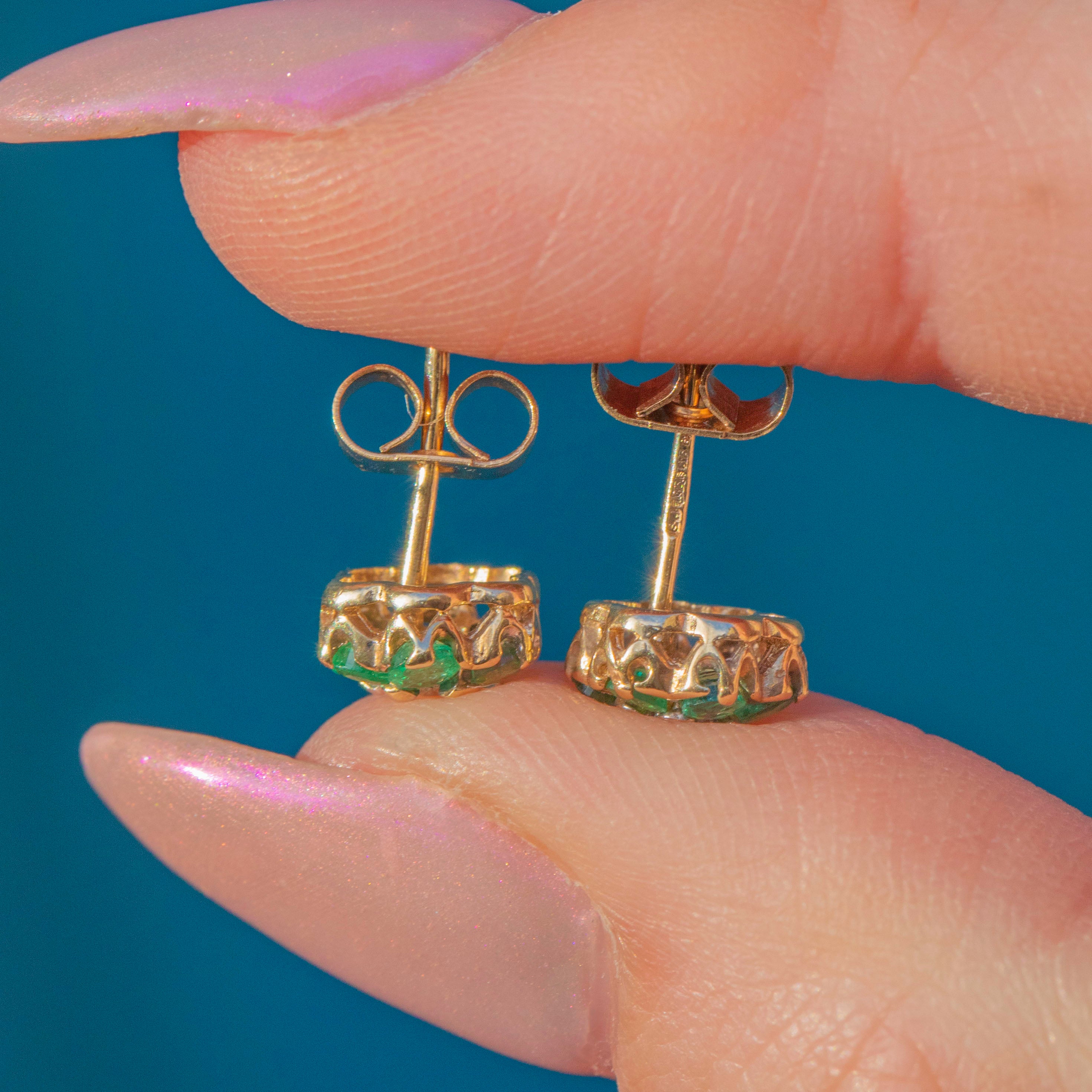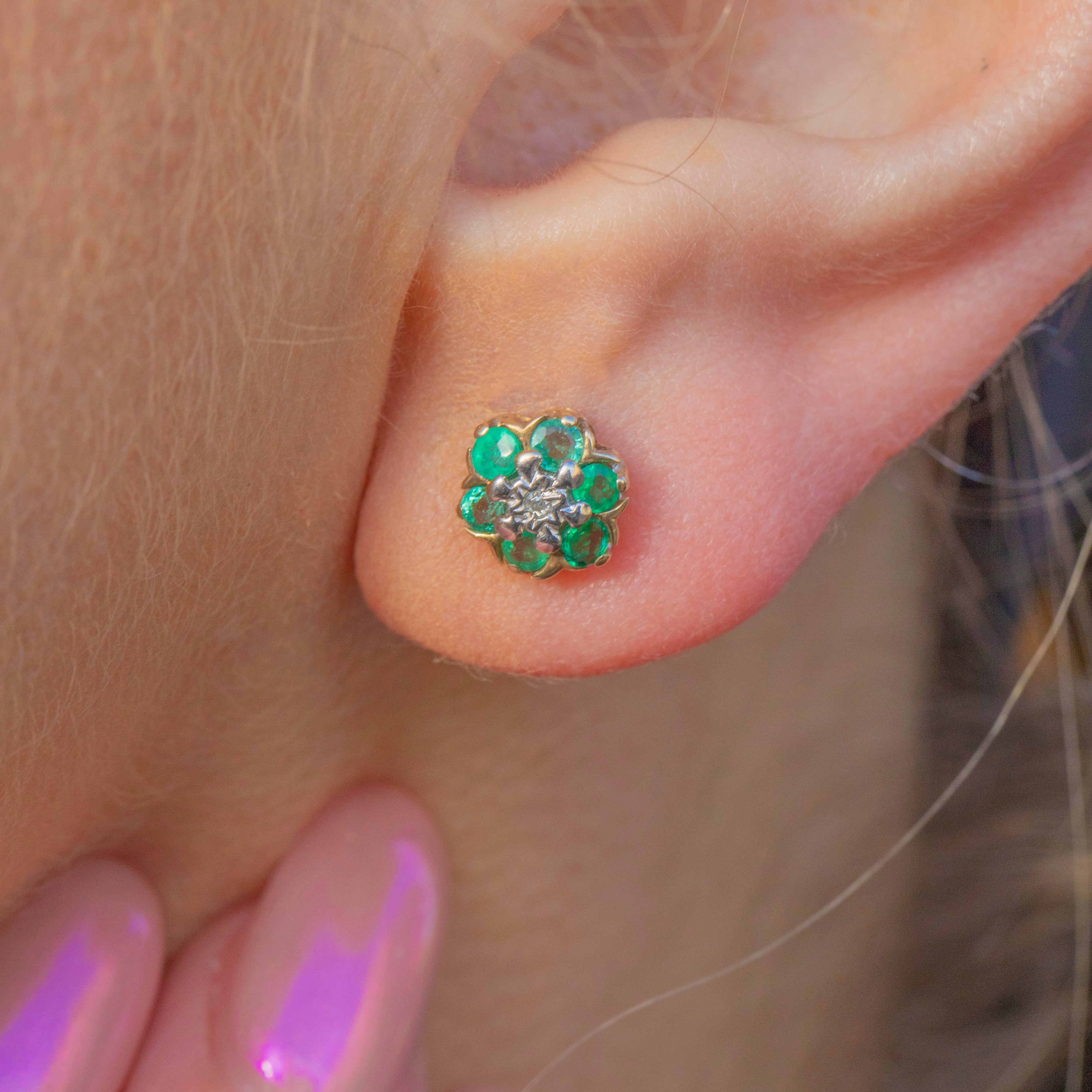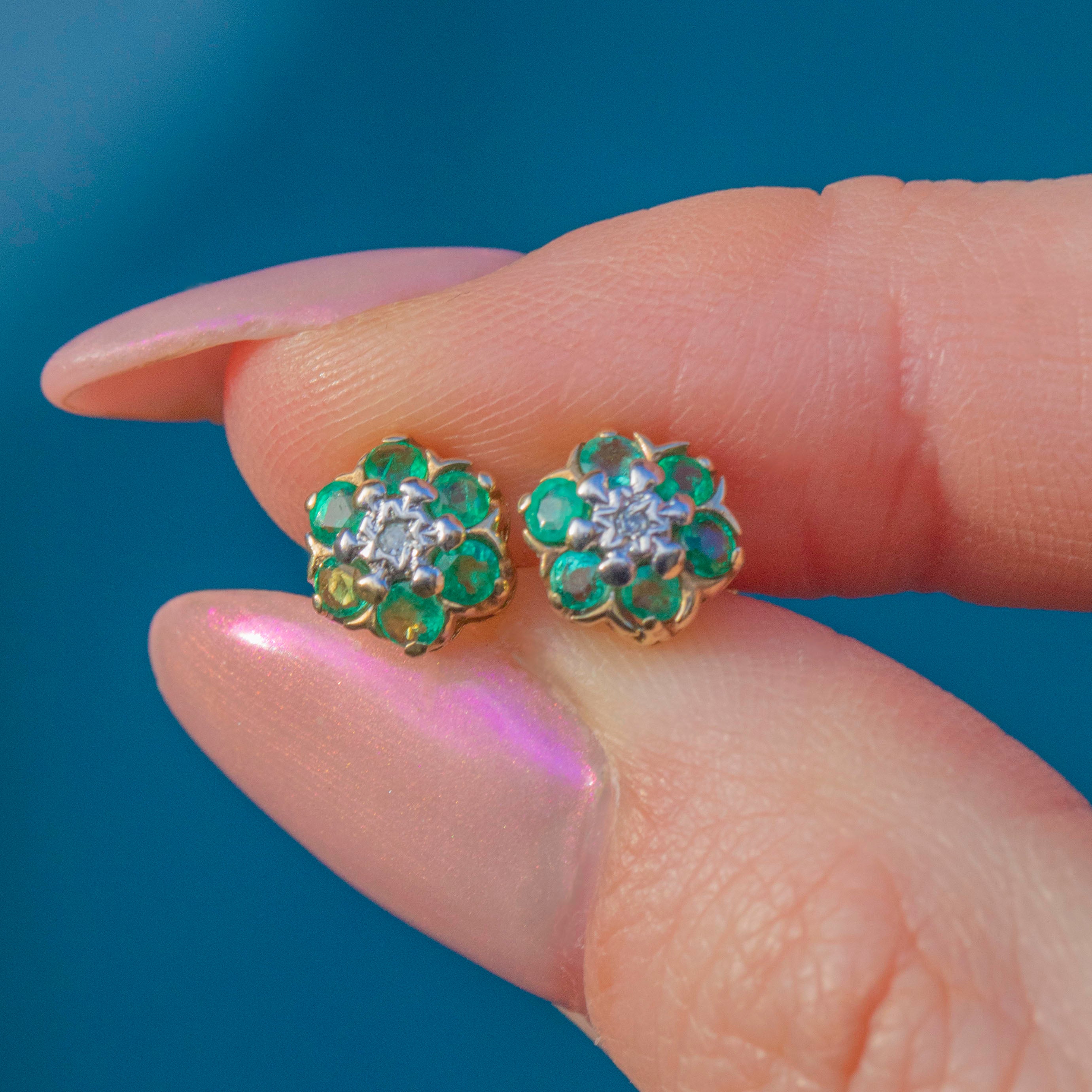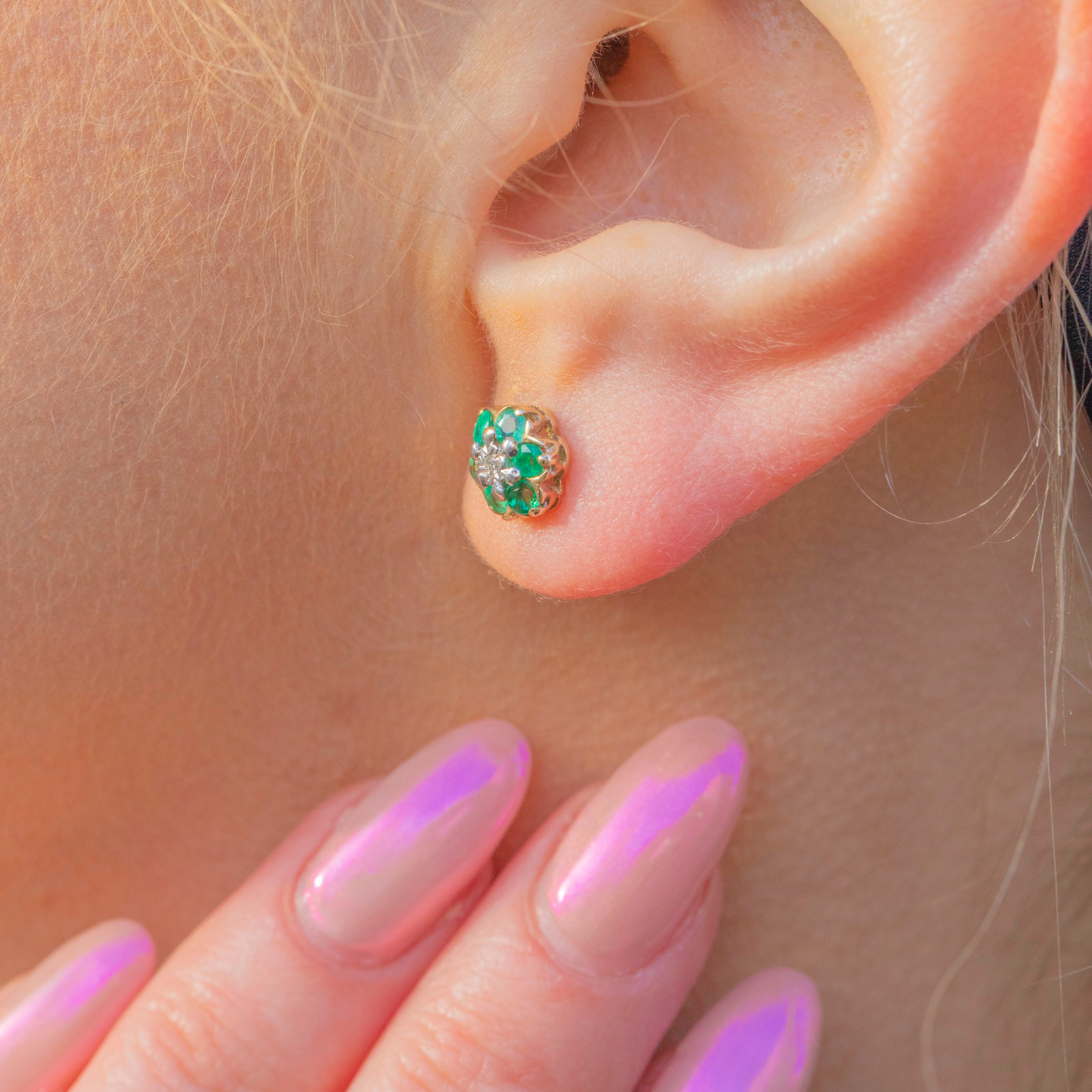 These charming vintage stud earrings feature a cluster of vibrant green Emeralds, arranged as a halo of petals around a twinkling central Diamond, creating a gorgeous floral motif.