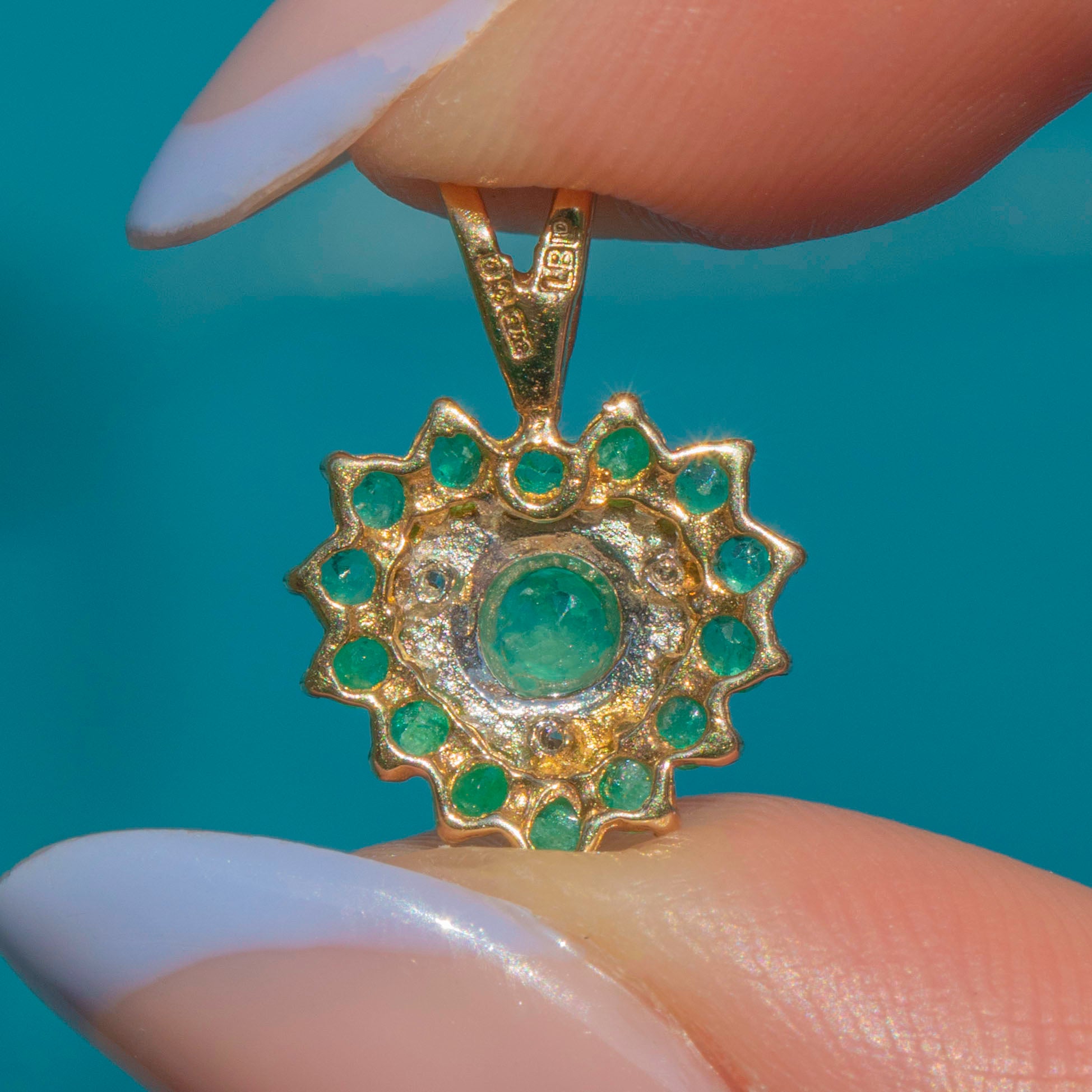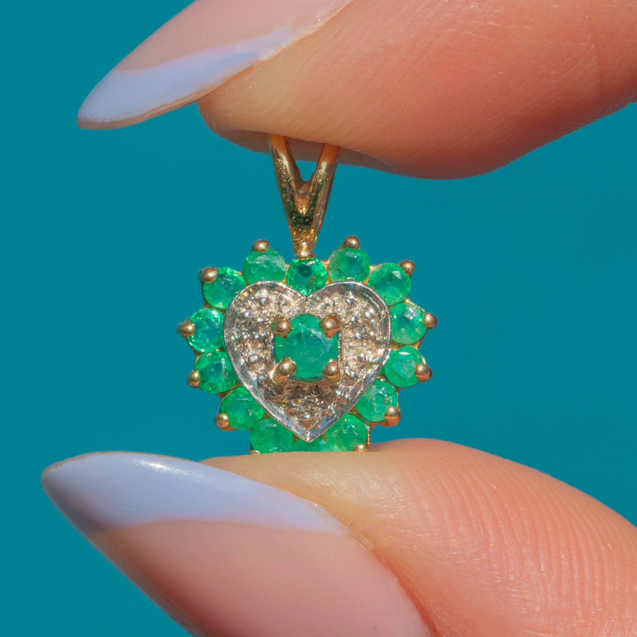 VERY GOOD-EXCELLENT: This 9ct Gold Emerald Diamond heart charm is in wonderful condition. The Gold is buttery and glossy, holding each gemstone securely in place. The Emeralds have a vibrant grass-green hue, with only mild surface wear visible under close inspection. The Diamonds are bright, adding a welcome scintillation, free from chips or abrasions. Complete with a robust bale, you can wear this vintage Emerald Diamond pendant with absolute confidence!