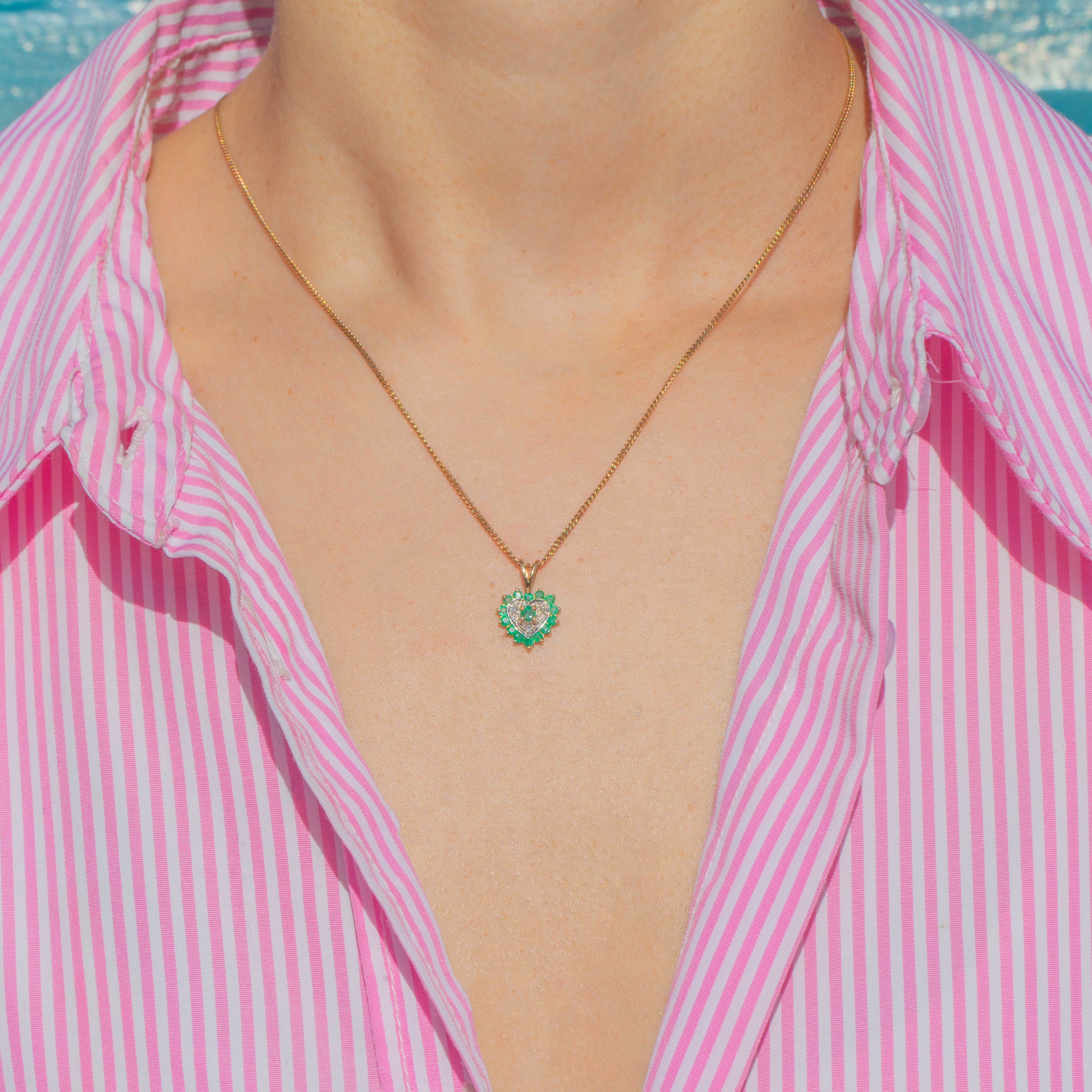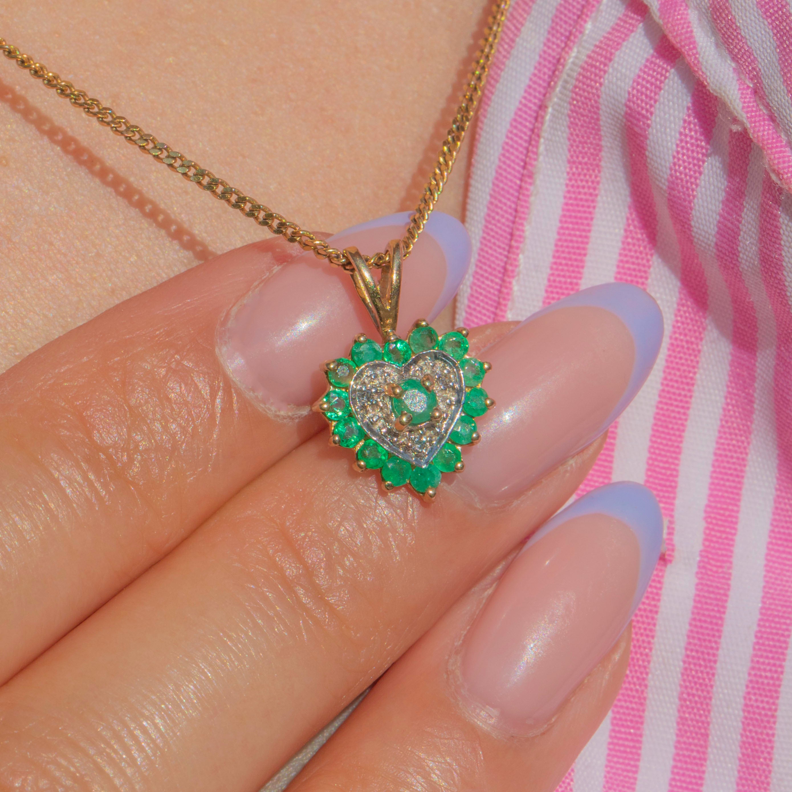 Elegant and stylish, the Emeralds are accompanied by twinkling Diamonds, all set in buttery 9ct Gold, making this the most luxurious vintage heart pendant!