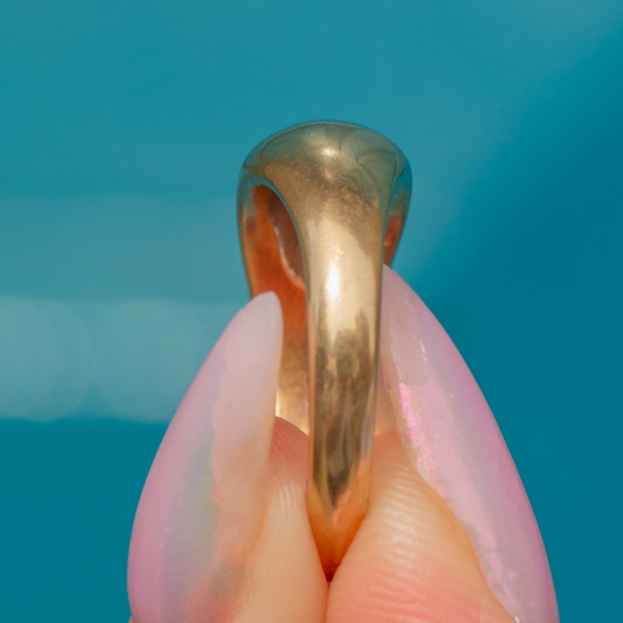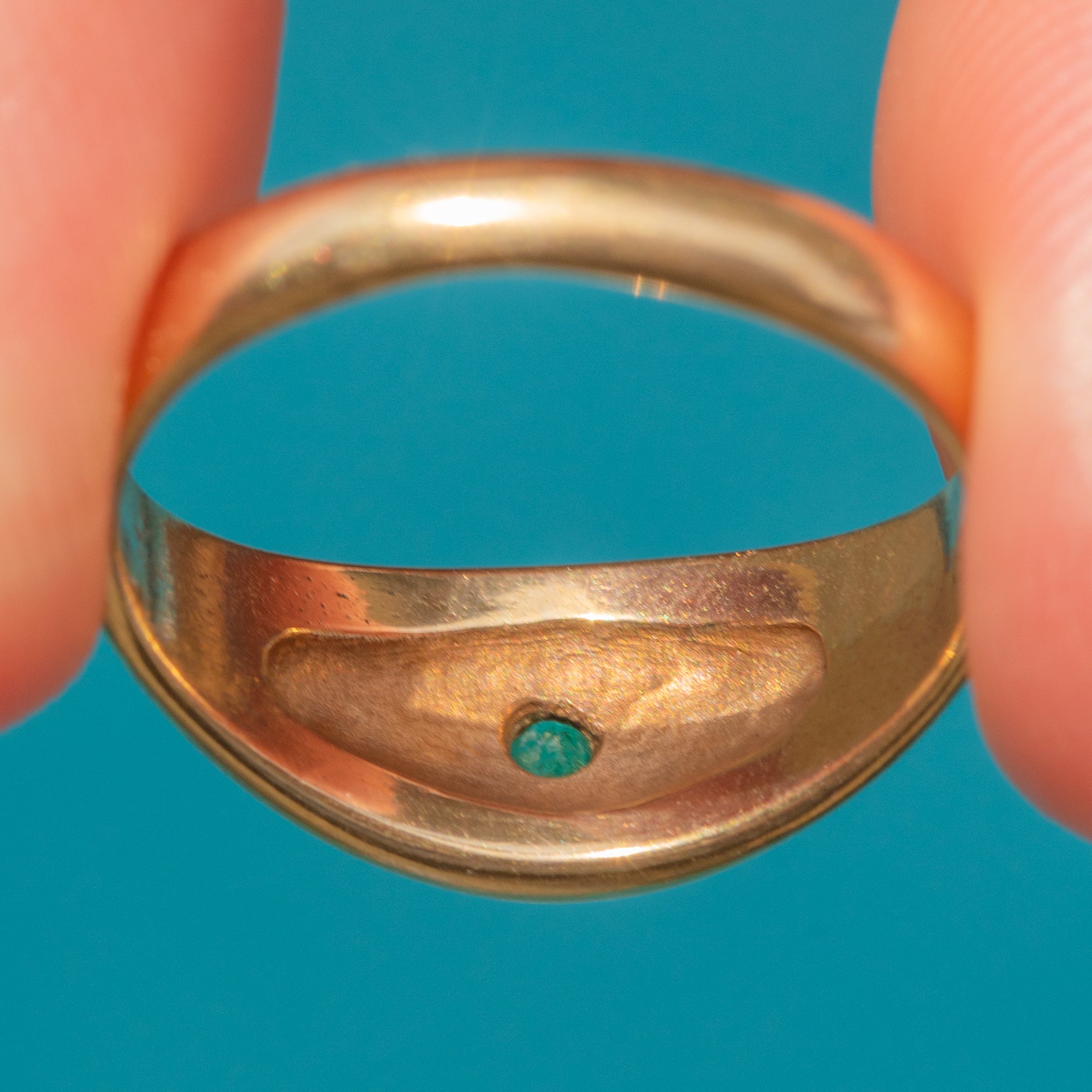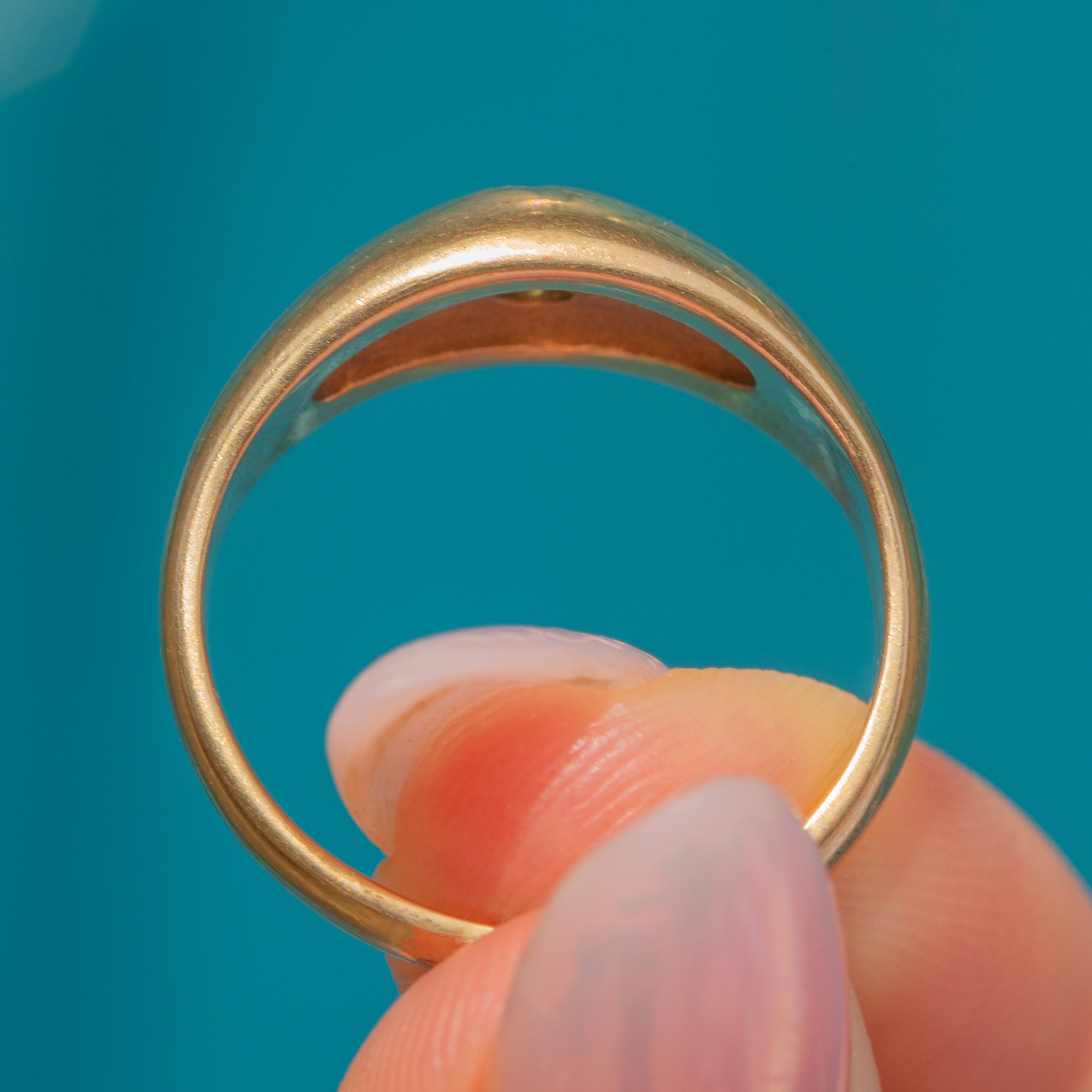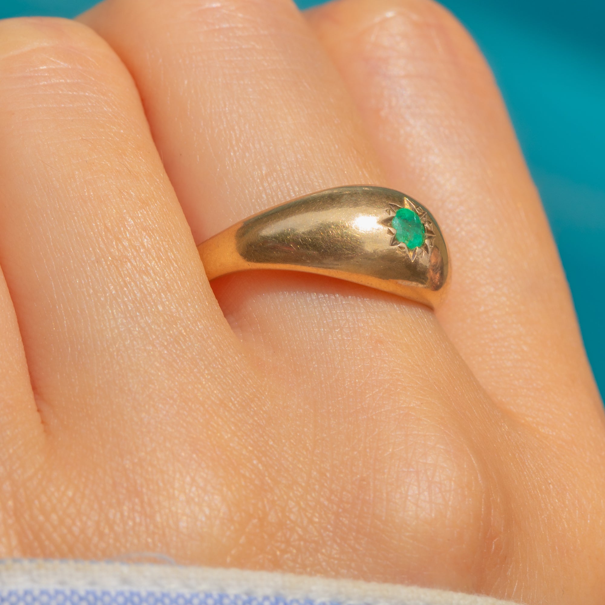 With a full set of English hallmarks dating to 1846 and exuding celestial charm, this gorgeous antique Emerald gypsy ring will make a luxurious addition to your collection!