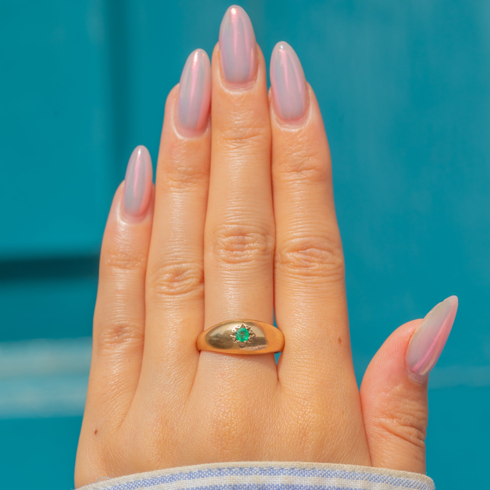 This sumptuous Victorian gypsy ring is crafted from buttery 9ct Gold and displays a fresh minty green star set Emerald across its band, with its chubby form giving you fabulous finger coverage.
