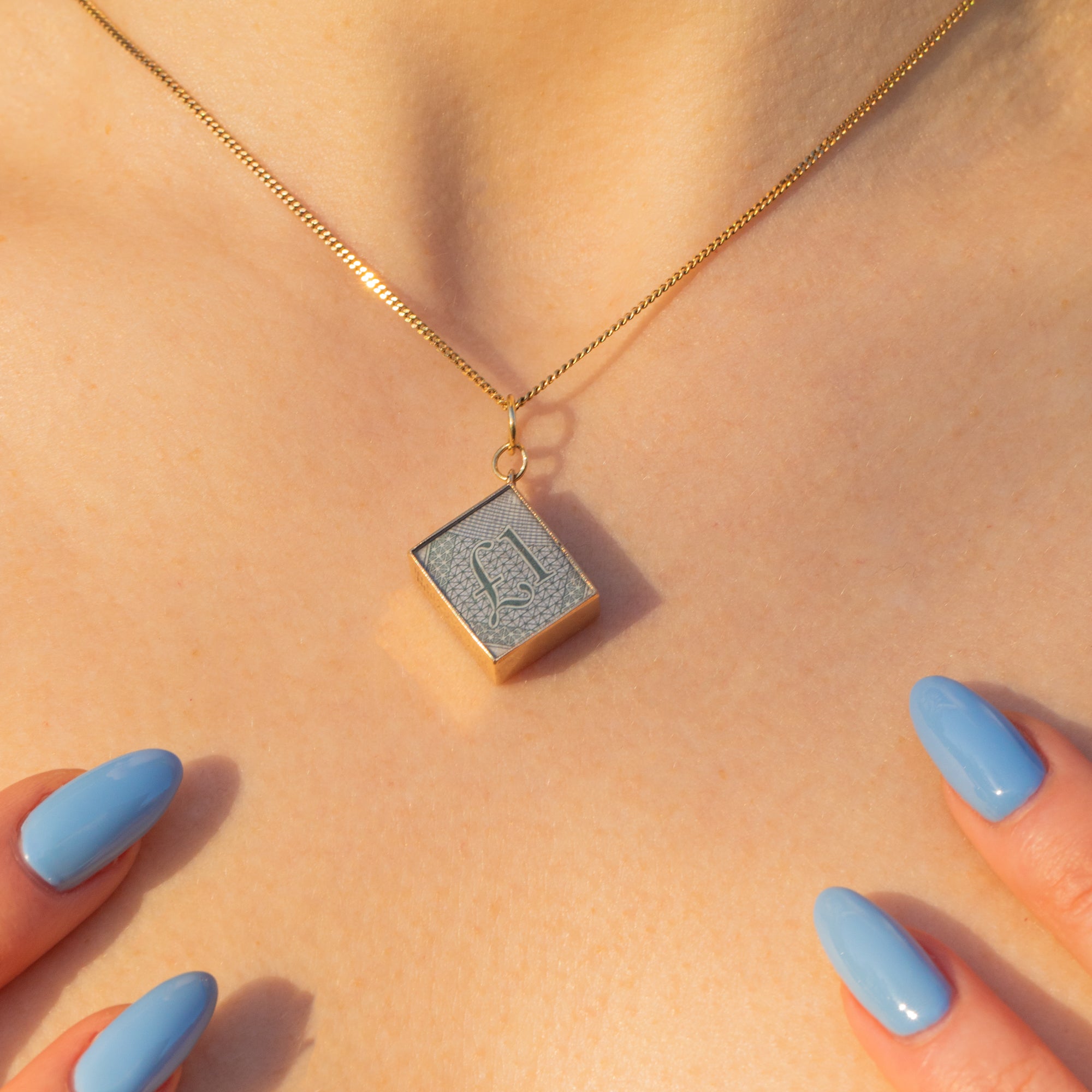 EXCELLENT. This 9ct Gold emergency one pound note charm is in fabulous condition! The 9ct Gold is buttery throughout and has kept its rectangular form well. With a jump ring soldered onto her corner, she hangs at a slight angle, which we think is super cute! A wonderful vintage charm packed with historic value!