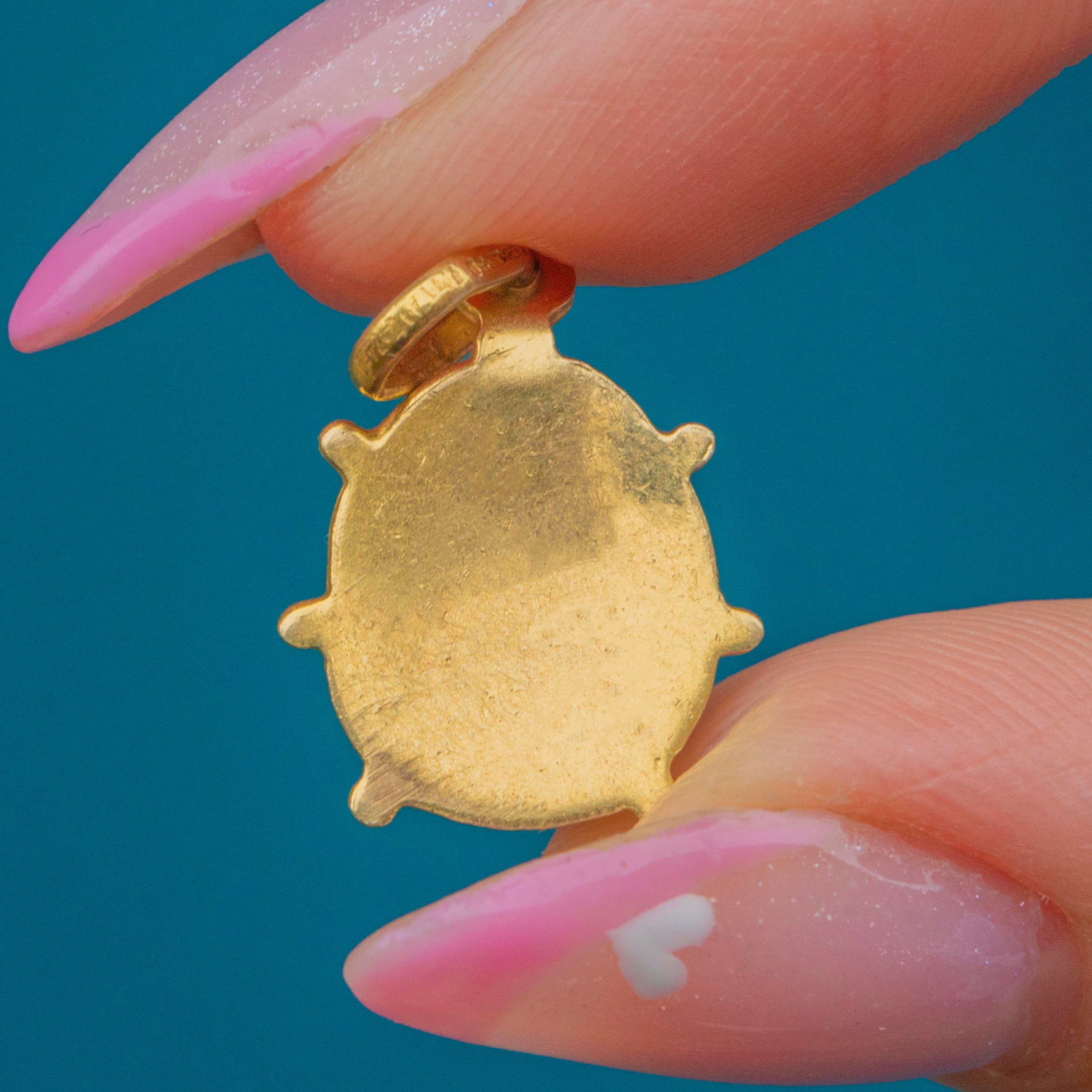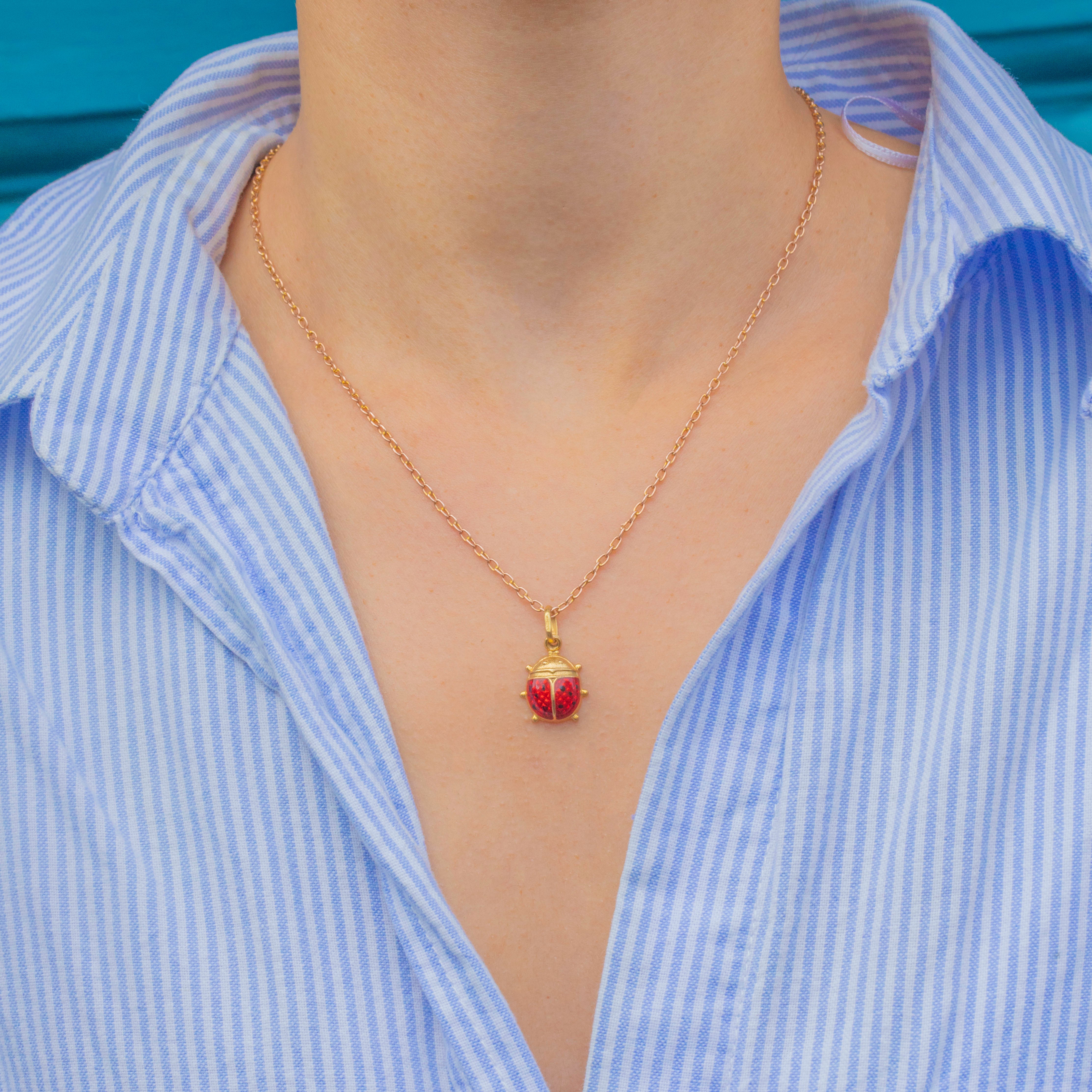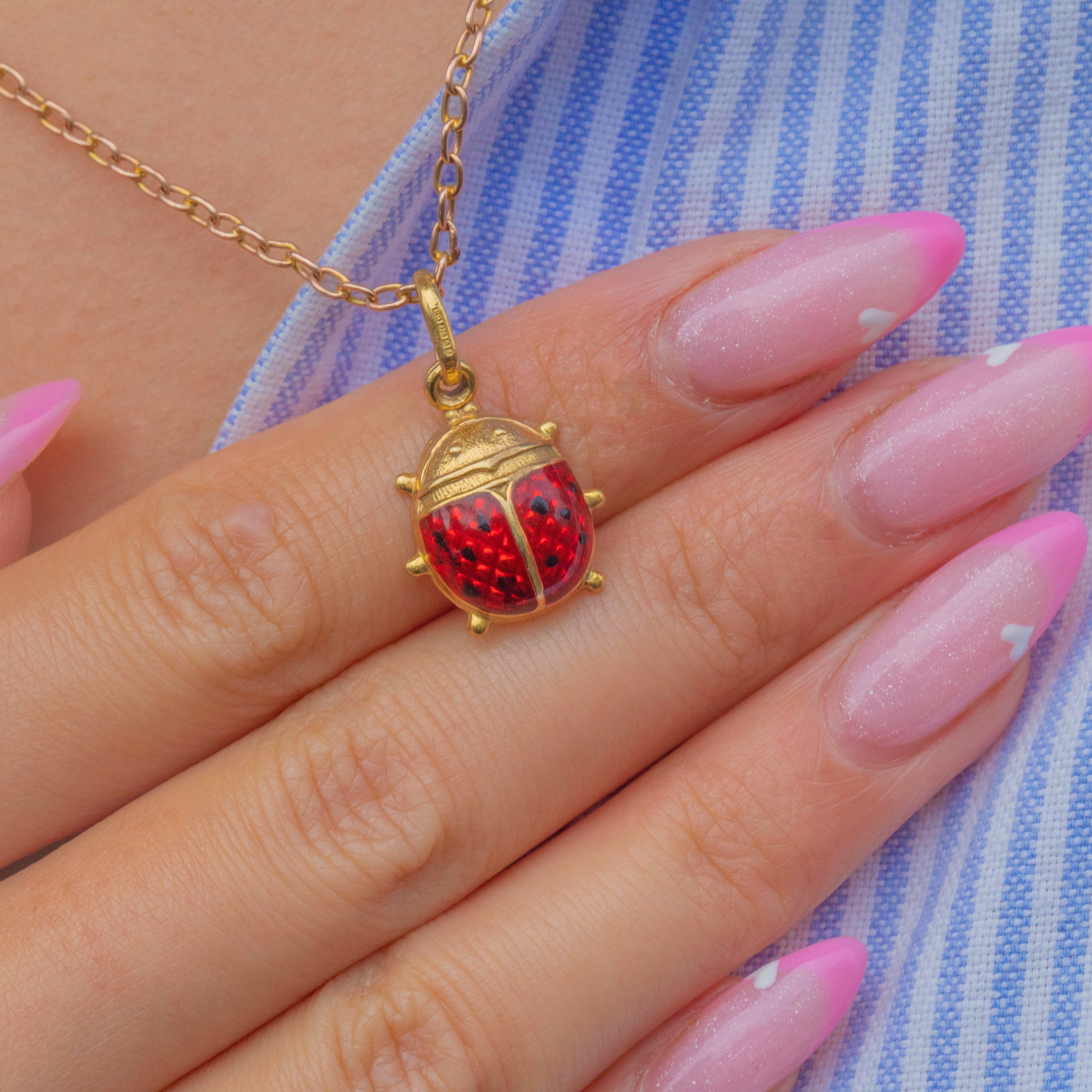 A charming Vintage 9ct Gold ladybird charm, enamelled in vibrant red and black for a lifelike finish. The design captures the beloved little insect in exquisite detail, with glossy iridescent enamel and a warm Gold body that gleams beautifully in the light.