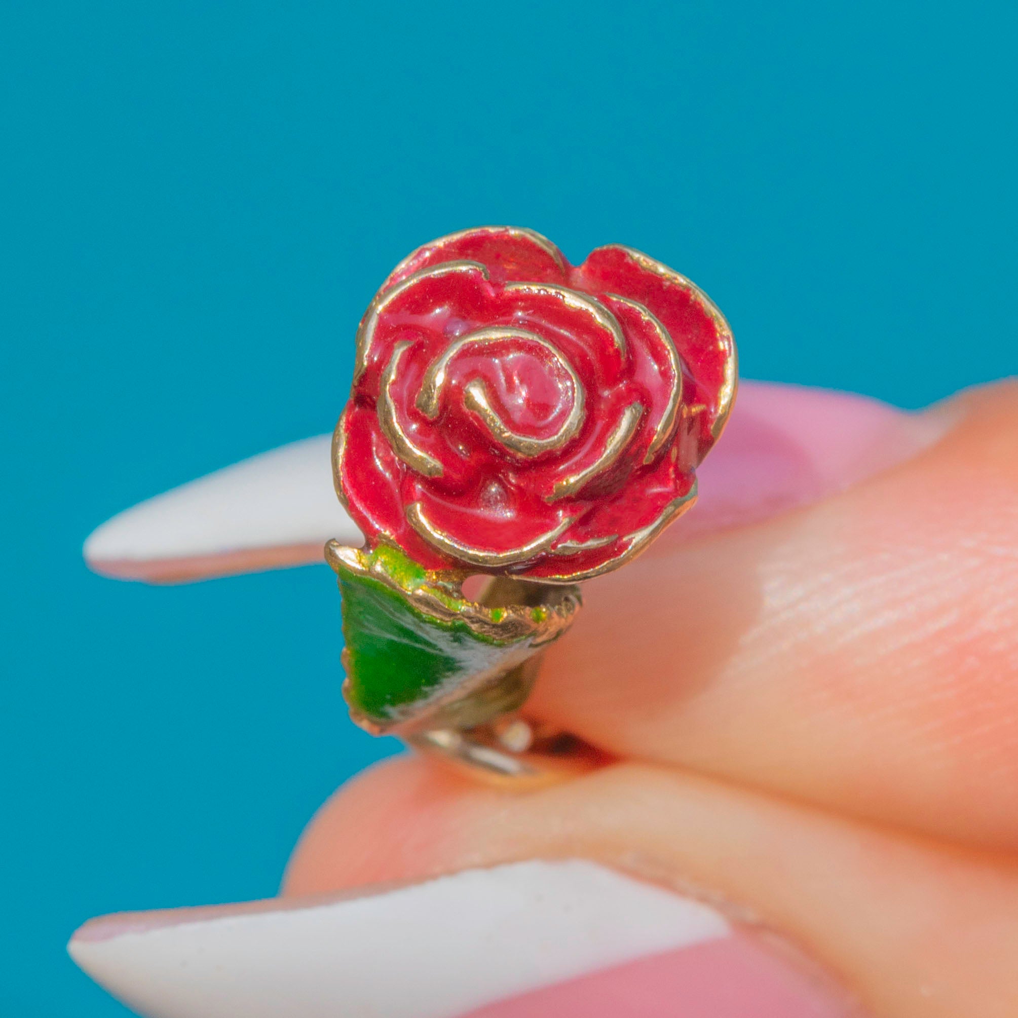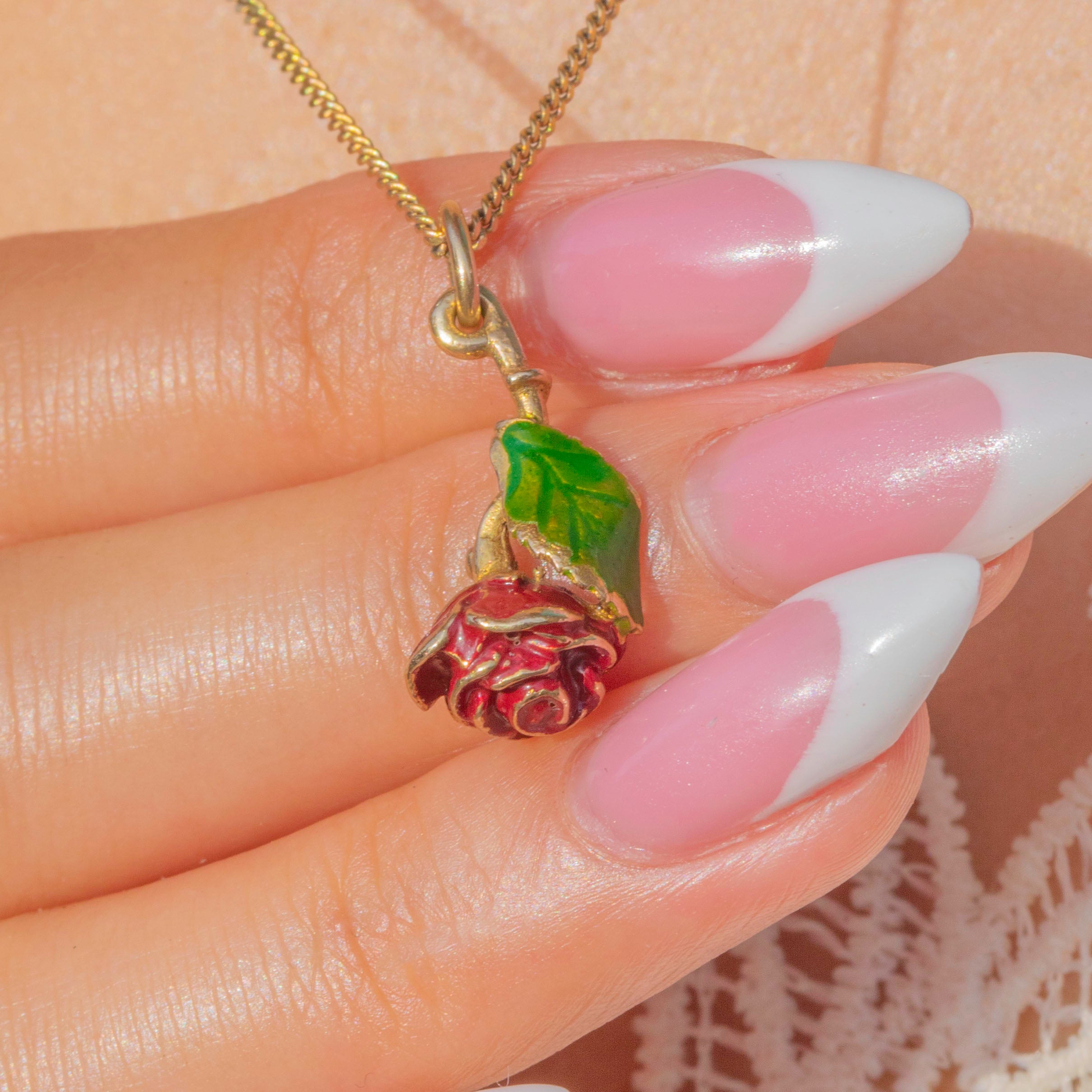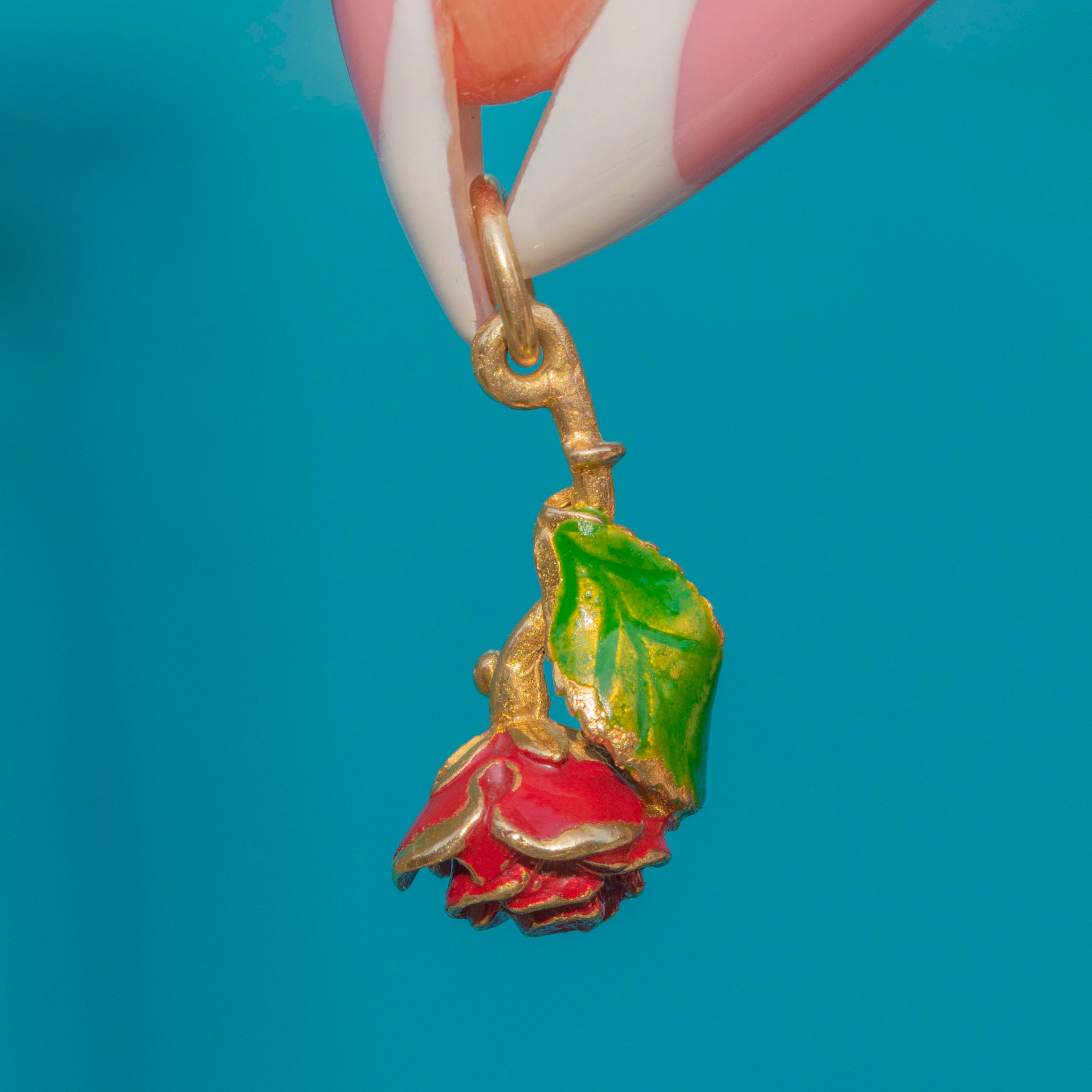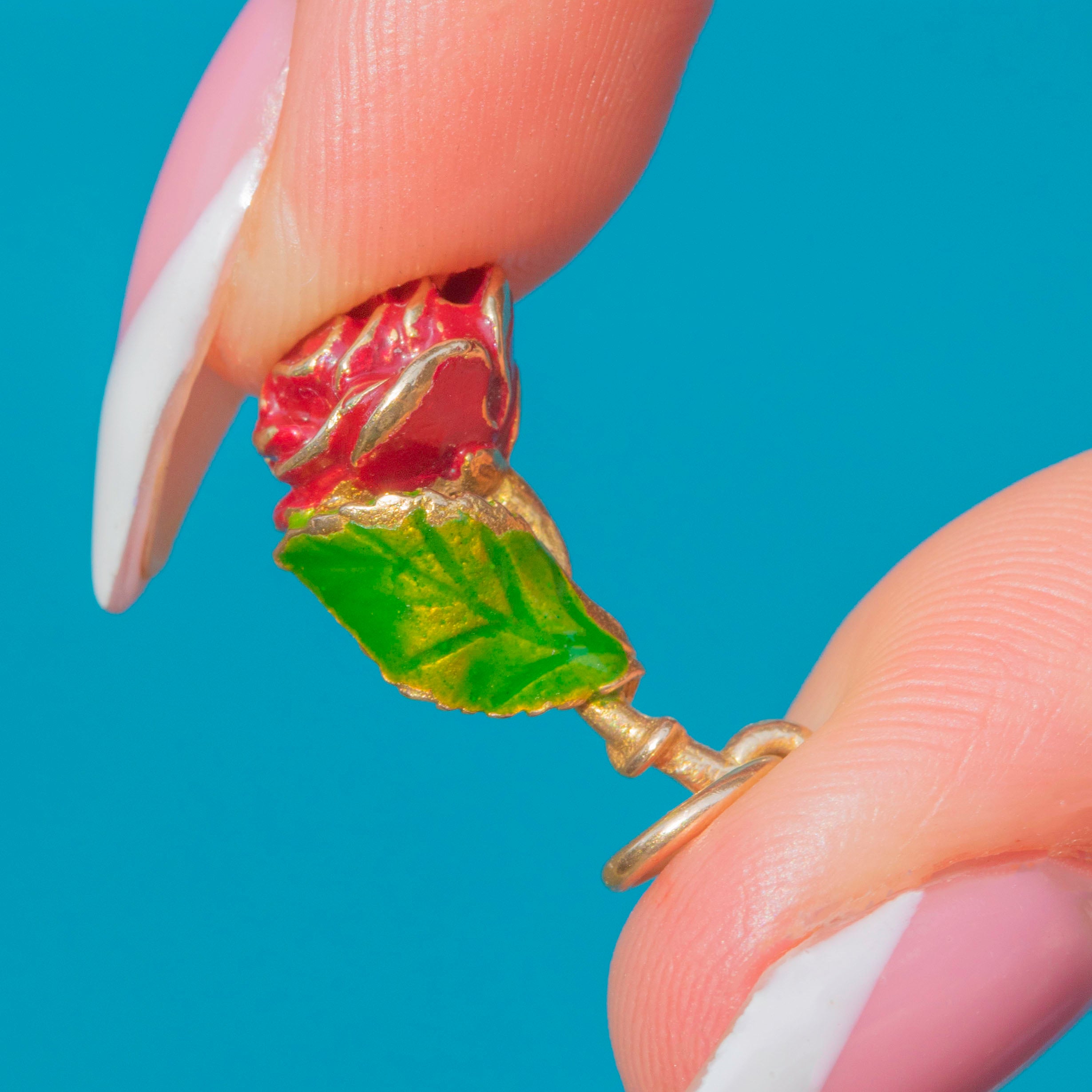 This beautiful Vintage charm captures the timeless beauty of a single red rose, crafted in 9ct Gold and adorned with vibrant red and green enamel.