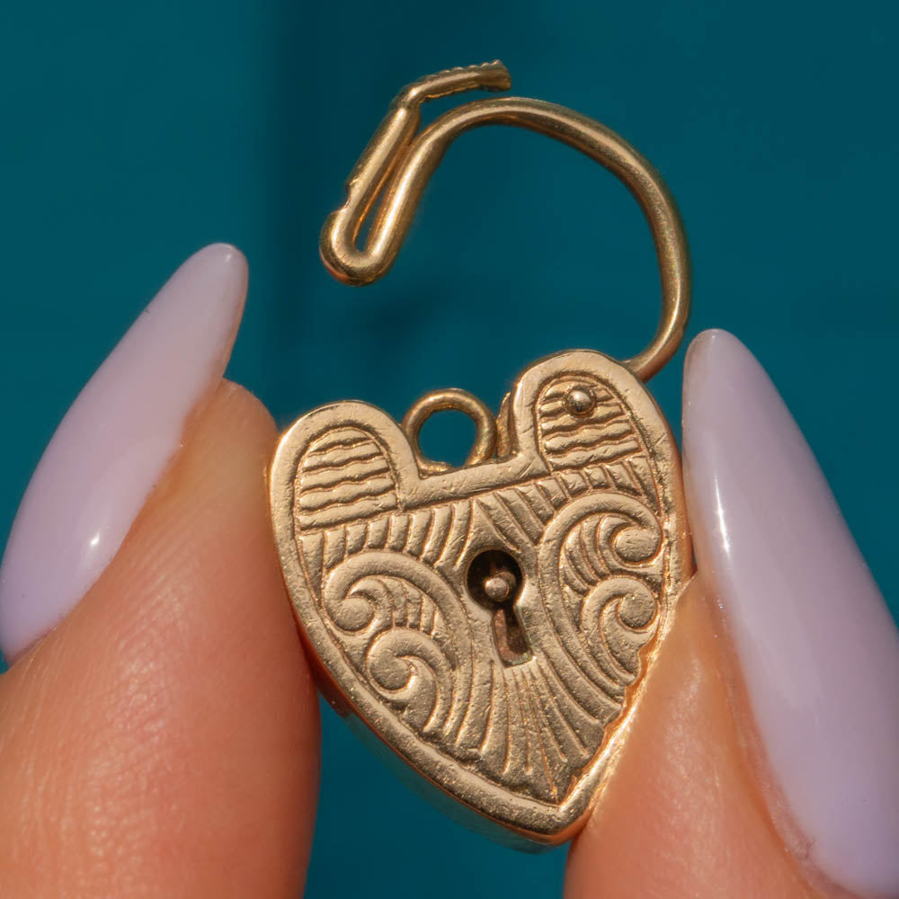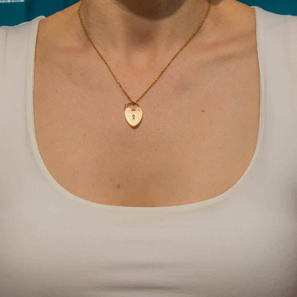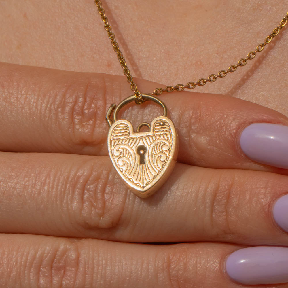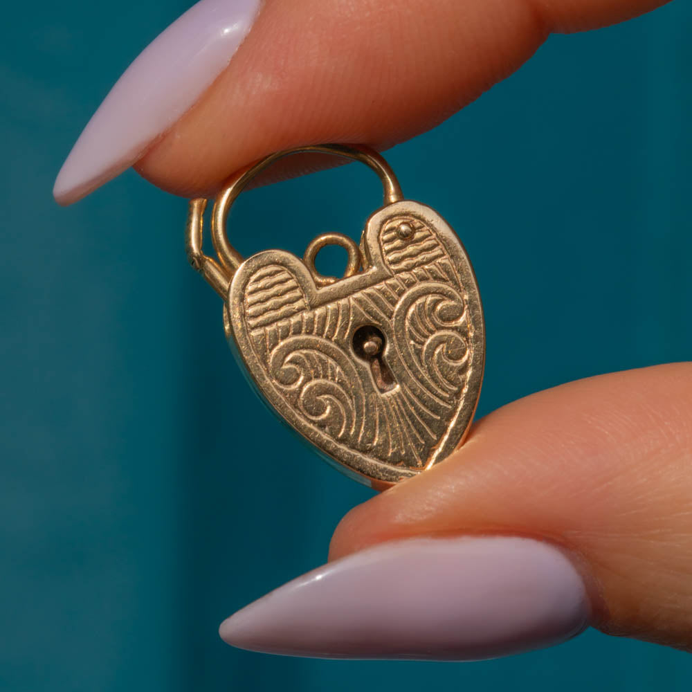This 9ct Gold engraved heart padlock charm is a beautiful solid Gold pendant. You will instantly fall in love with the unique decorative engravings, giving this piece a unique and striking finish.