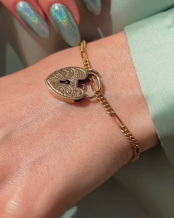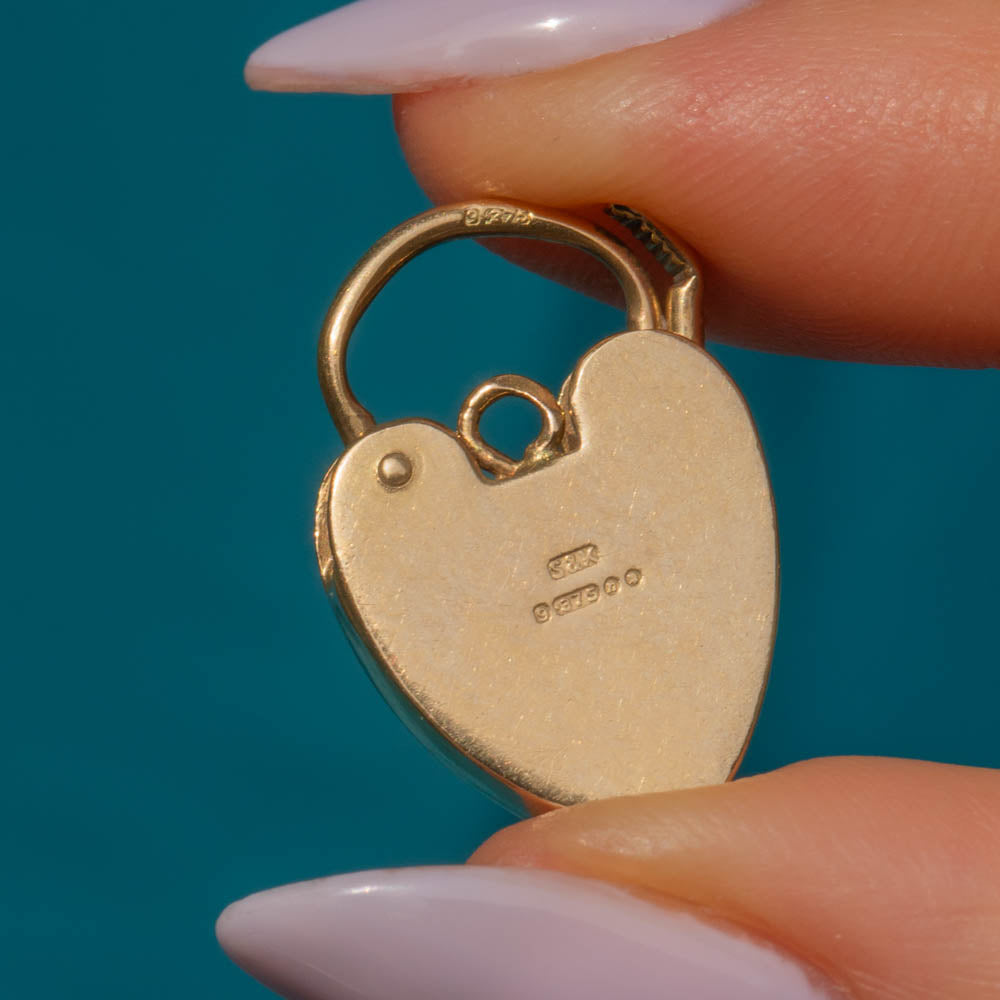 EXCELLENT. This 9ct Gold engraved heart padlock is in superb condition. All of the engravings are crisp, the shape of the padlock has kept well and the clasp is in perfect working order. This pendant has survived over 50 years of wear, and we are confident that she can endure another 50 or more!
