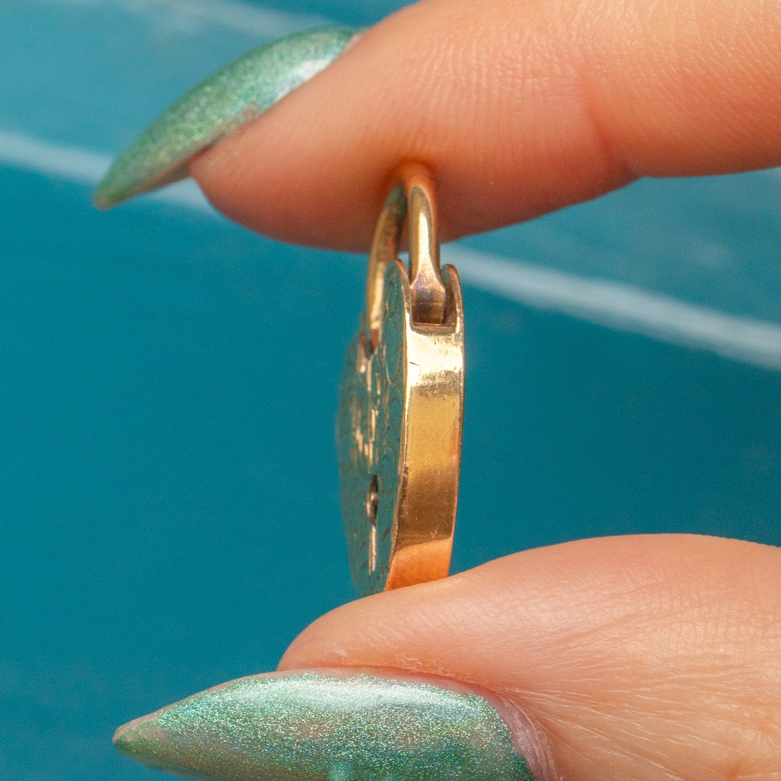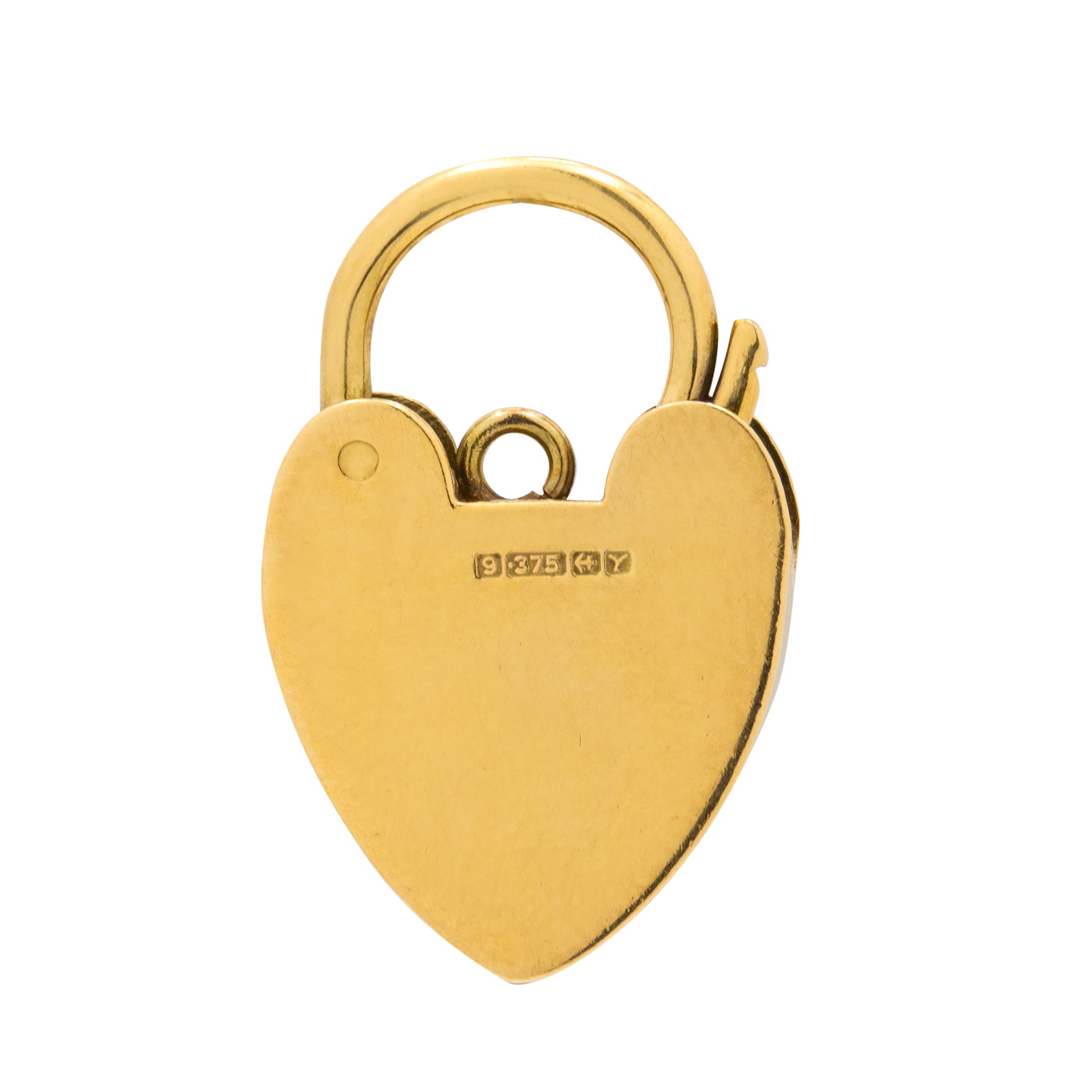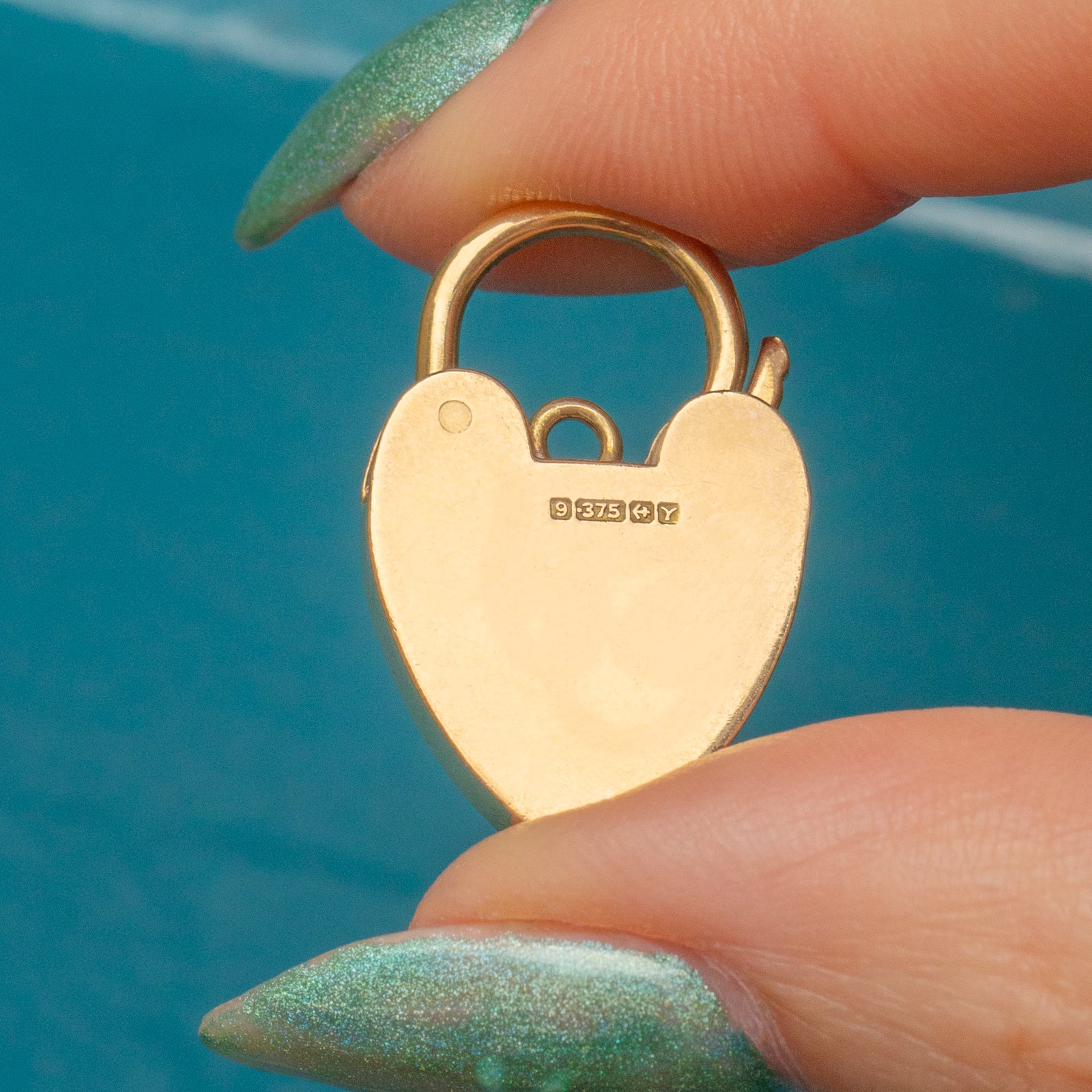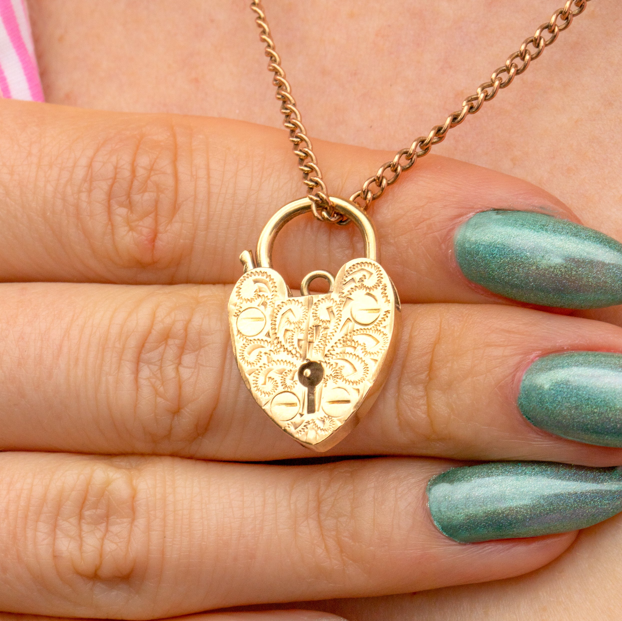EXCELLENT. We are pleased to offer this 9ct Gold engraved heart padlock pendant in excellent condition! The Gold is buttery throughout and the engraved details have all remained crisp. The back of the pendant is smooth and free from dings or scratches. With a fully functioning clasp, you can wear this solid gold padlock with absolute confidence!