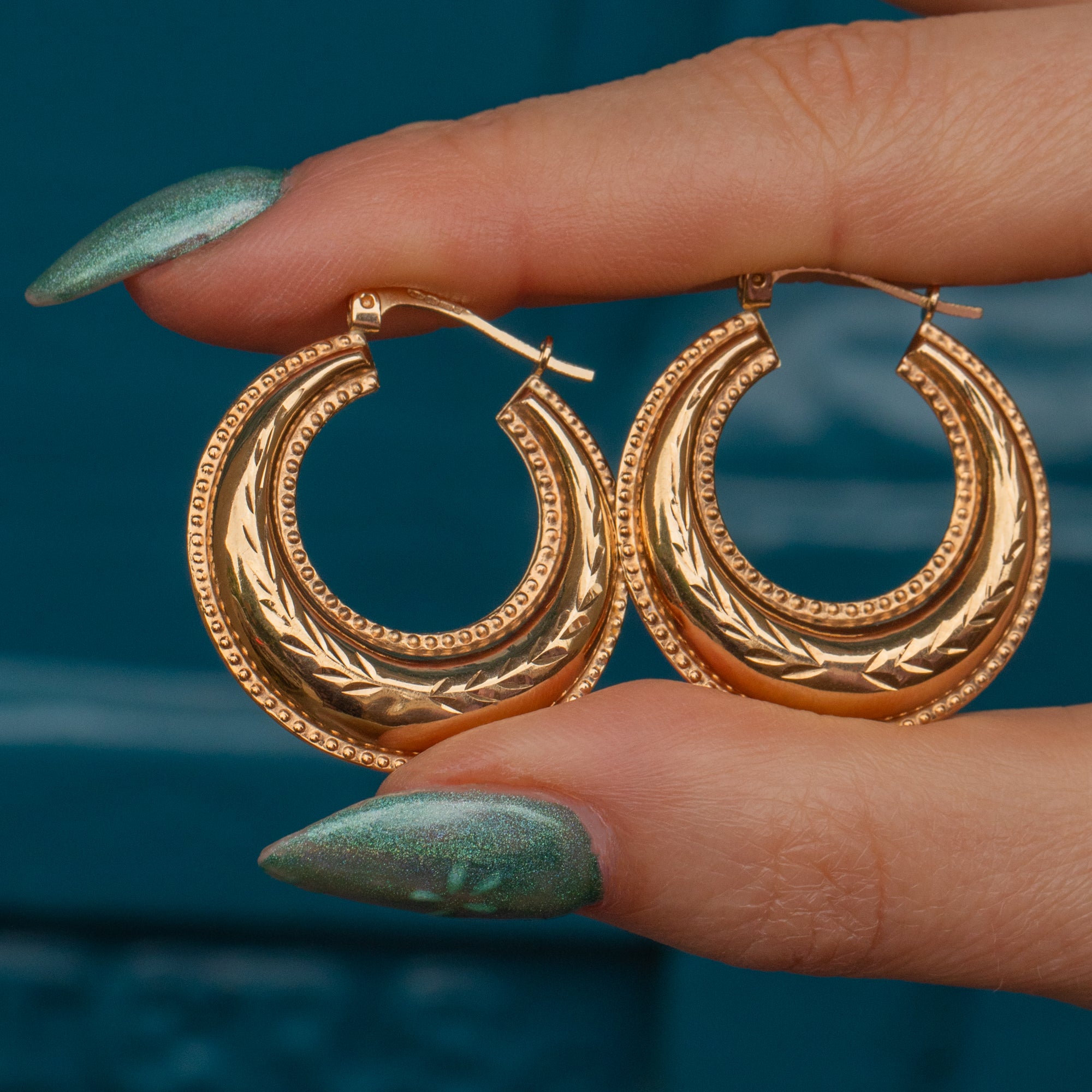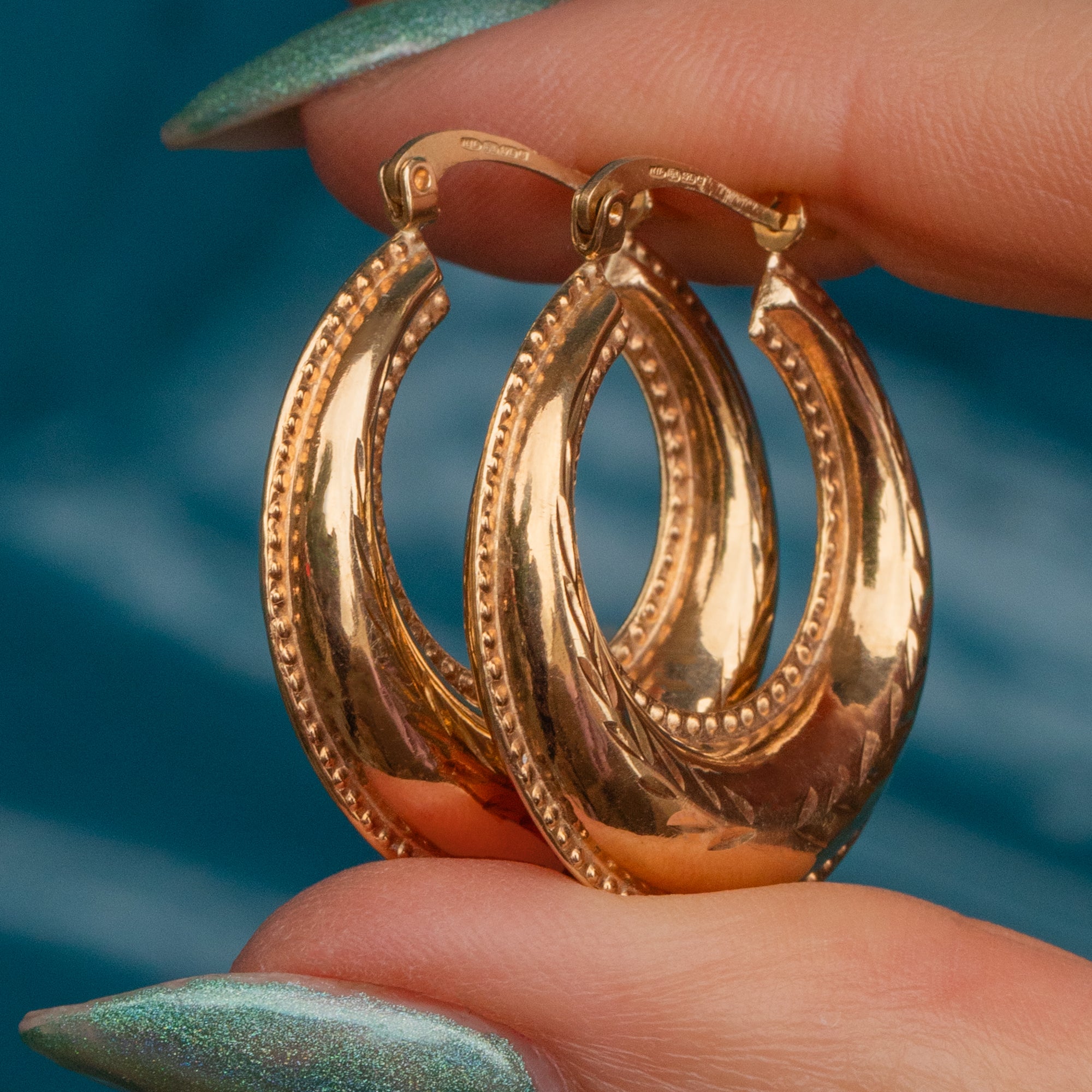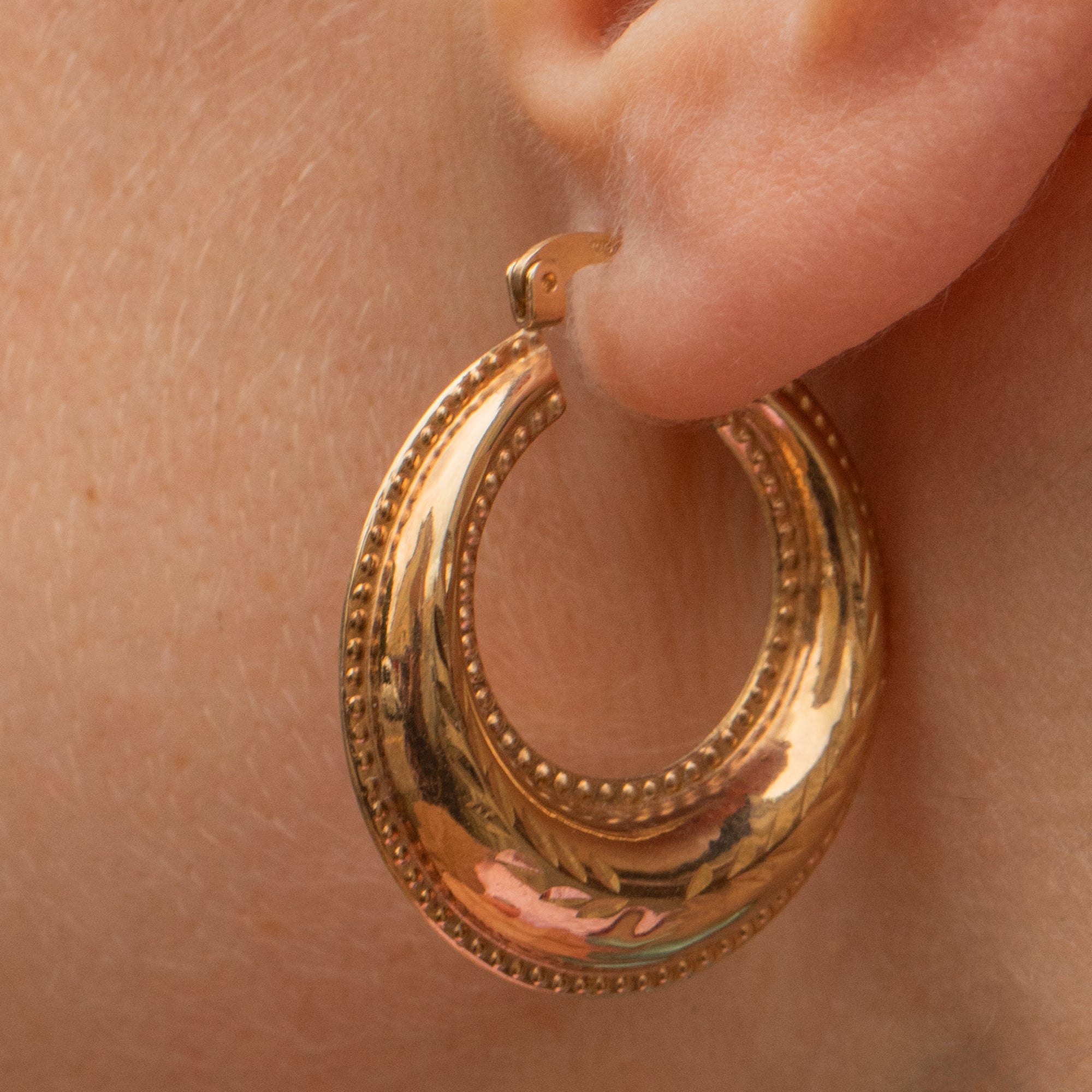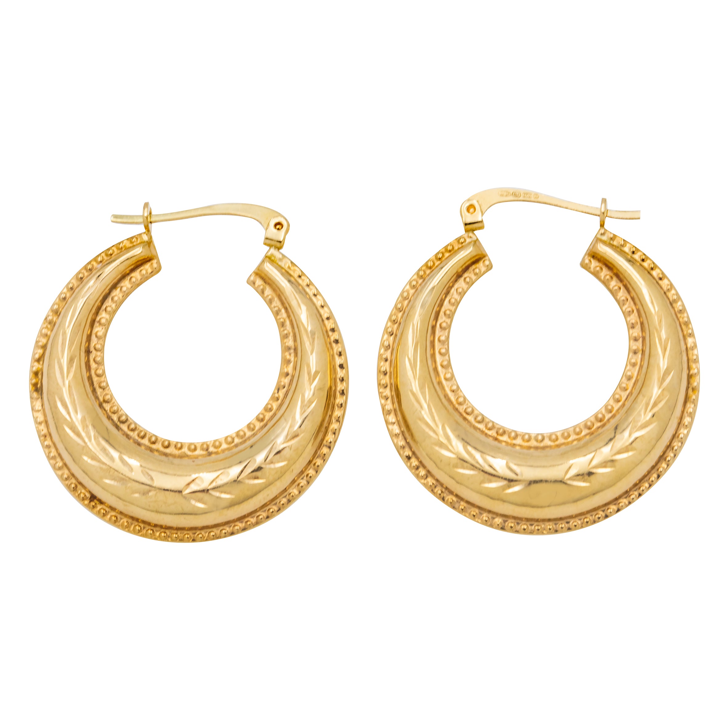 If you have a penchant for all things Gold and glossy, these 9ct Gold engraved hoop earrings were made for you! Their puffy form is crafted from splendorous 9ct Gold, displaying wreath like engravings through the centre and sealed with a beaded edge detail.