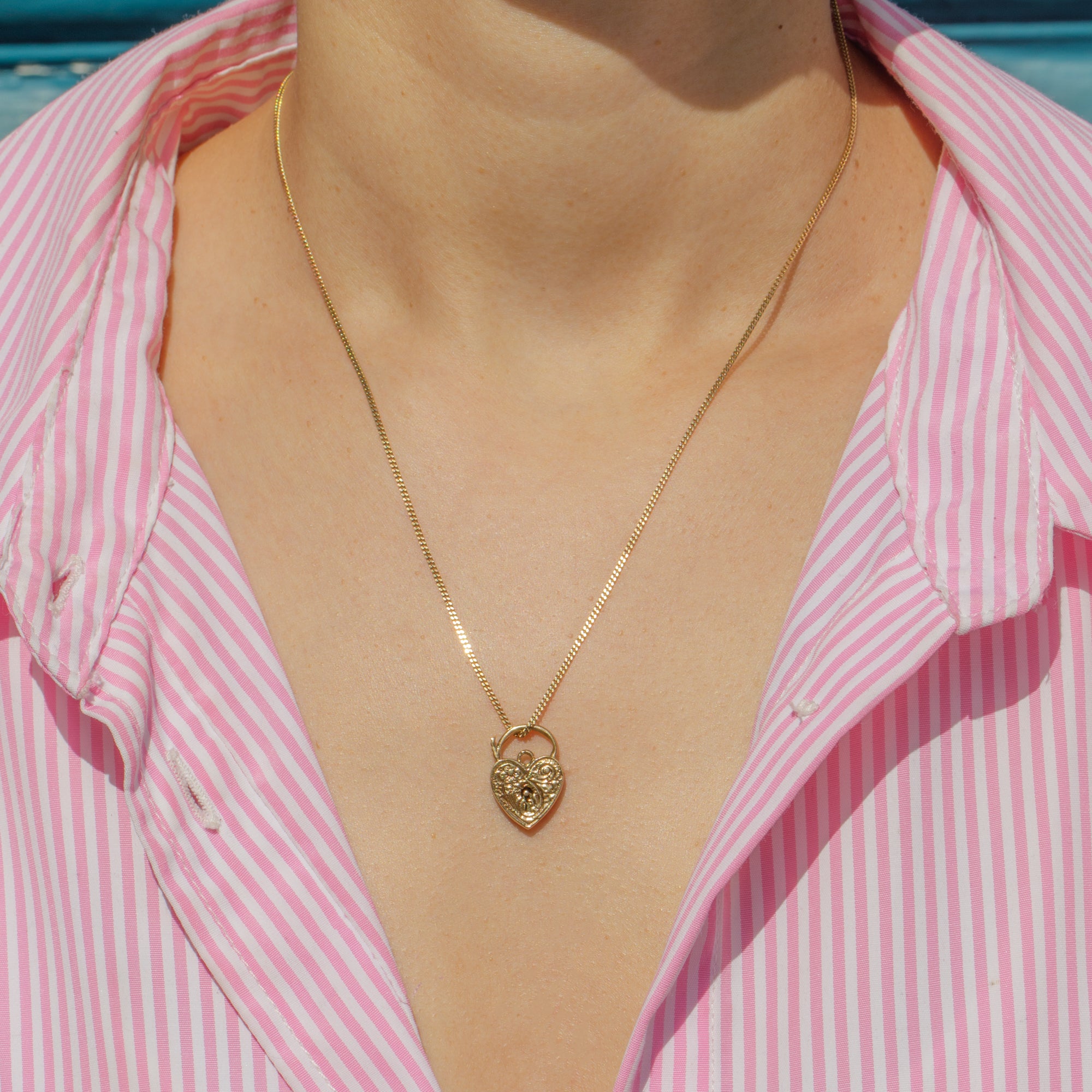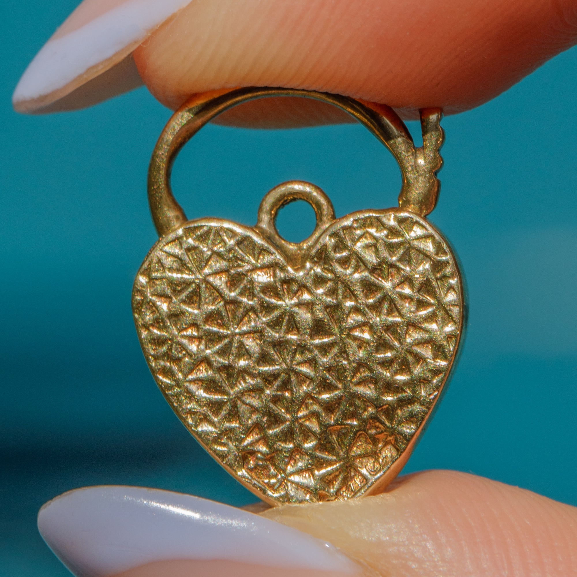 VERY GOOD: This 9ct Gold engraved mini heart padlock pendant is in very good condition. The Gold is radiant and the engraved details are crisp. There are some general signs of age-related wear and a ding on the back, but these are difficult to spot amongst the exquisite details. The lever mechanism is in perfect working condition, so you can enjoy styling and wearing this Gold padlock pendant with utmost confidence!
