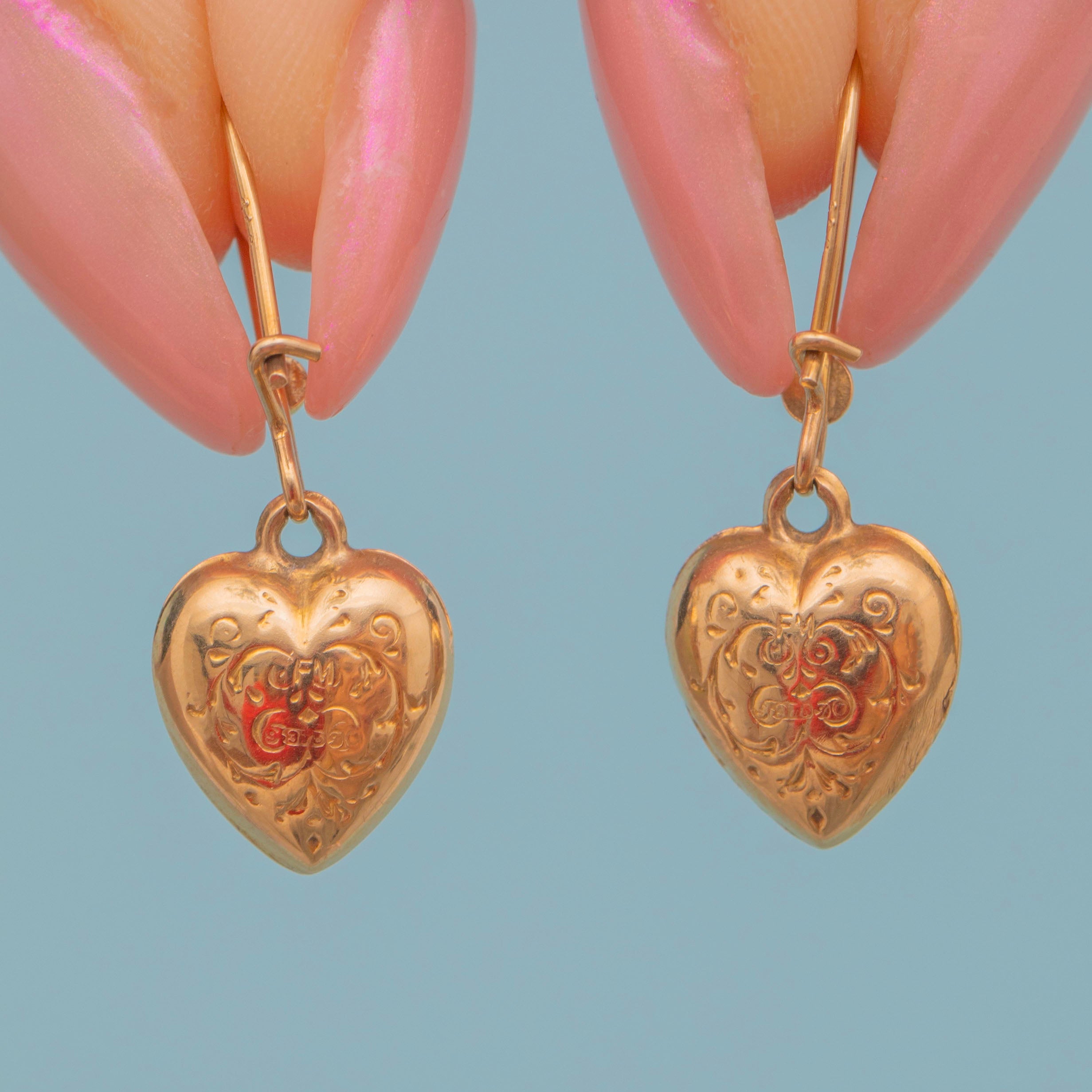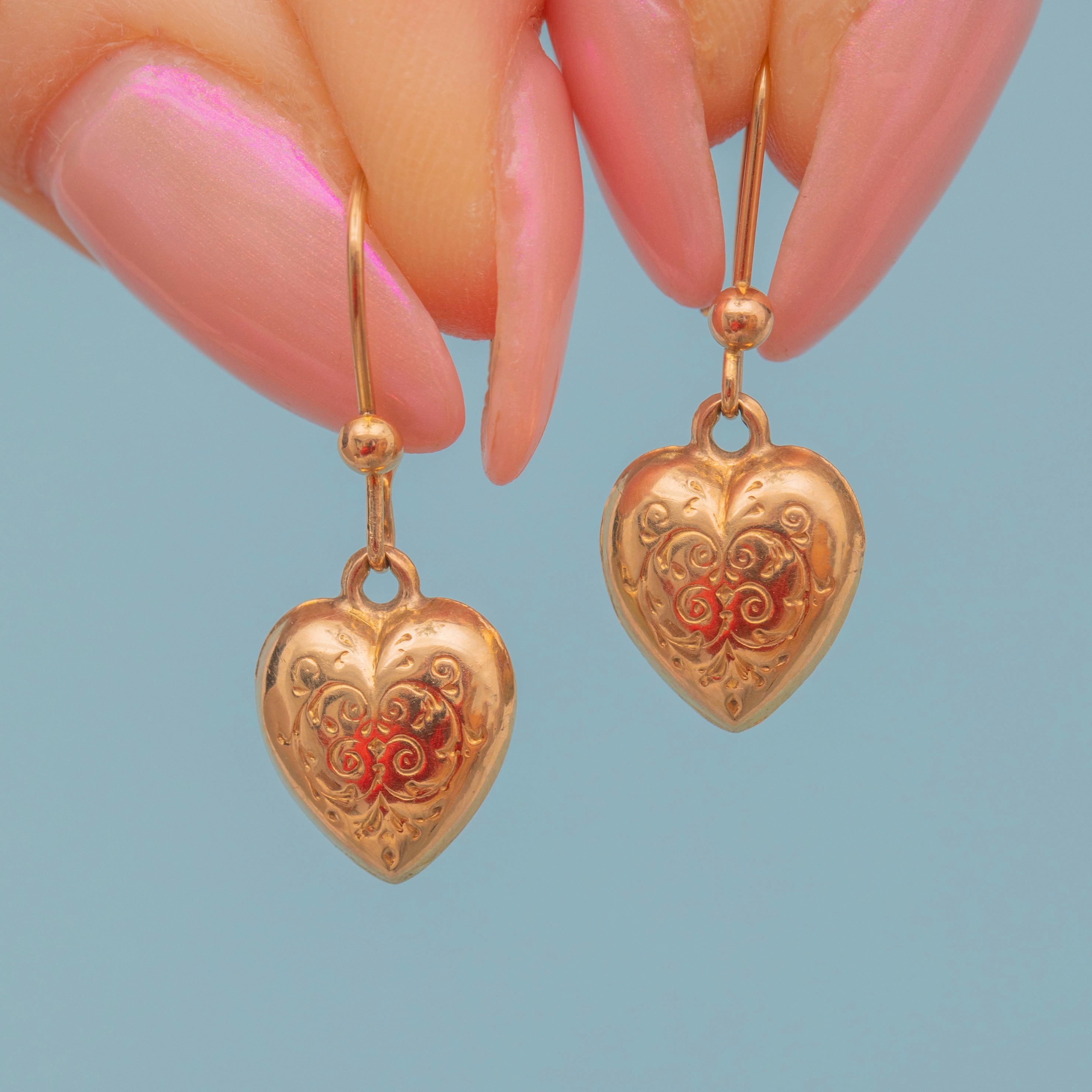 EXCELLENT: These 9ct Gold puffy heart earrings are in excellent condition. The 9ct Gold is warm and radiant, with crisp and clear engravings. Hallmarks are present on the back, dating these Mid-Century heart earrings to 1980. Totally irresistible, we have fallen in love with these Vintage heart earrings!