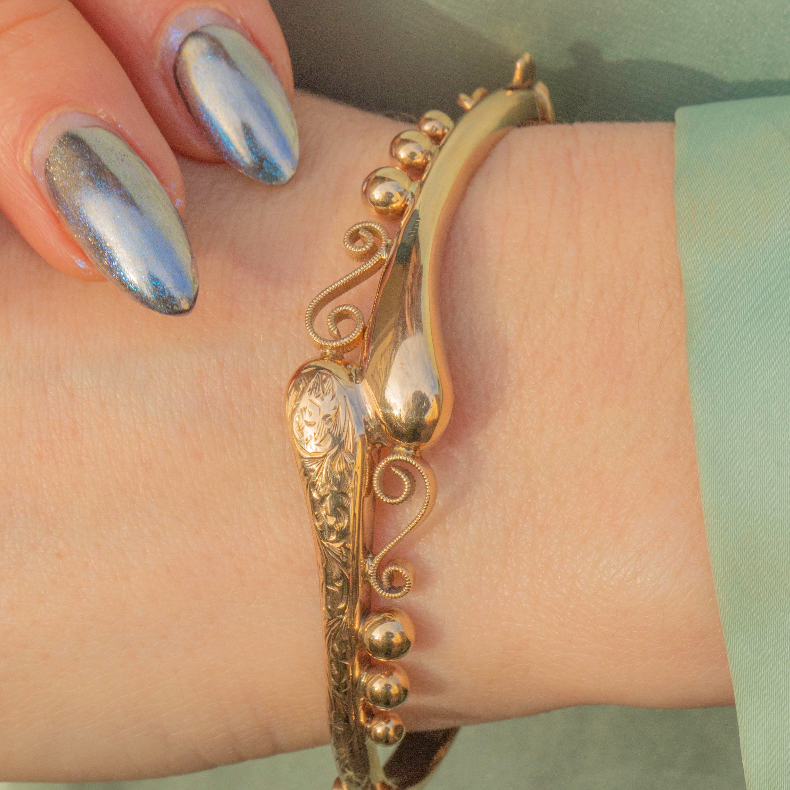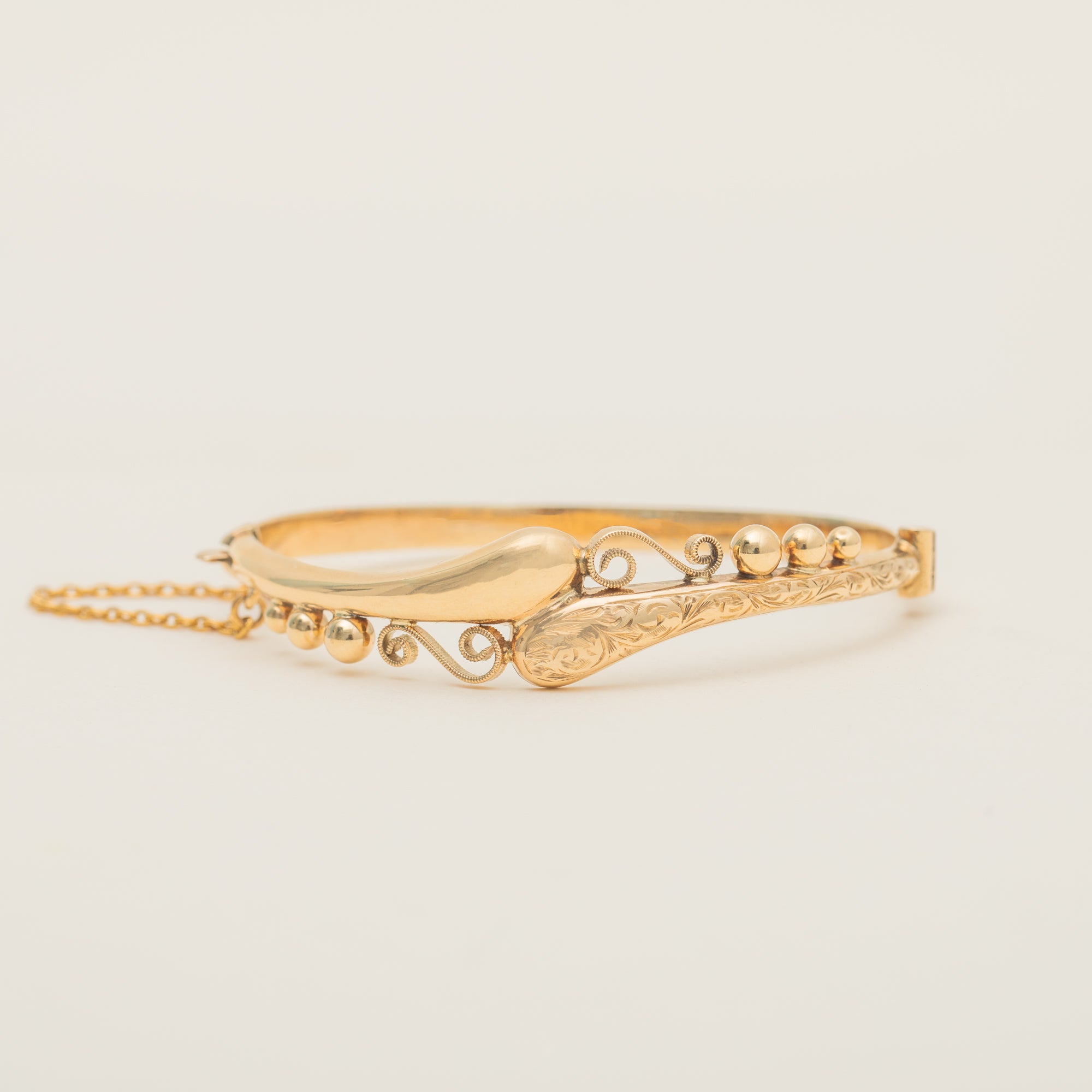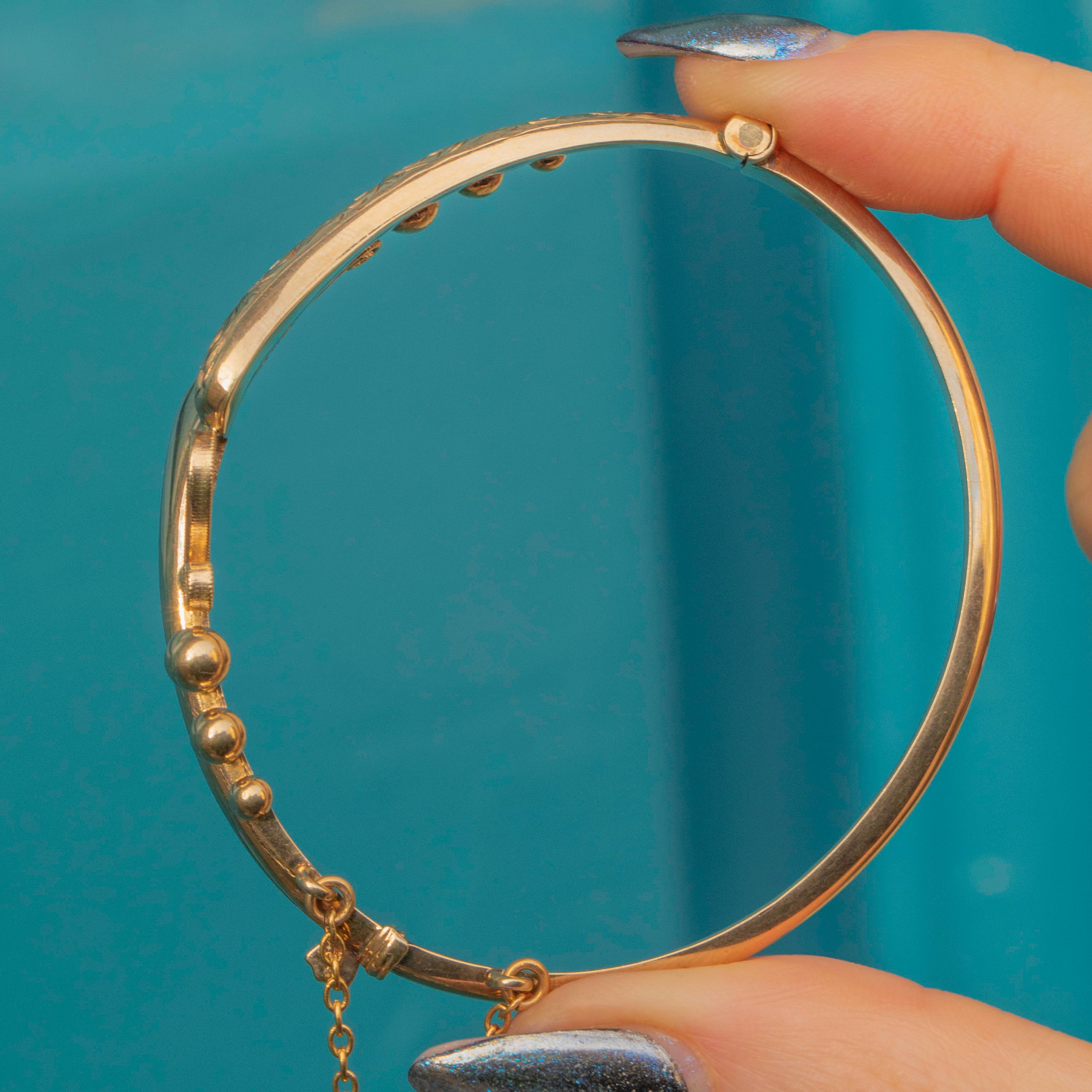 VERY GOOD. This lovely 9ct Gold engraved twist bangle shows only very minimal signs of wear. The Gold is buttery throughout and the engraved detail have all remained crisp. It has a secure clasp and a safety chain for peace of mind!