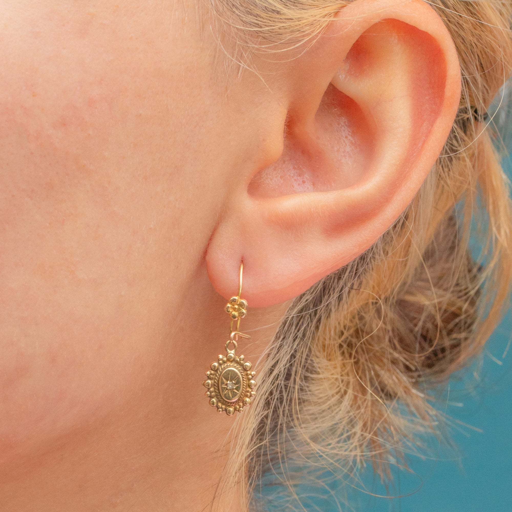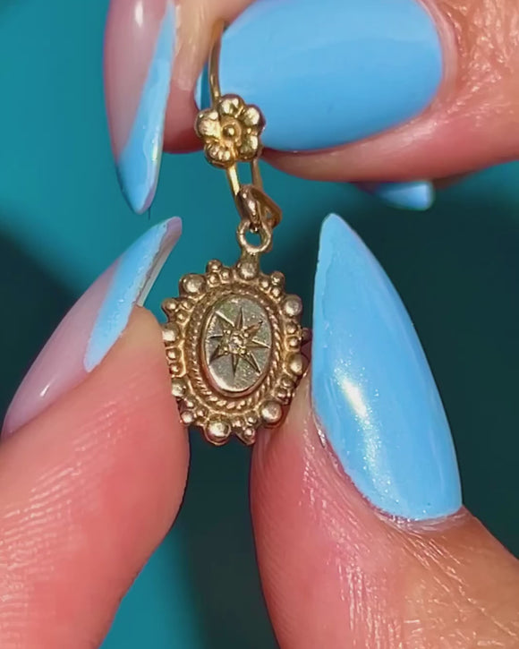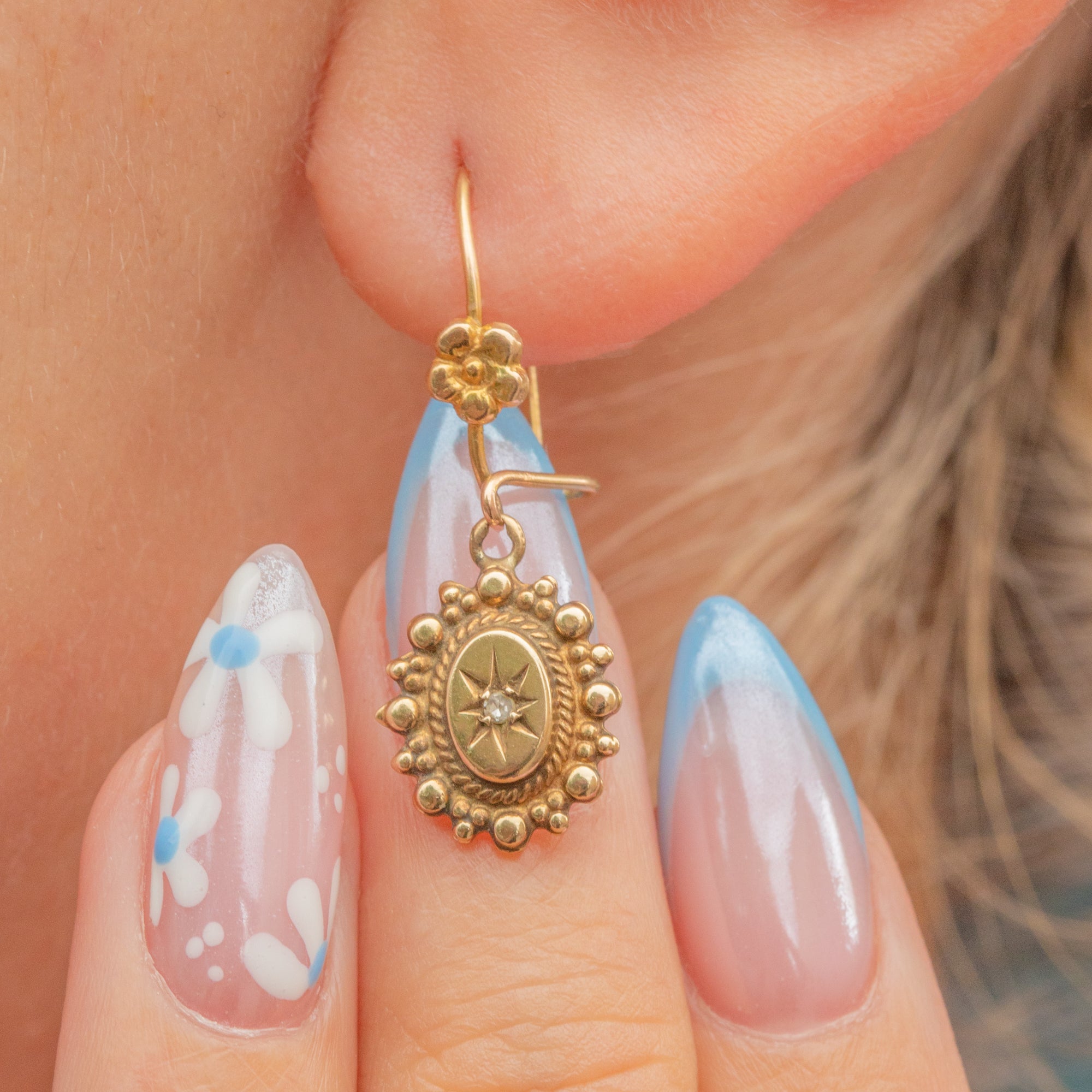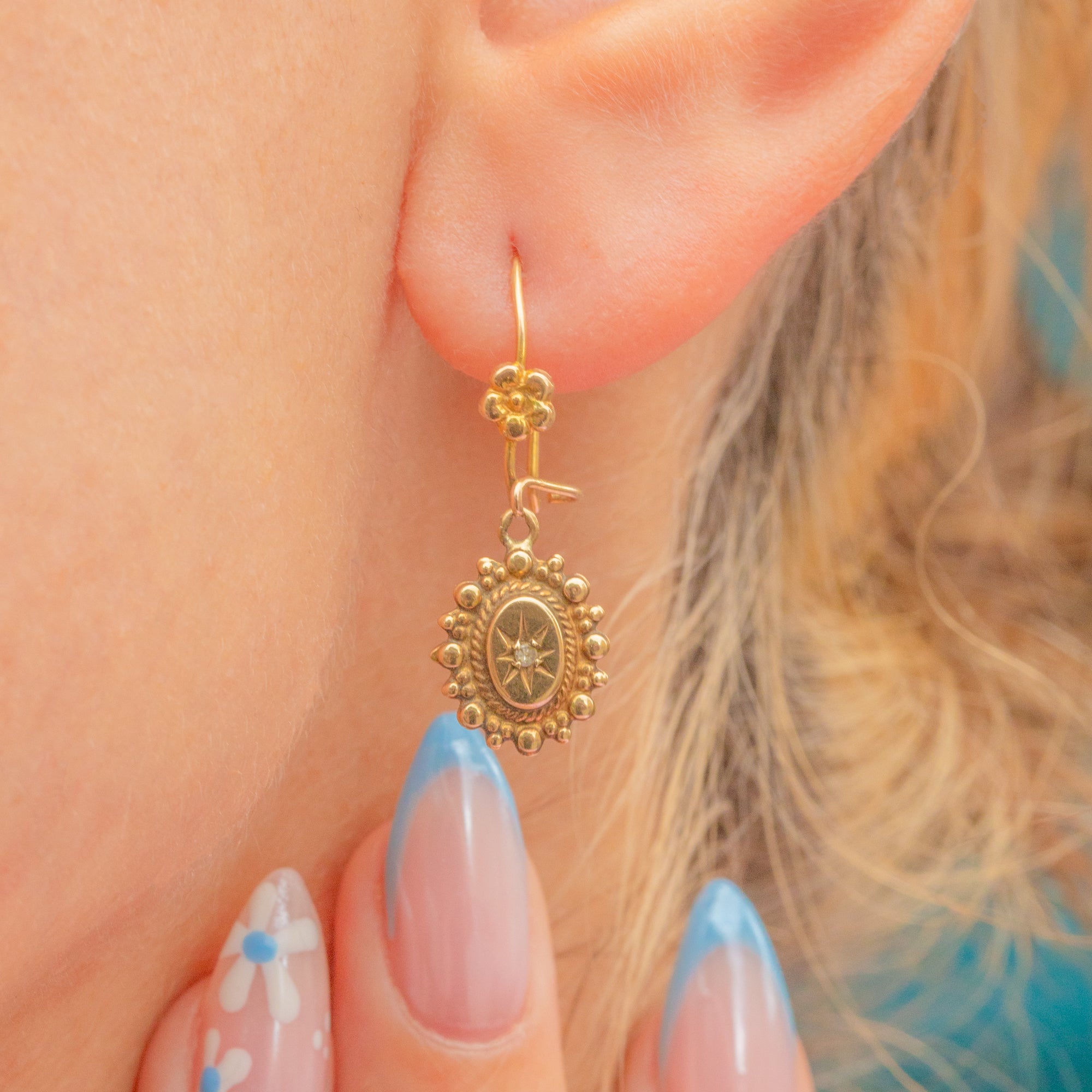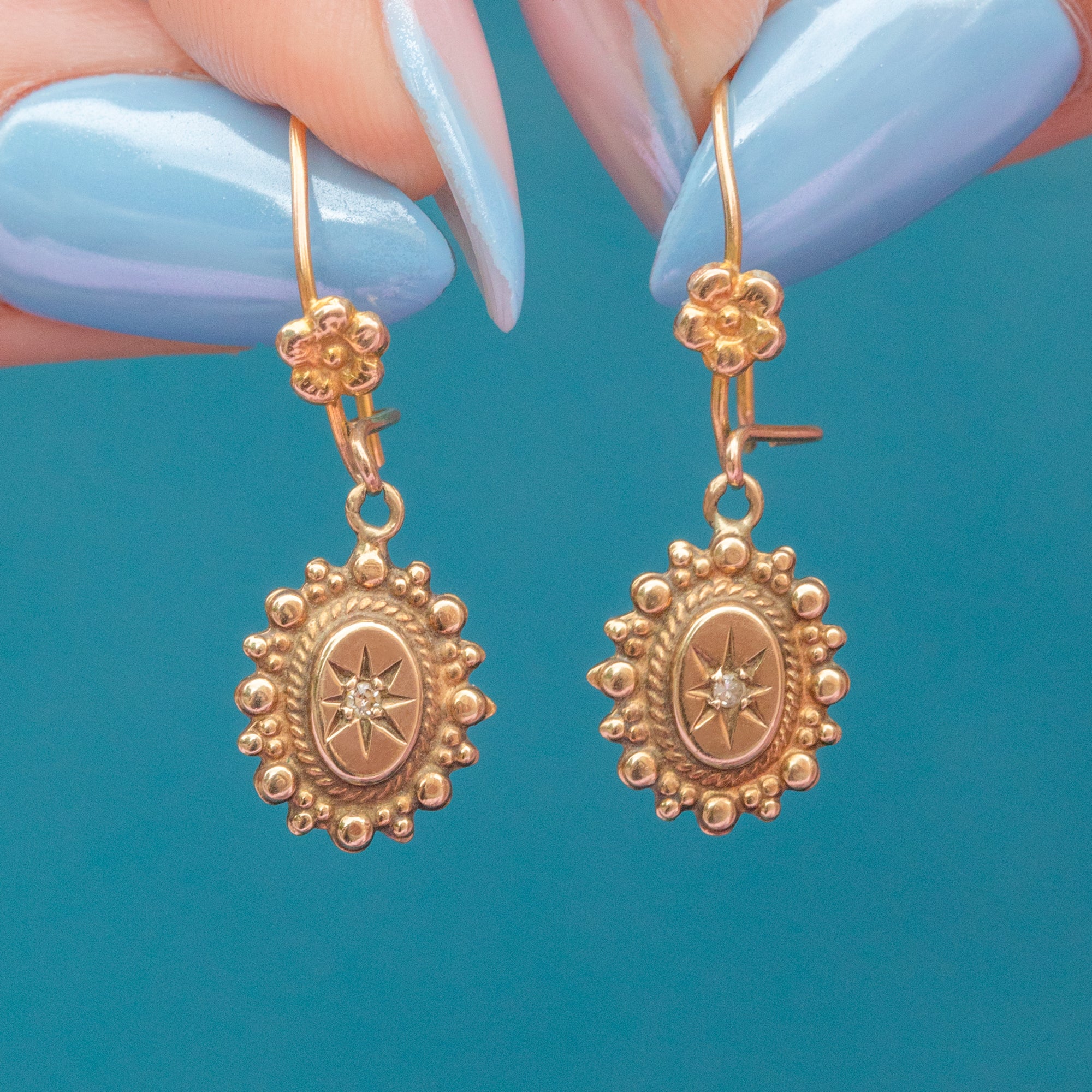 A vintage pair of Etruscan-style Diamond drop earrings! The Diamonds rest in a star setting, and the earrings are further adorned in typical Etruscan style details like a twisted rope border and a beaded edge.