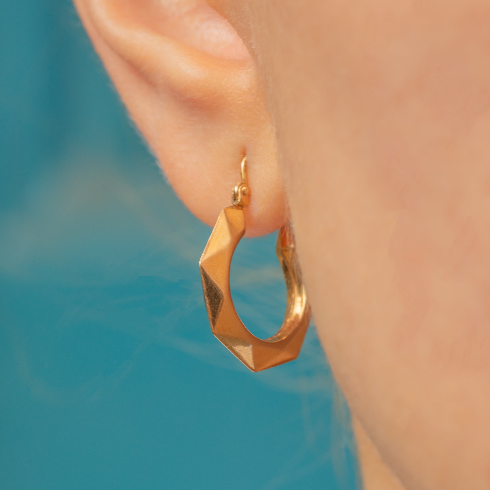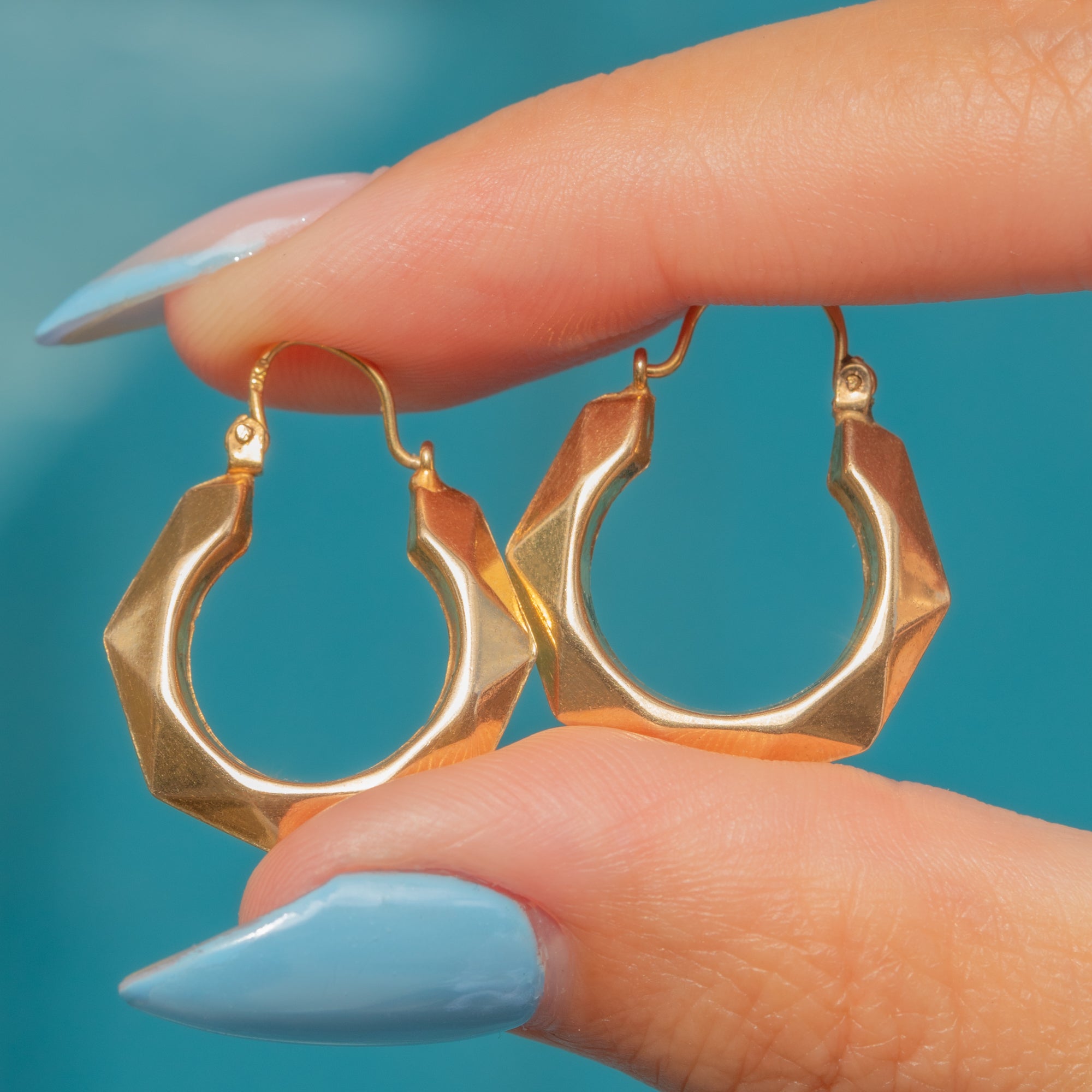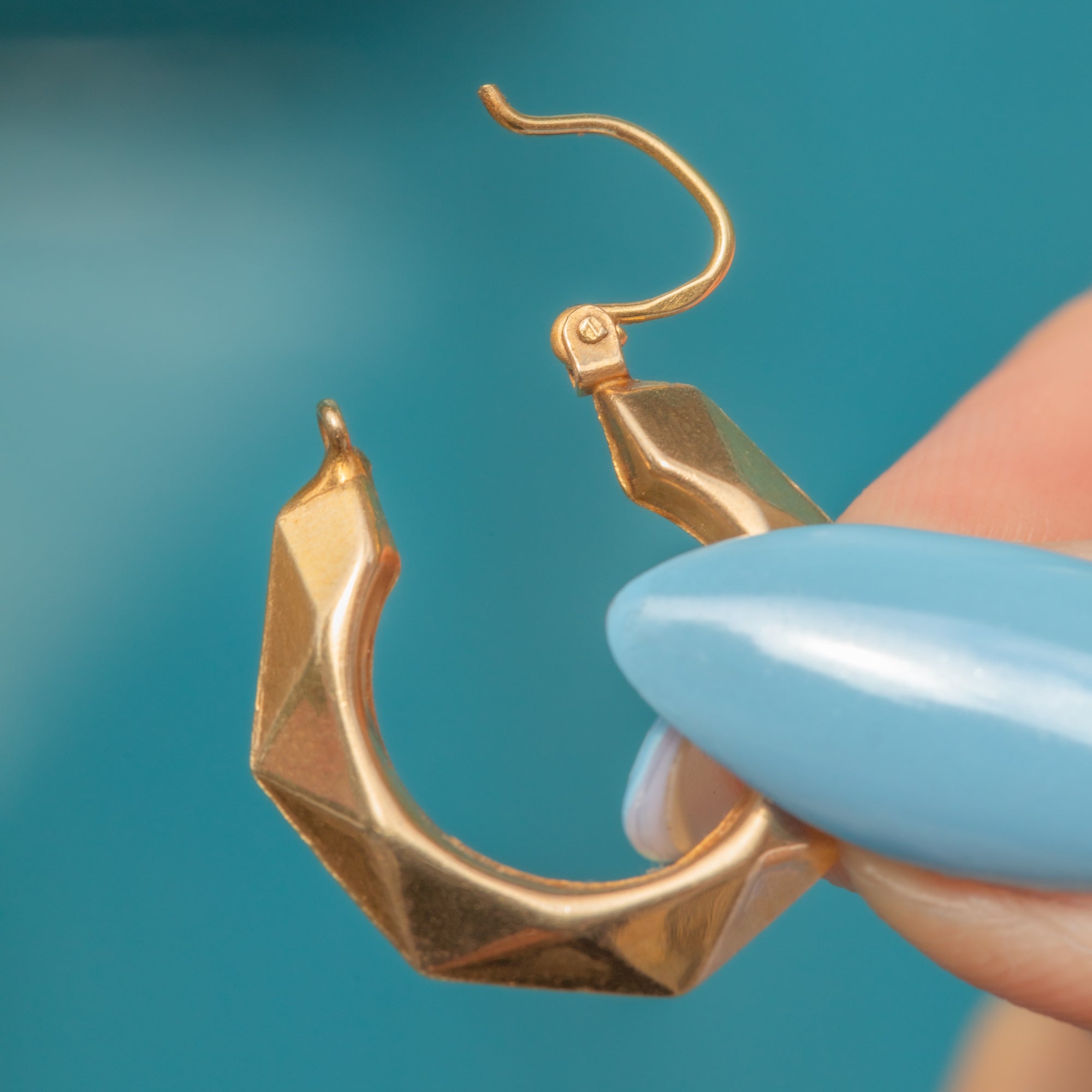 Crafted from rich 9ct Gold, these vintage hoops have striking faceted forms that catch the light beautifully.