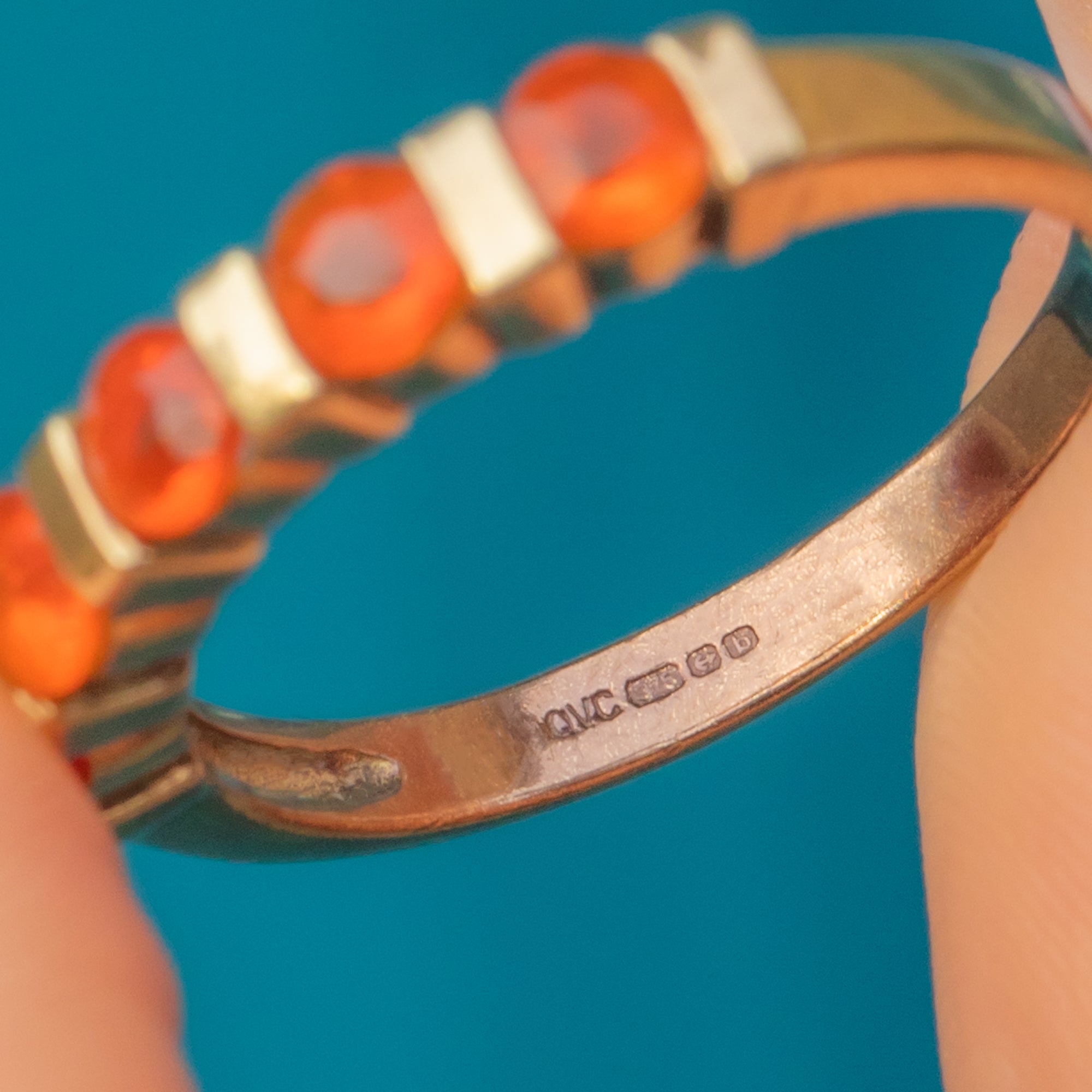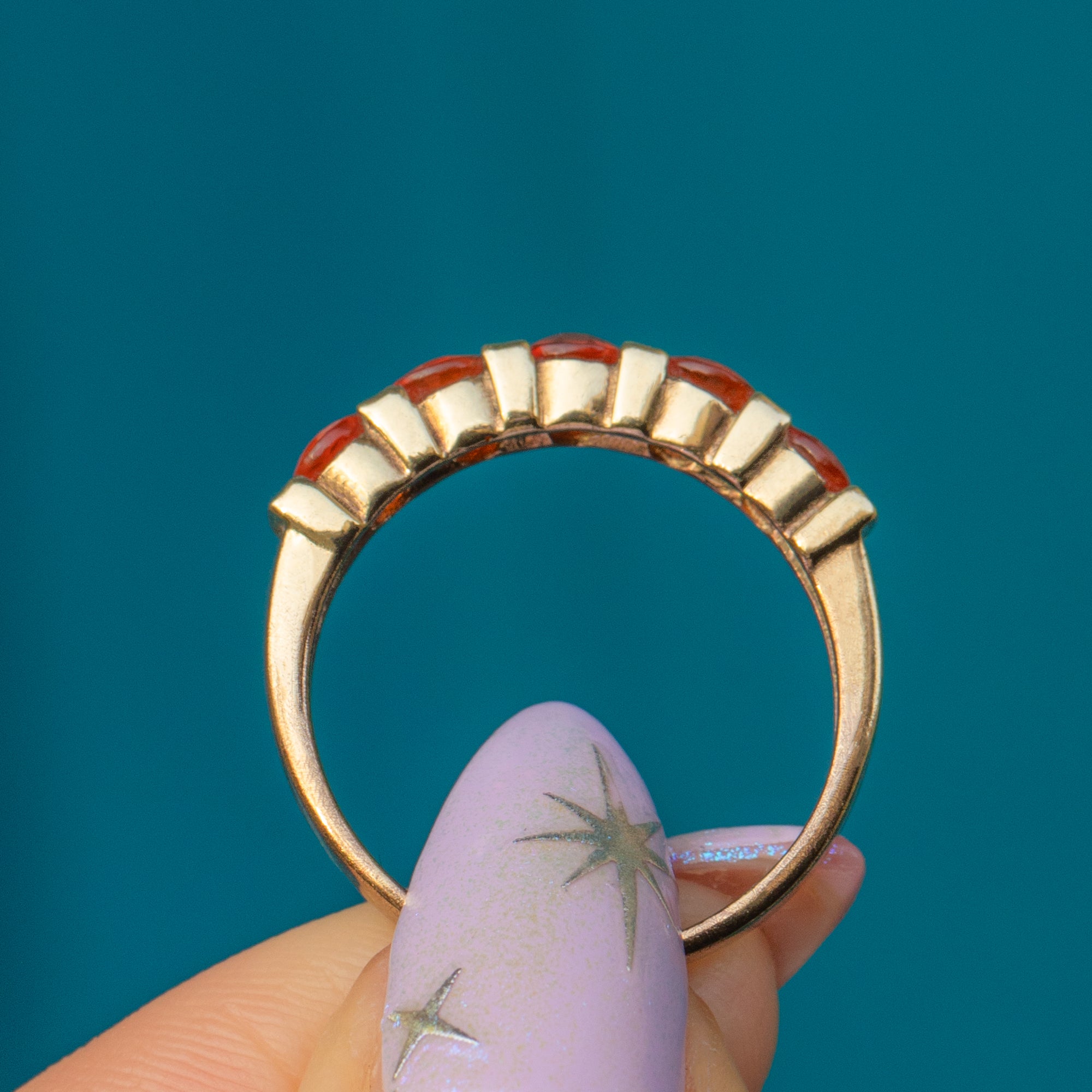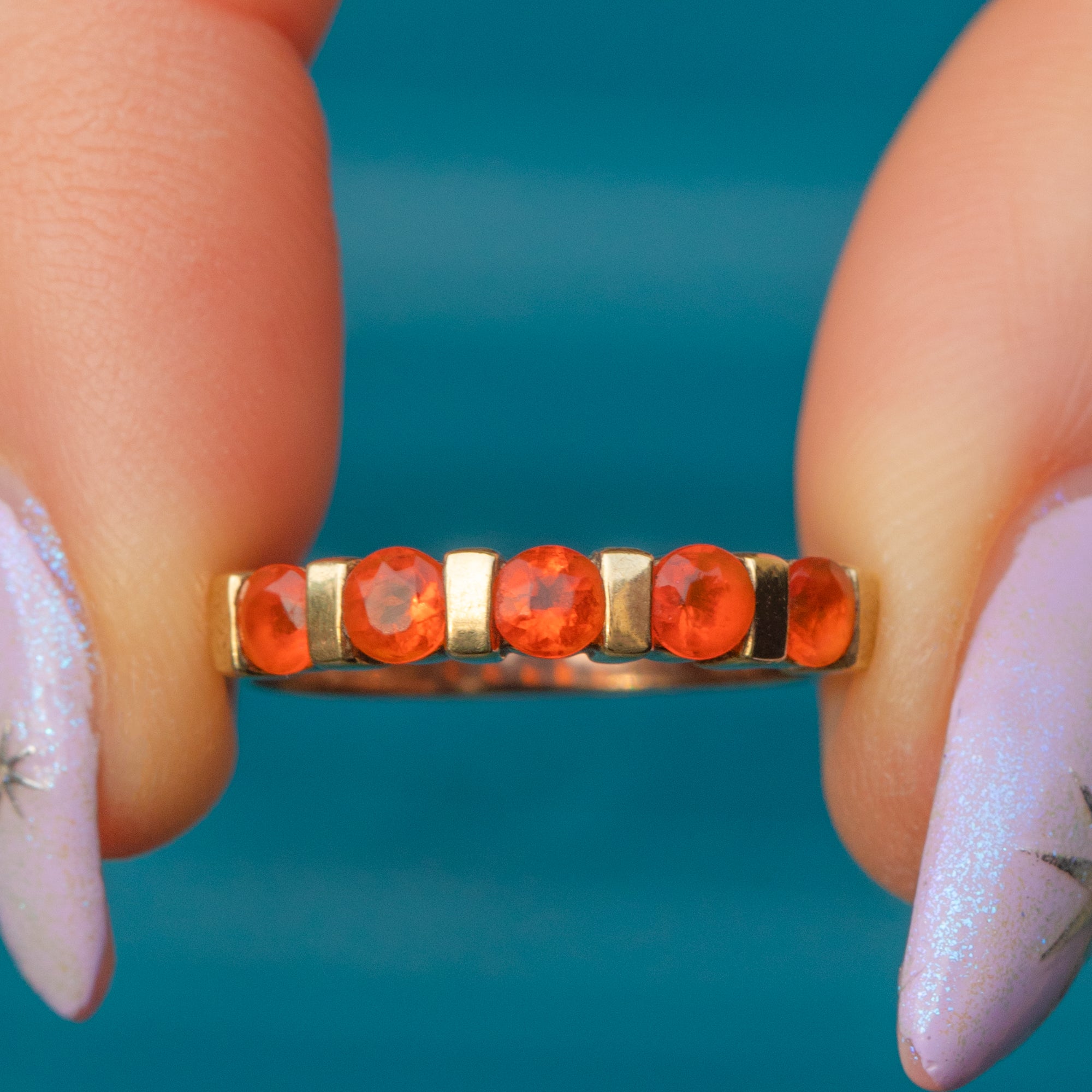 EXCELLENT. This 9ct Gold Fire Opal five stone ring is in excellent condition. The Gold is luminous and the band is smooth and comfortable to wear. The Opals are fiery and securely set with no visible surface wear. With so much wear potential, this vintage ring is ready to be worn and enjoyed!