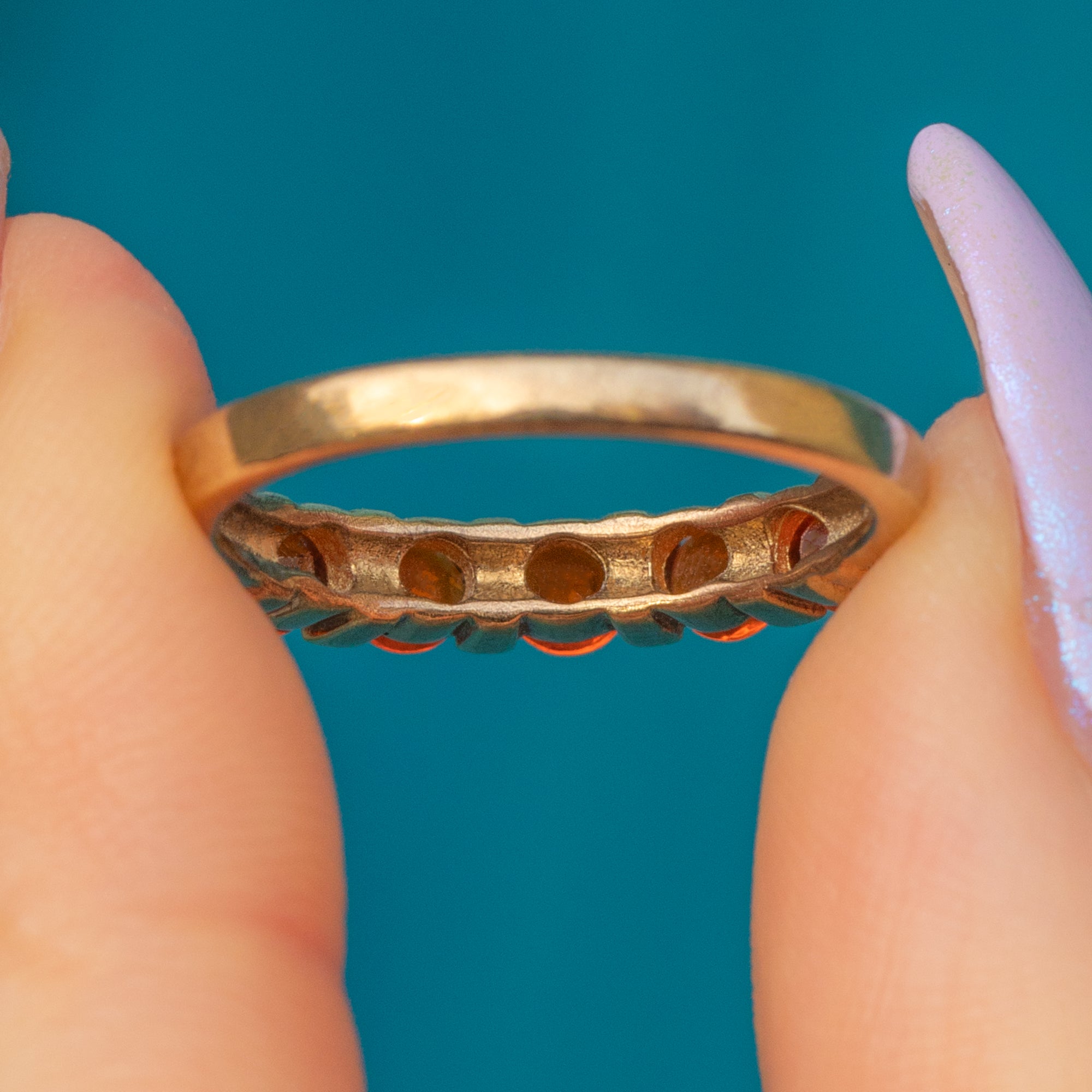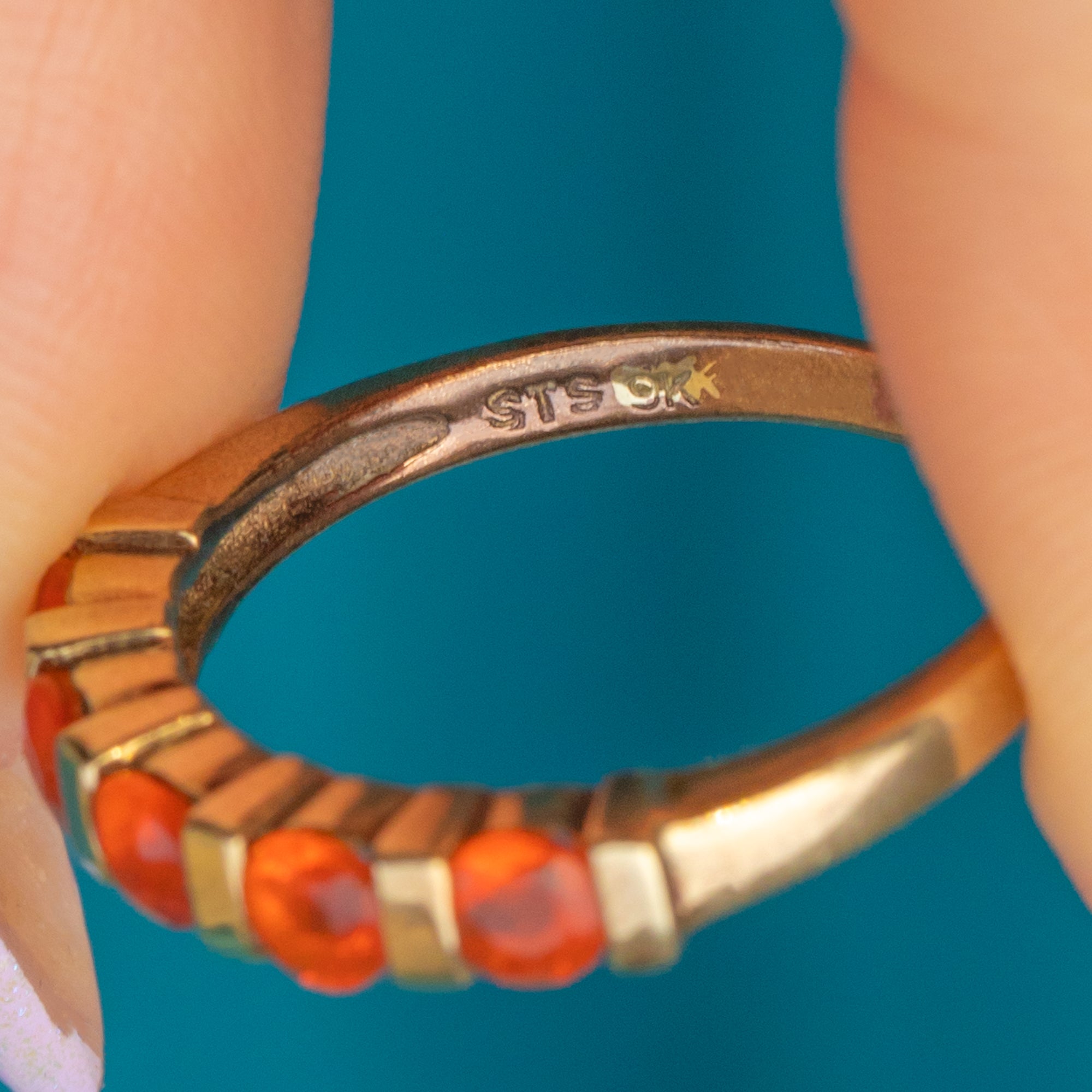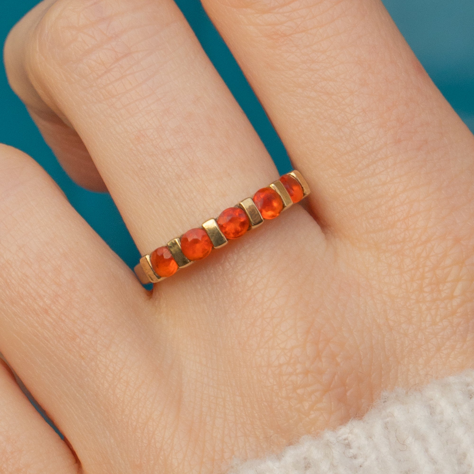 EXCELLENT. This 9ct Gold Fire Opal five stone ring is in excellent condition. The Gold is luminous and the band is smooth and comfortable to wear. The Opals are fiery and securely set with no visible surface wear. With so much wear potential, this vintage ring is ready to be worn and enjoyed!