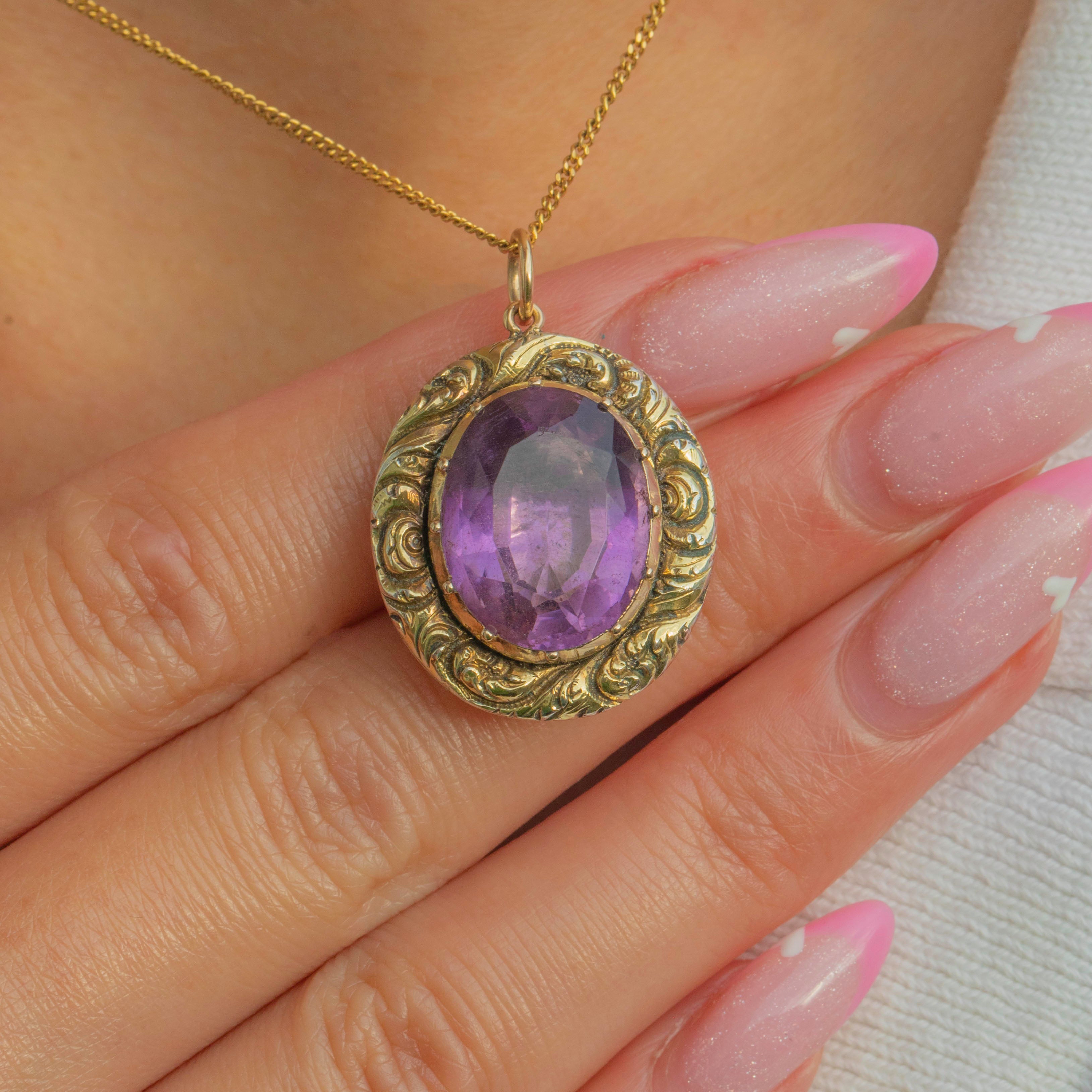 This beautiful Georgian Amethyst pendant showcases the rich colour and romantic craftsmanship of the late 18th to early 19th century. The deep purple Amethyst is faceted and mounted within an ornate chased Gold frame, its scrolling details adding texture and movement to the design. The gemstone glows warmly in its closed-back setting, a hallmark of Georgian jewellery, enhancing its inner fire and charm.