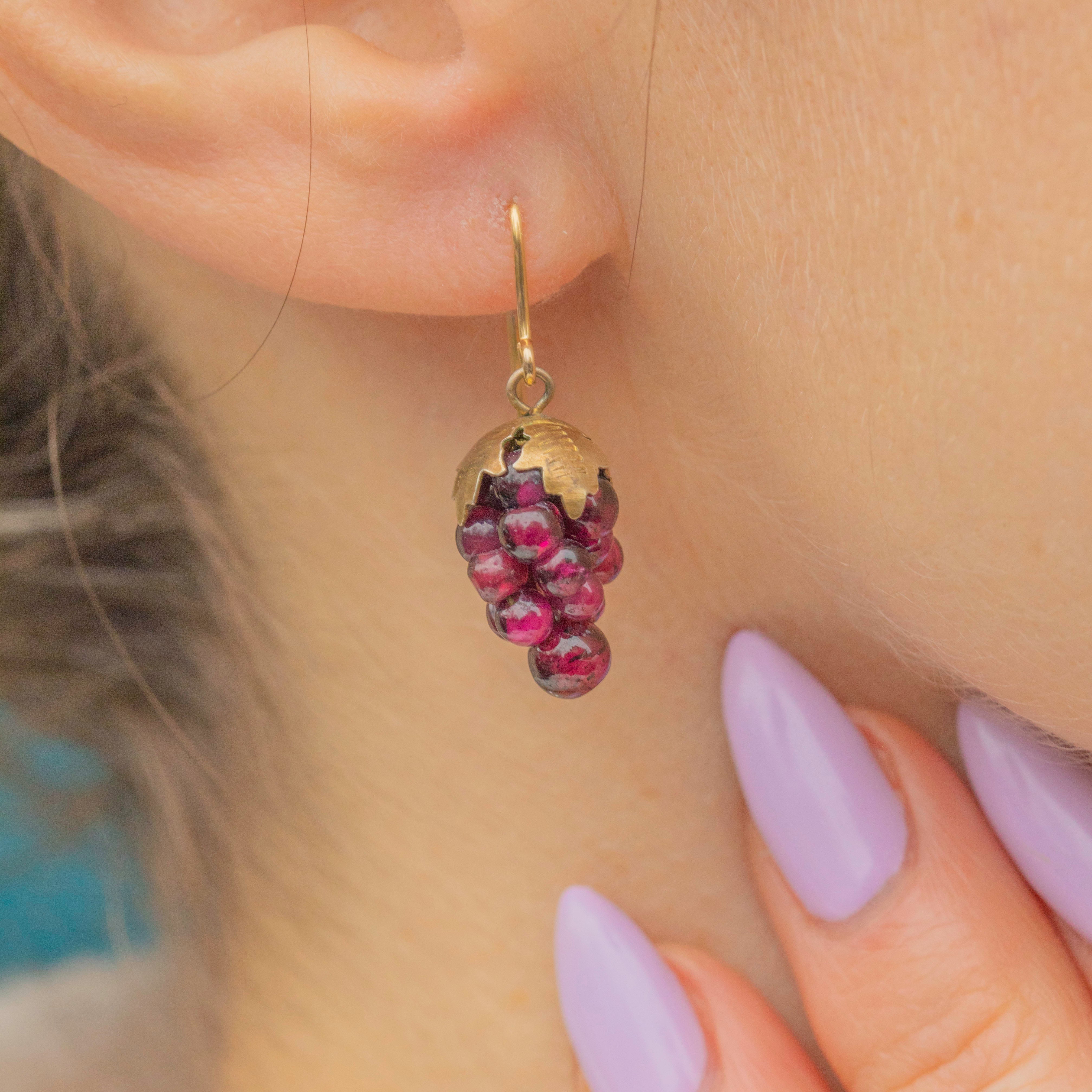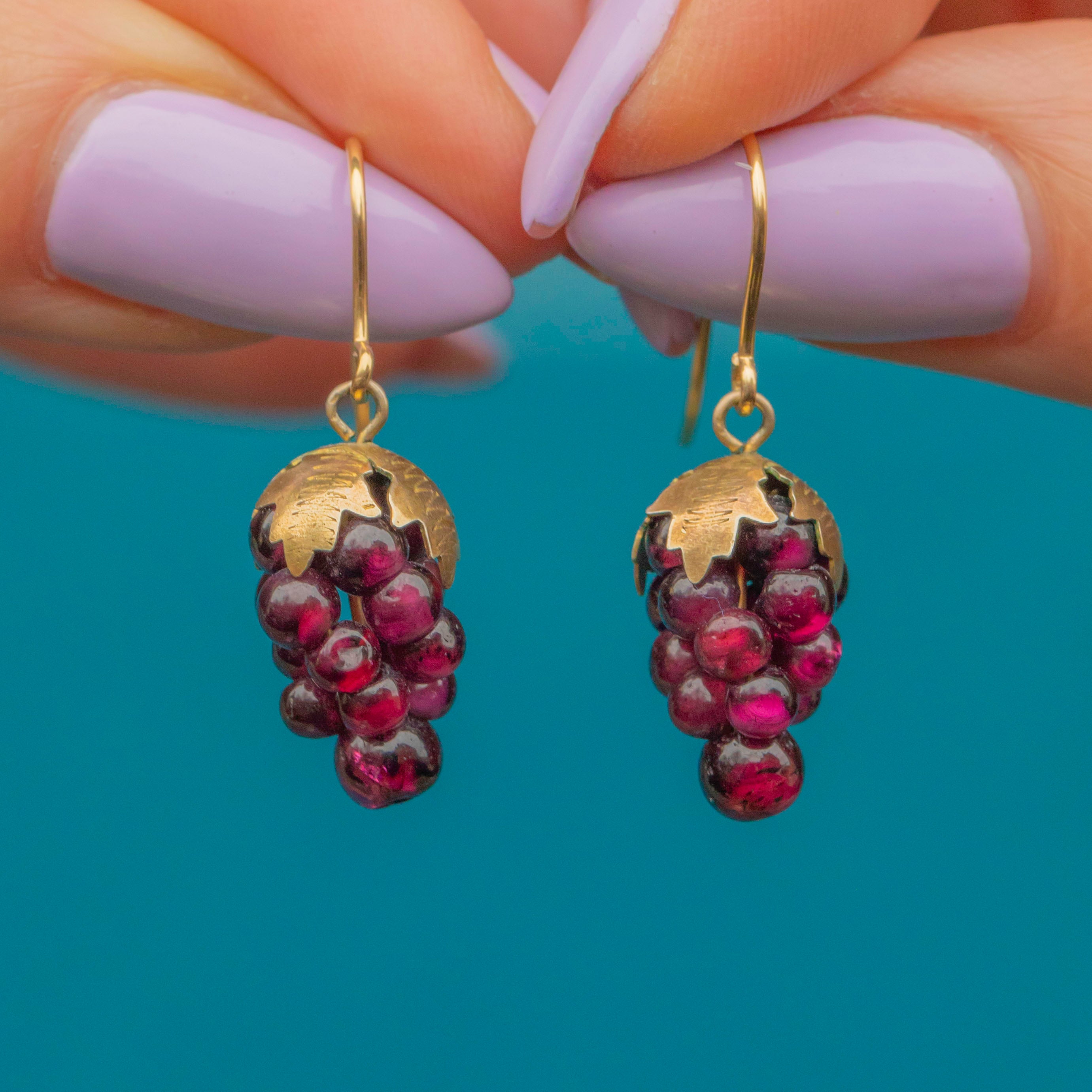 These 9ct Gold Garnet grape earrings are so adorable! Crafted from buttery 9ct Gold, these earrings feature a cluster of deep purple Garnets, formed into delicate grapes suspending from a Gold vine.