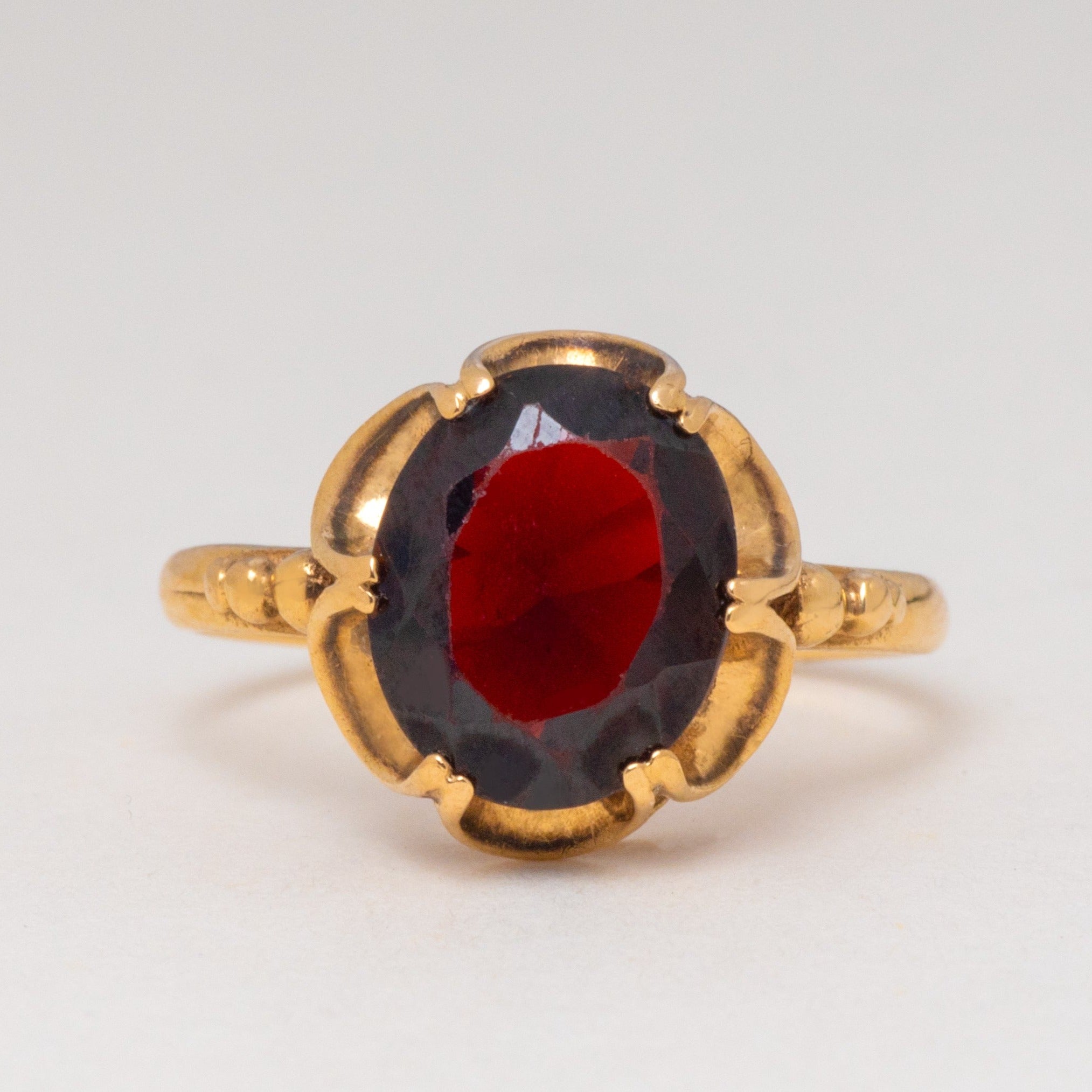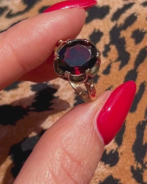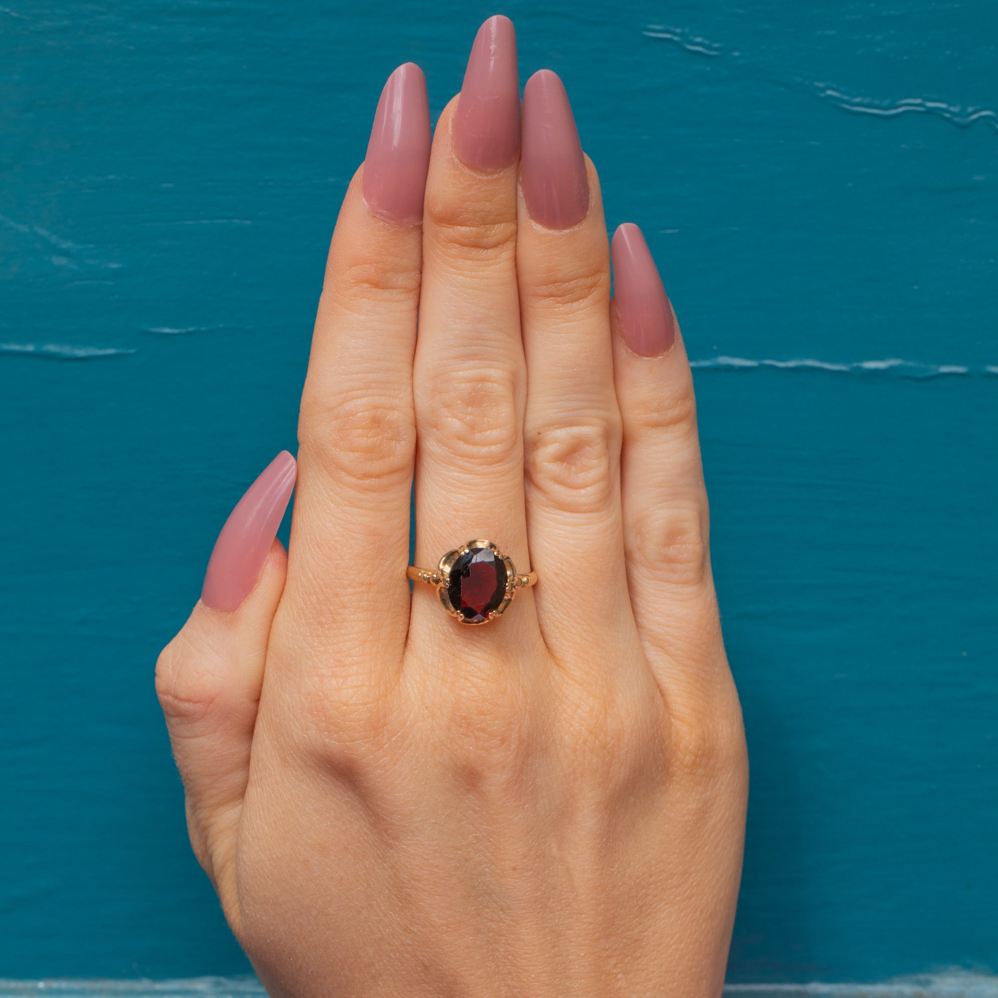 This 9ct Gold ring Garnet buttercup set ring was born to bring drama to your ring stack! Taking heavy inspiration from the Victorian period, this Vintage ring flaunts floral buttercup settings embracing a 2.00ct Garnet.