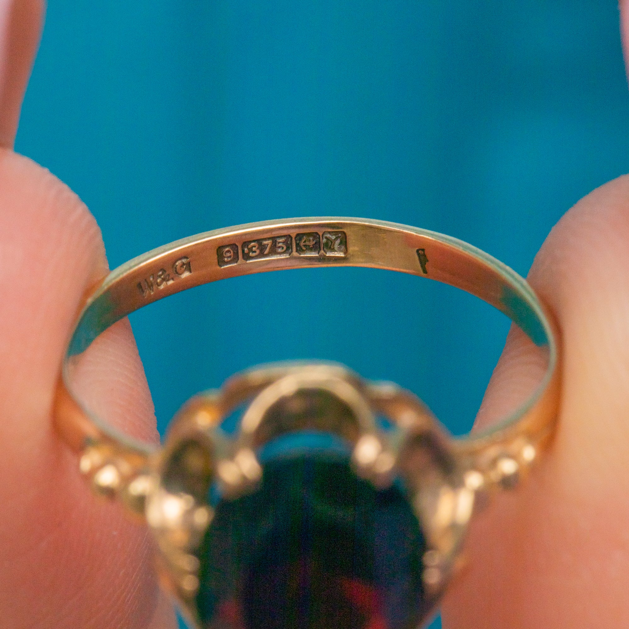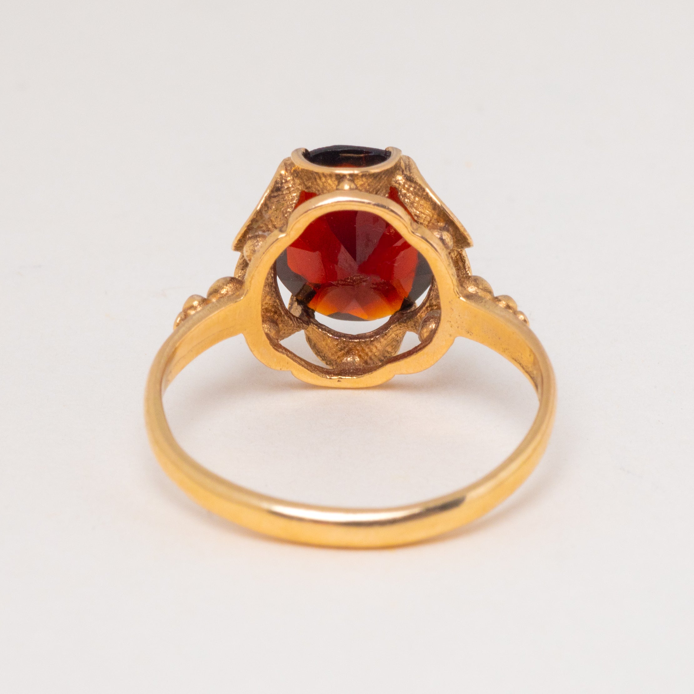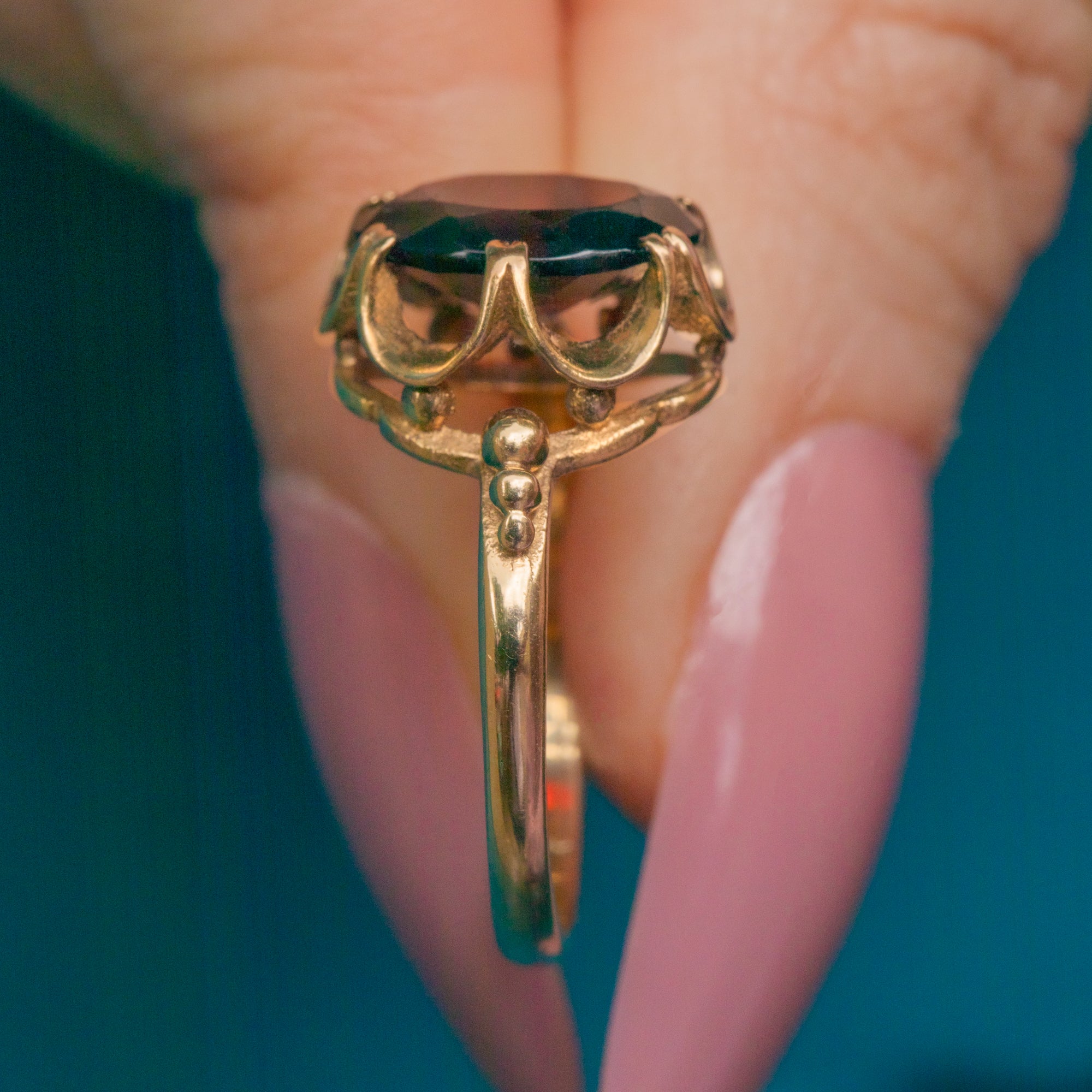 This 9ct Gold ring Garnet buttercup set ring was born to bring drama to your ring stack! Taking heavy inspiration from the Victorian period, this Vintage ring flaunts floral buttercup settings embracing a 2.00ct Garnet.