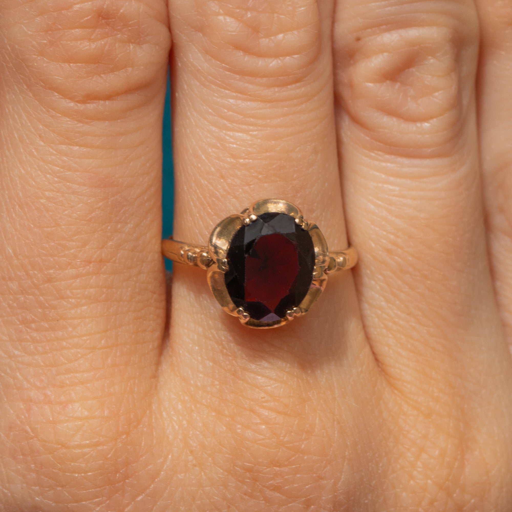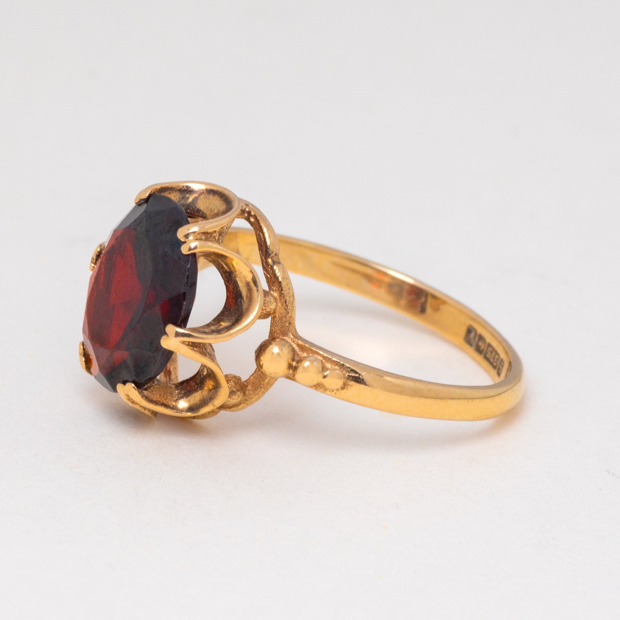 EXCELLENT. This 9ct Gold ring Garnet buttercup set ring is in excellent condition! The Garnet is secure within its setting, with crisp facets and a deep sangria glisten throughout. The Gold has retained its structural integrity and wears like a dream.