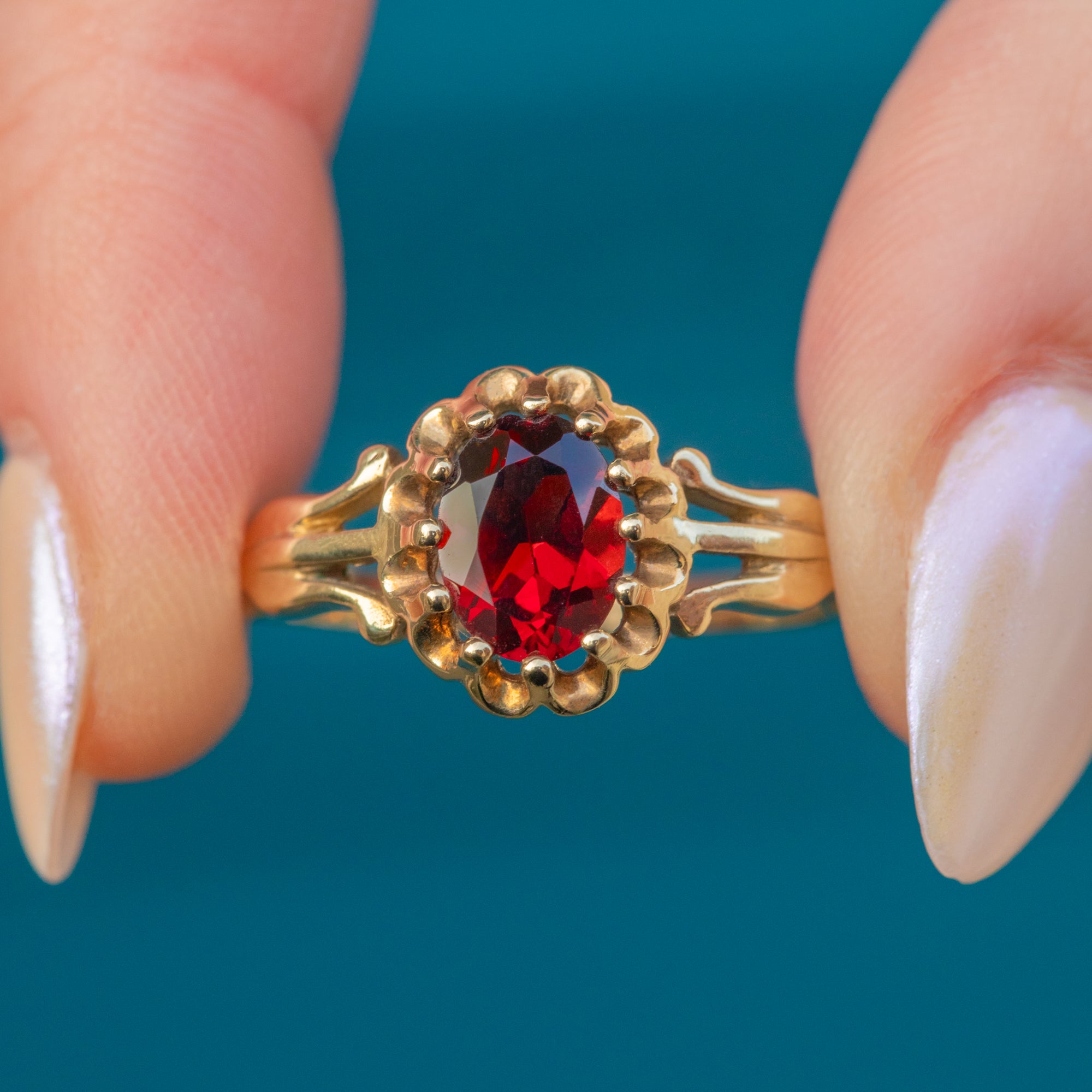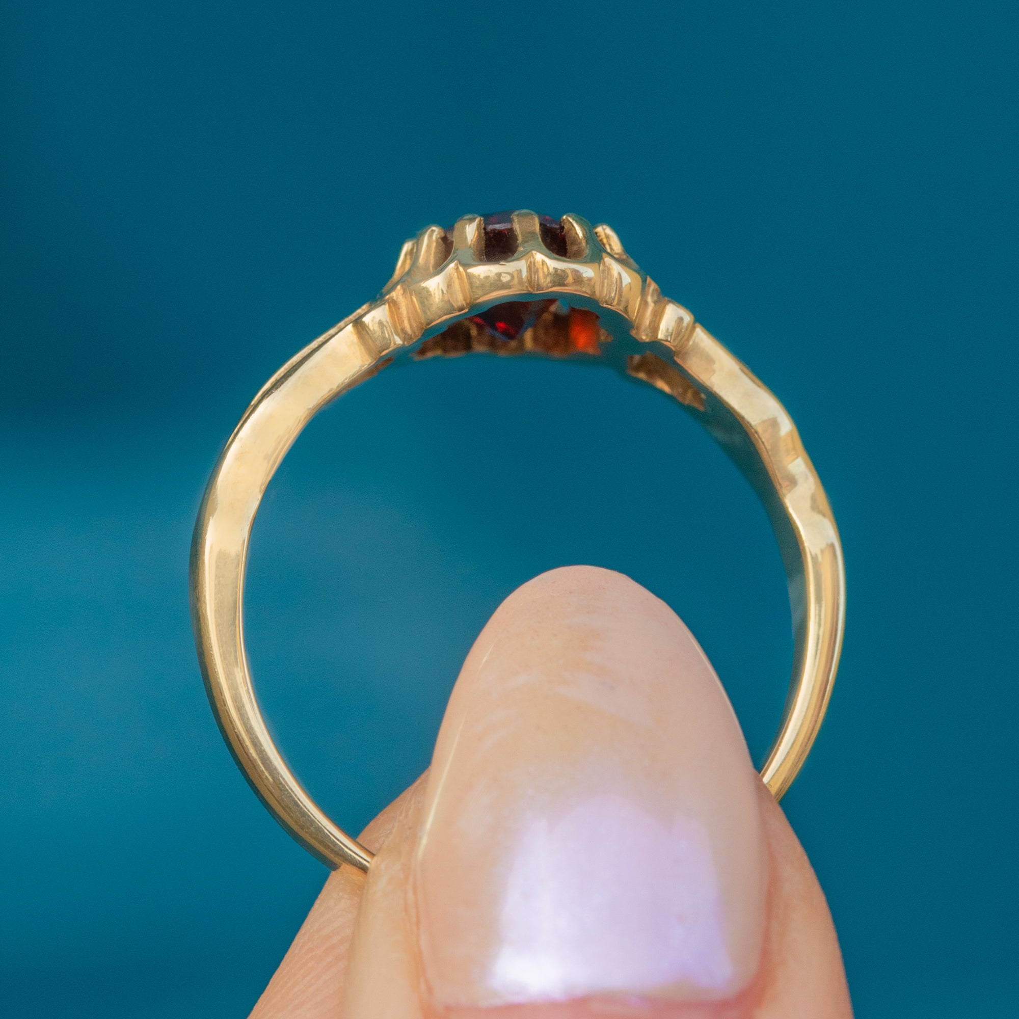 The glimmering 1.12ct Garnet has a crisp set of facets and is displayed within a pretty buttercup setting that allows the light to stream through from every angle. With a low profile, this vintage Garnet ring is perfect for adding luxury to your everyday attire!