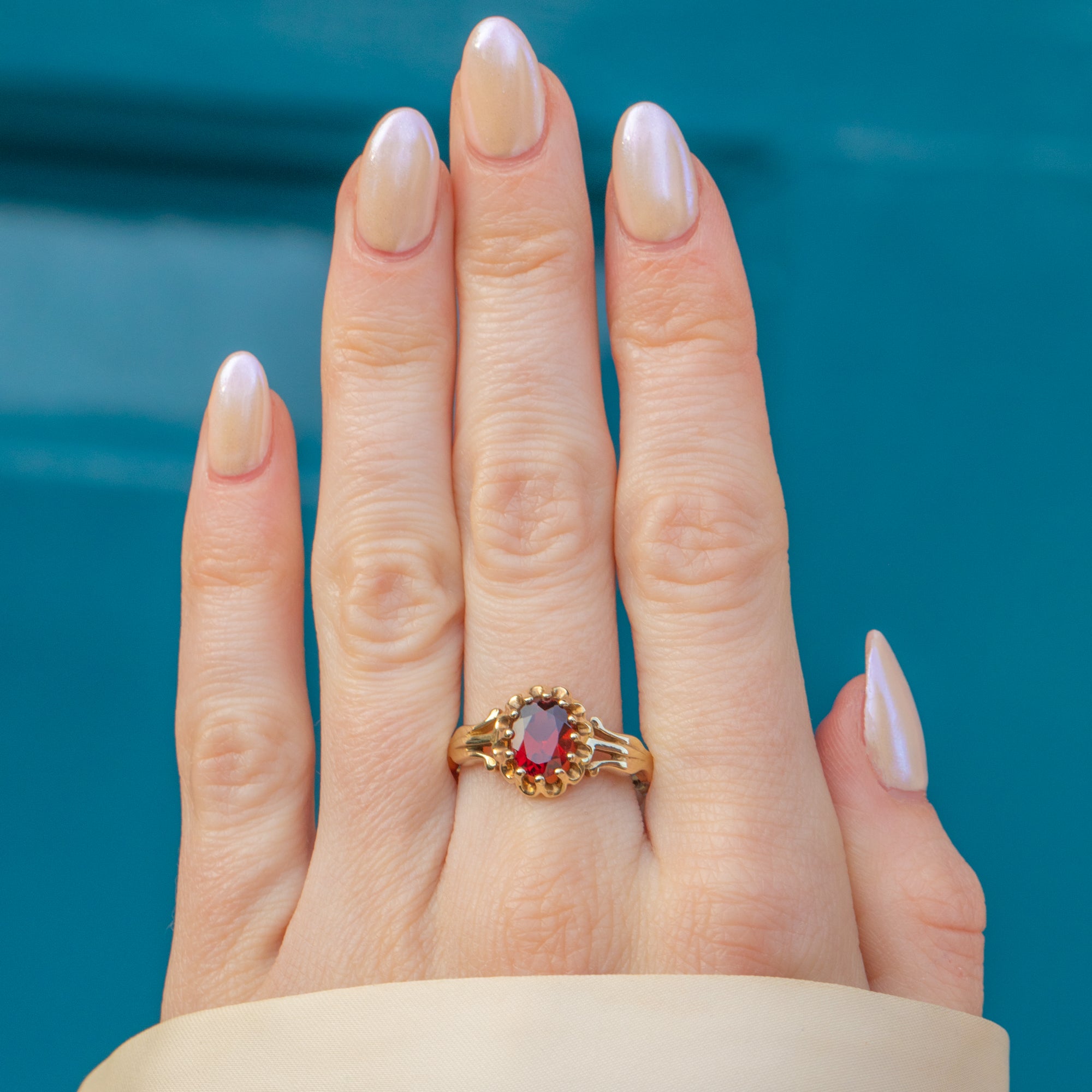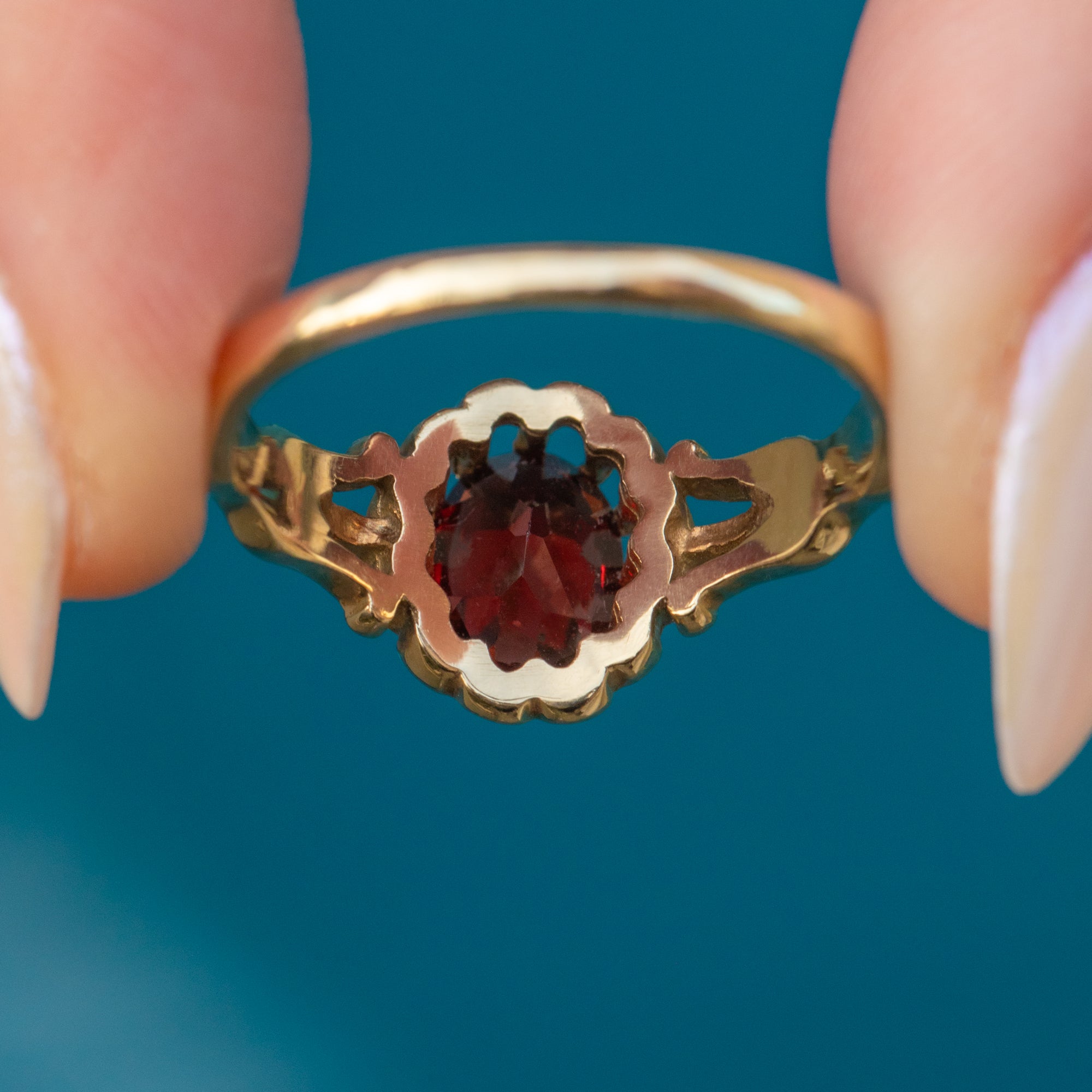 MATERIALS: Tests as 9ct Gold, Garnet (1.12ct).