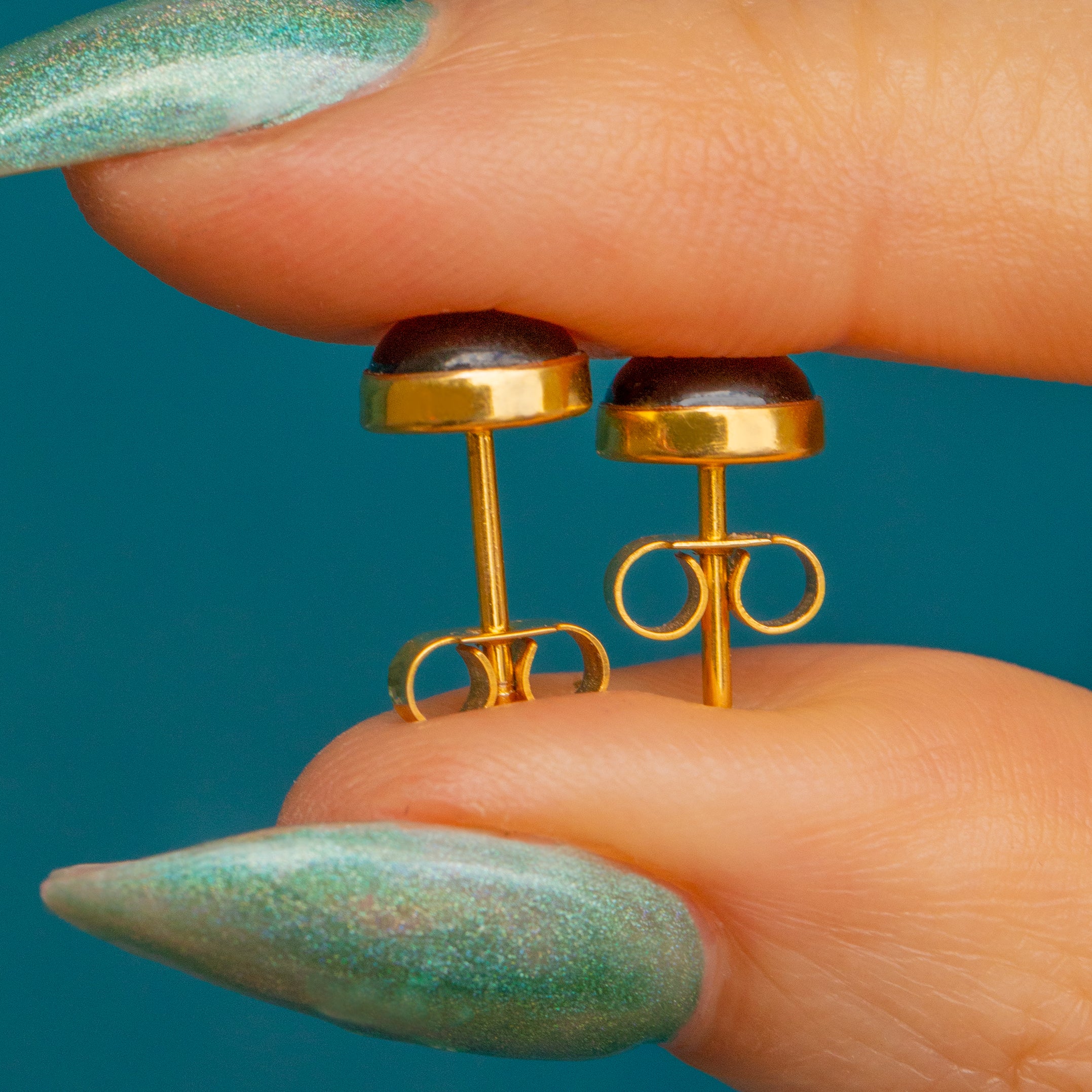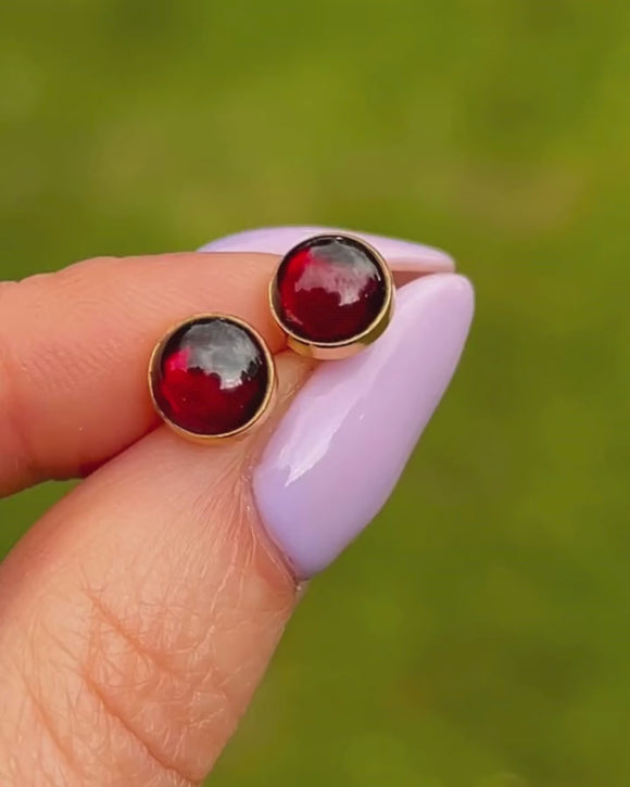 Add a touch of Vintage elegance to your ensemble with these exquisite 9ct Gold Garnet cabochon stud earrings! Deep berry red hues seep from the depths of the smoothly cut Garnet cabochons, revealing flashes of crimson as they catch the light.