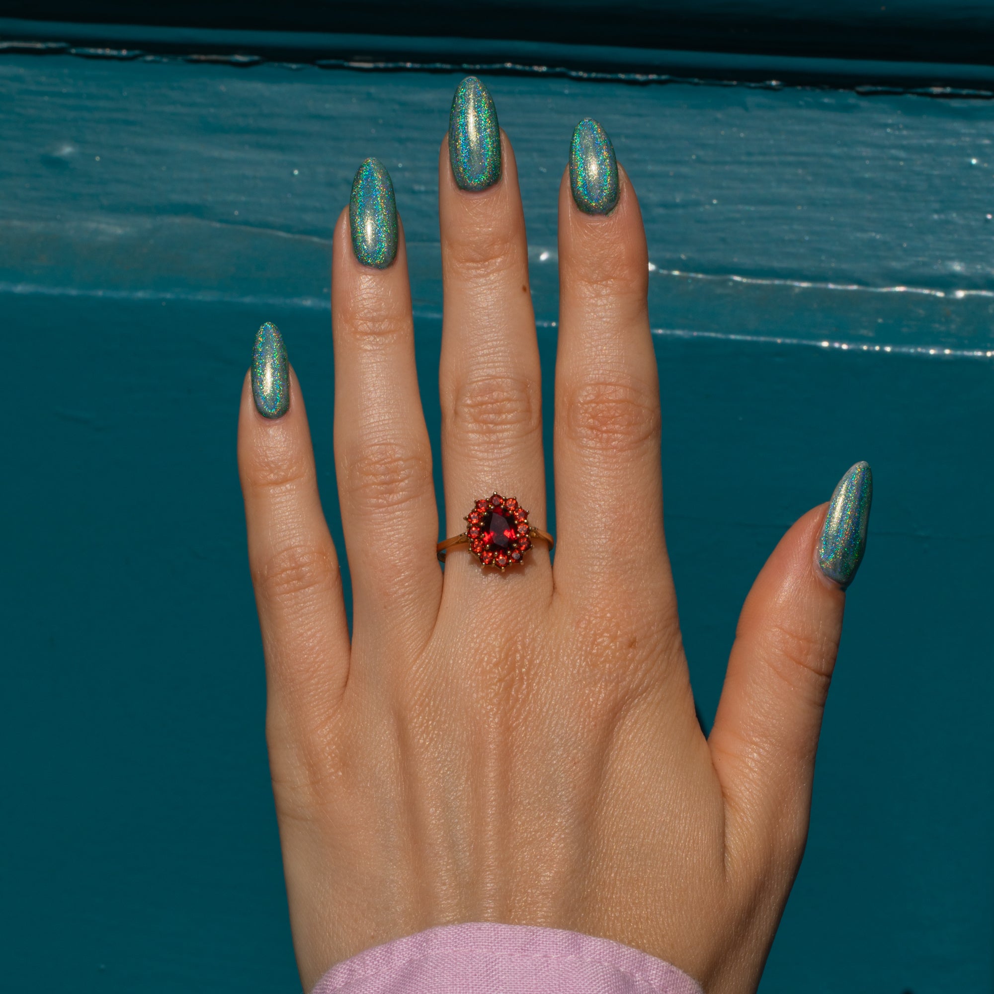 This 9ct Gold Garnet flower cluster ring is bursting with romance and seduction. Her juicy crimson hues bounce from one Garnet to the next, forming her feminine floral cluster that provides wonderful hand coverage.