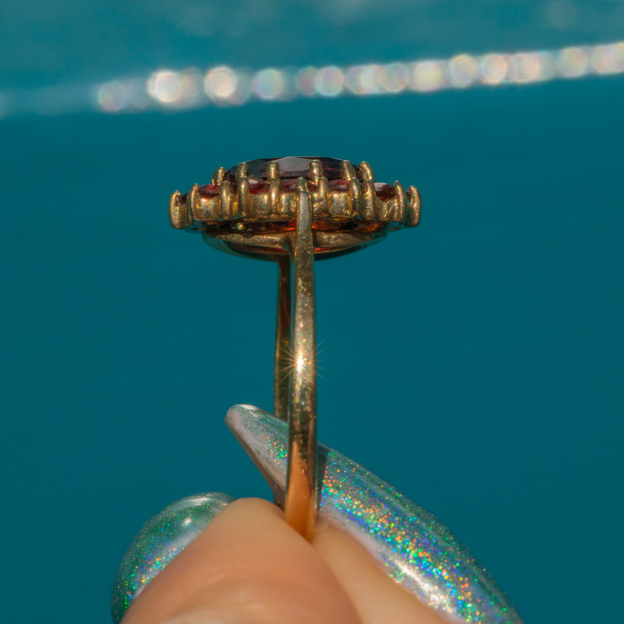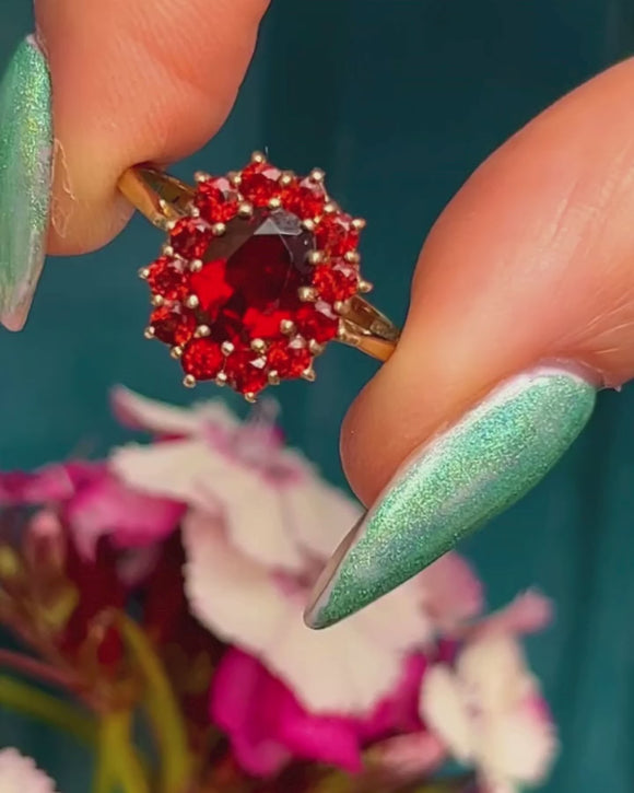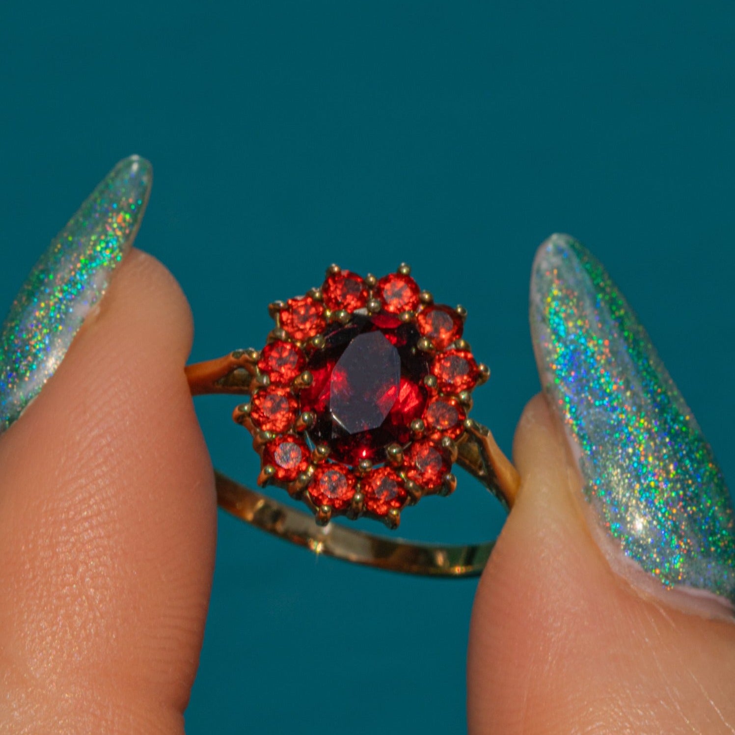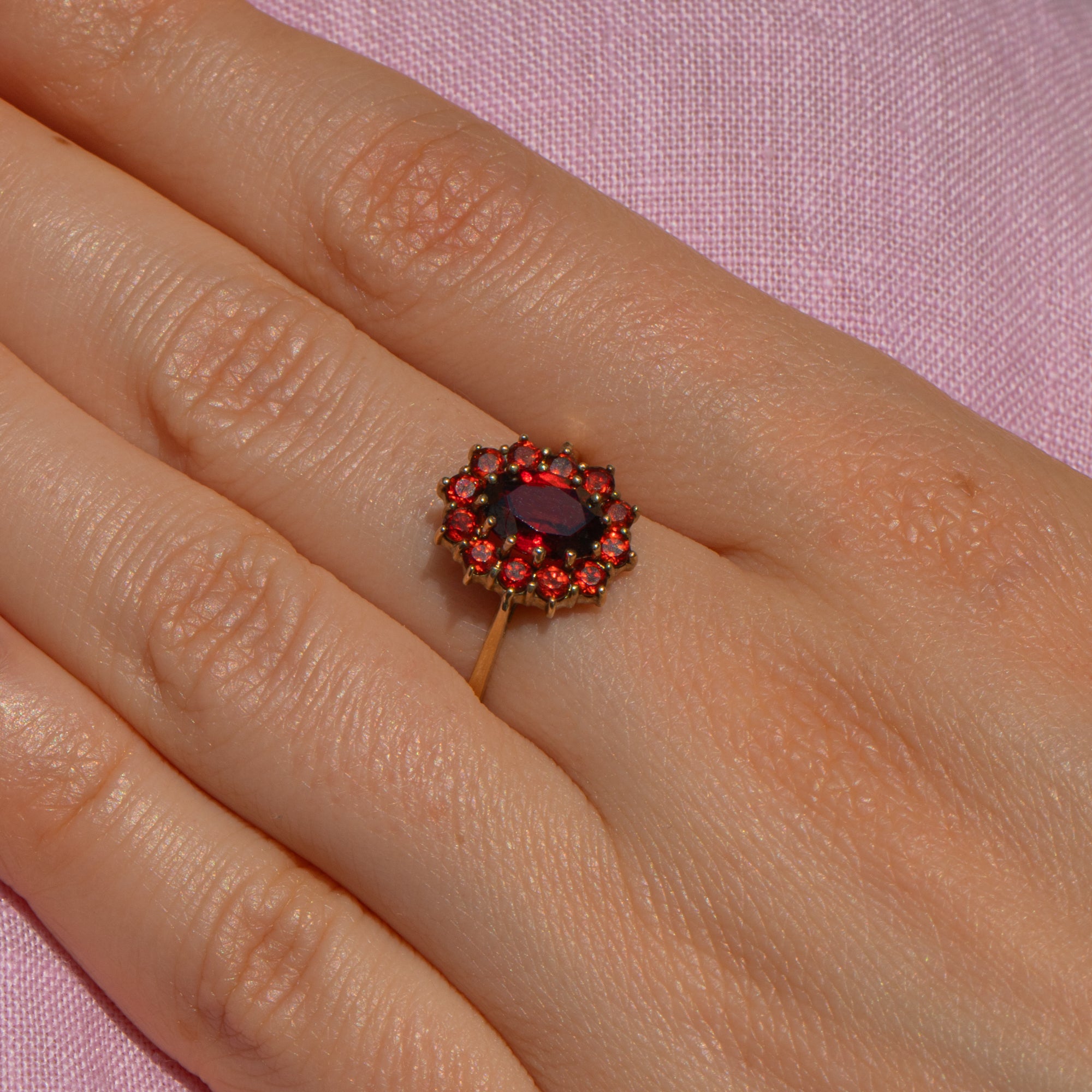 EXCELLENT. With nothing to report, this 9ct Gold Garnet flower cluster ring is in excellent condition. The Garnets are secure, the Gold is glowing and she glides onto your hand a dream. What more could you ask for!