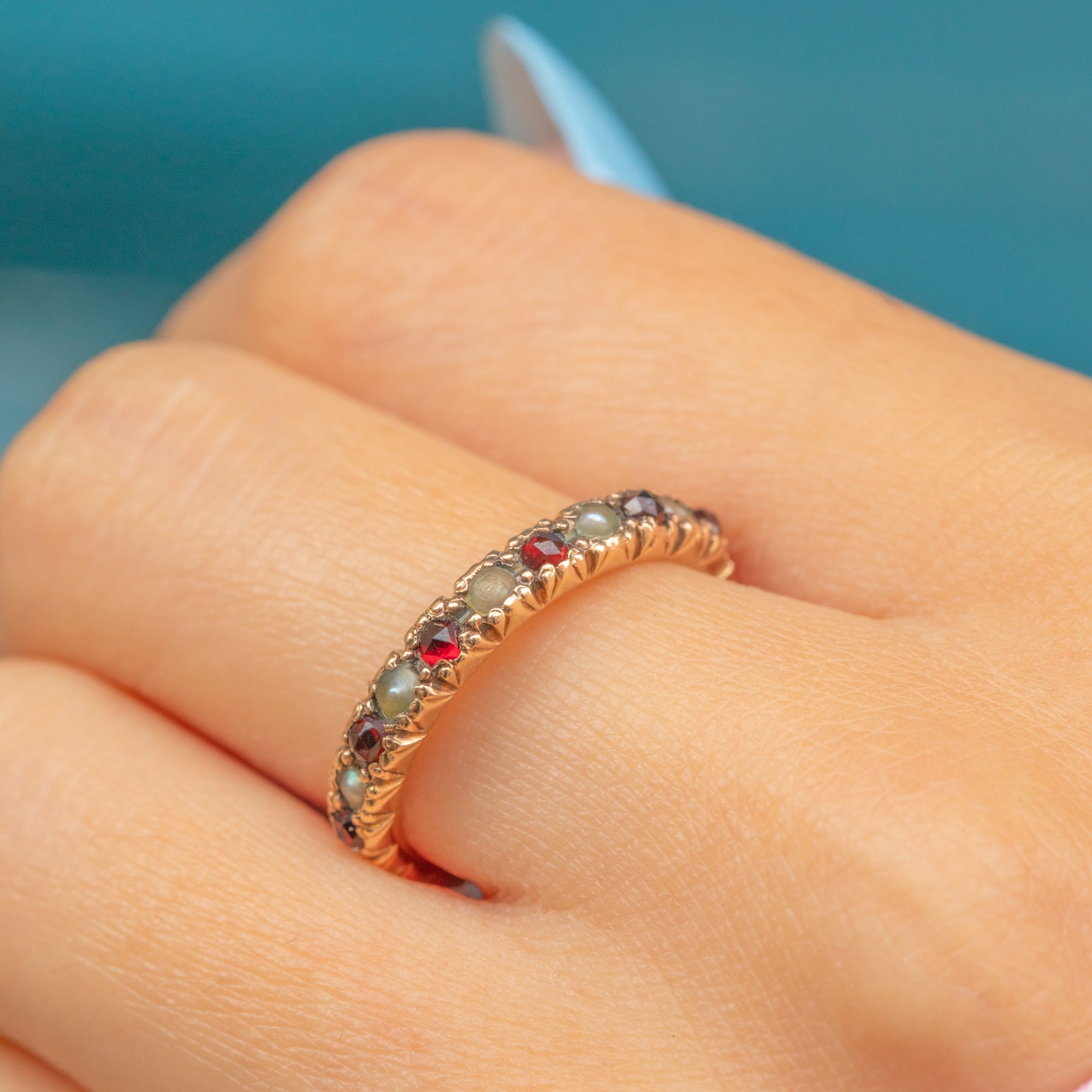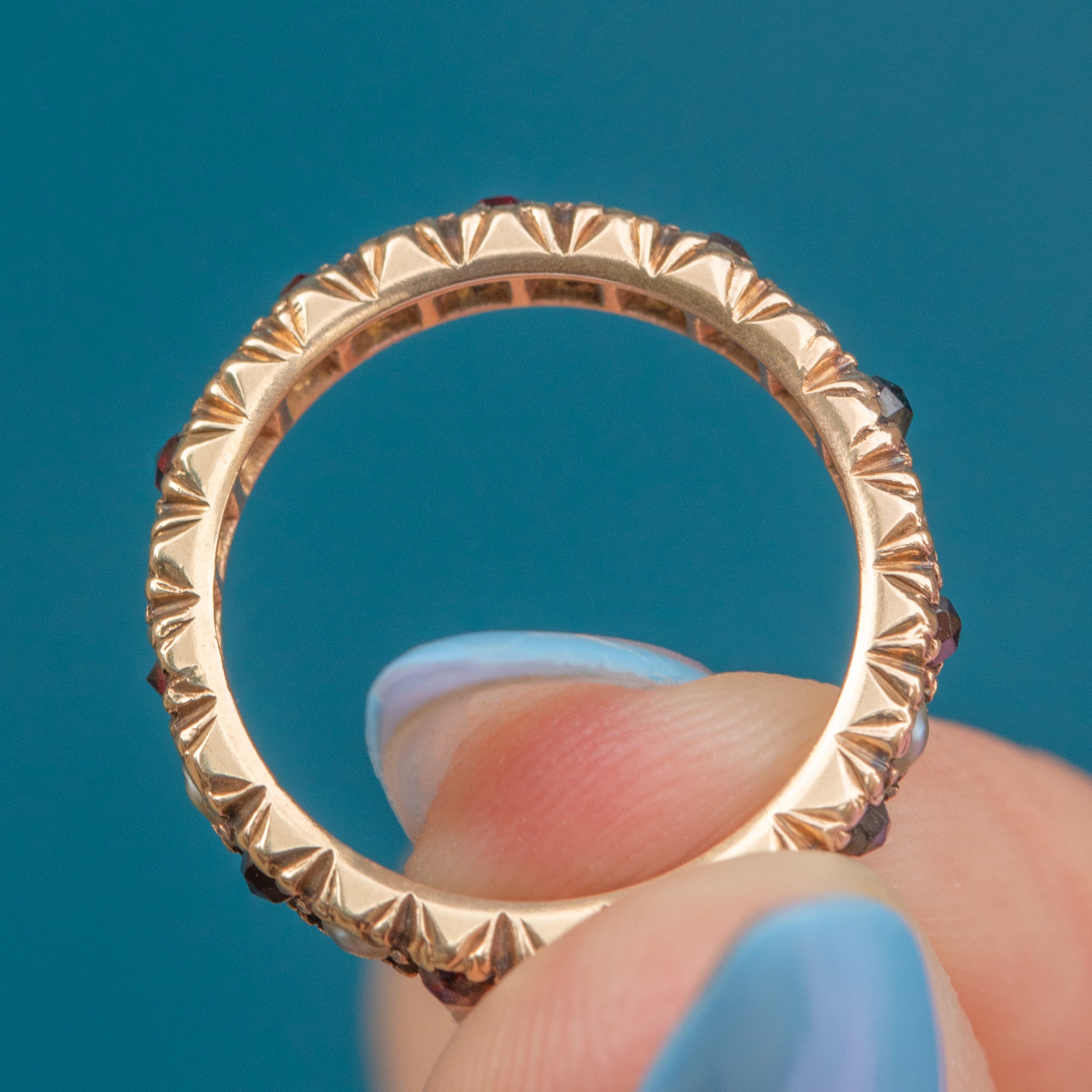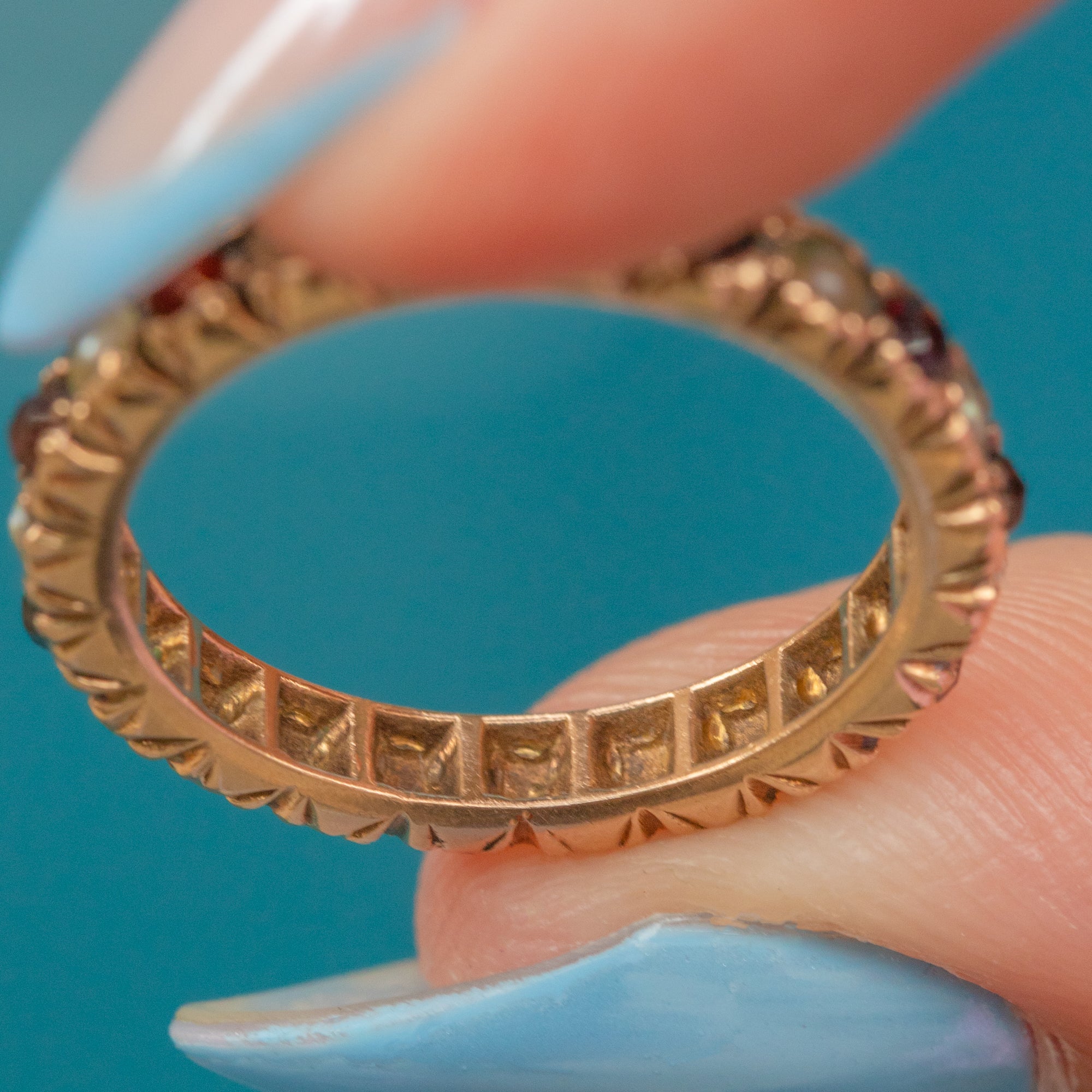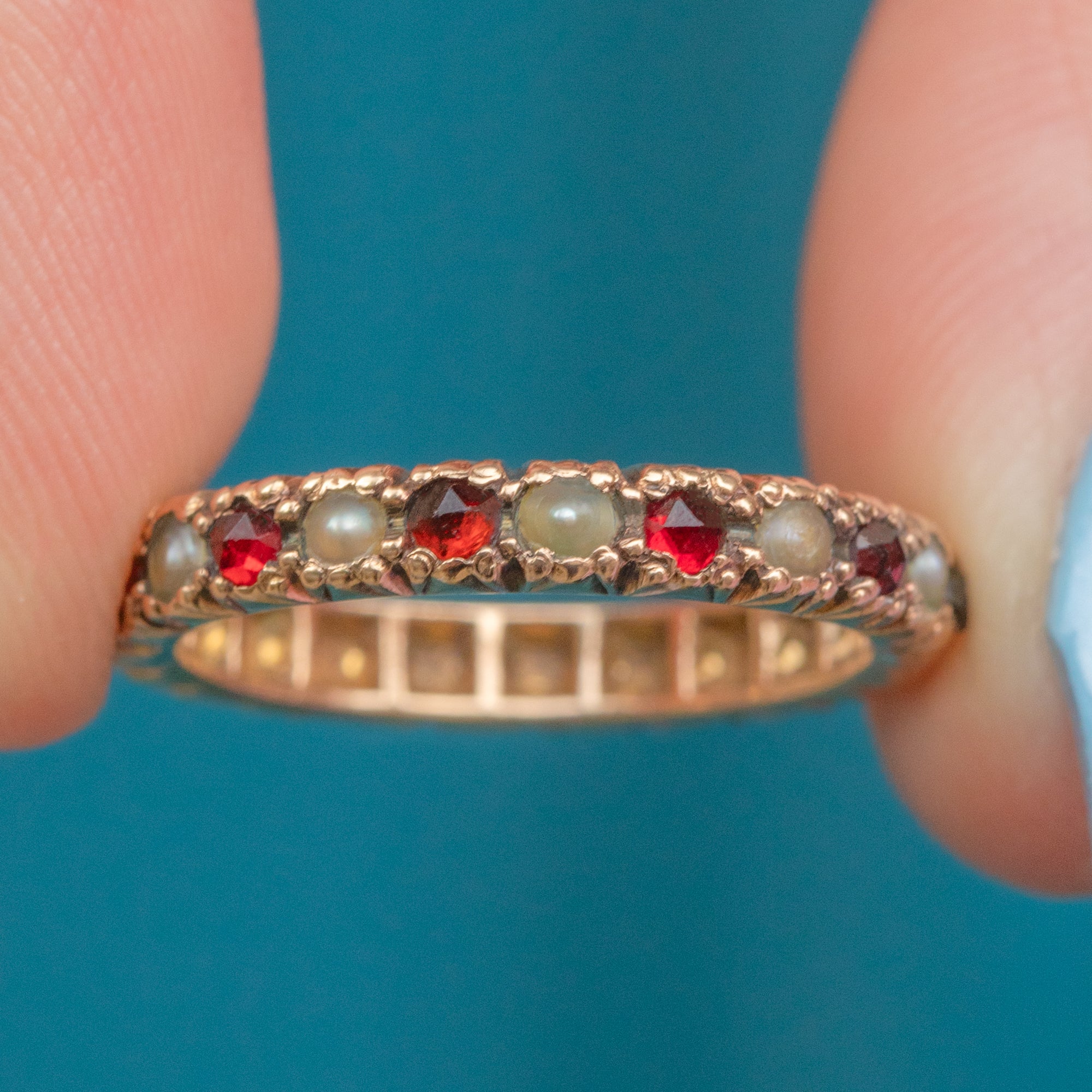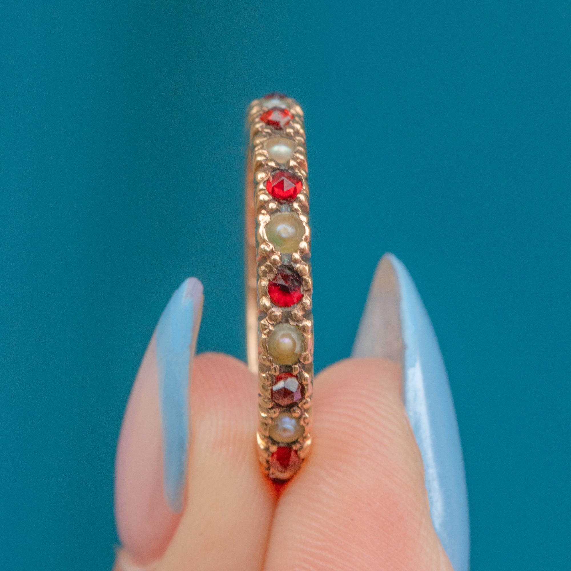 This antique 9ct Gold eternity ring features a full set of 22 alternating Garnets and Pearls, each possessing a rich cranberry hue and iridescence respectively, and exudes Victorian glamour.