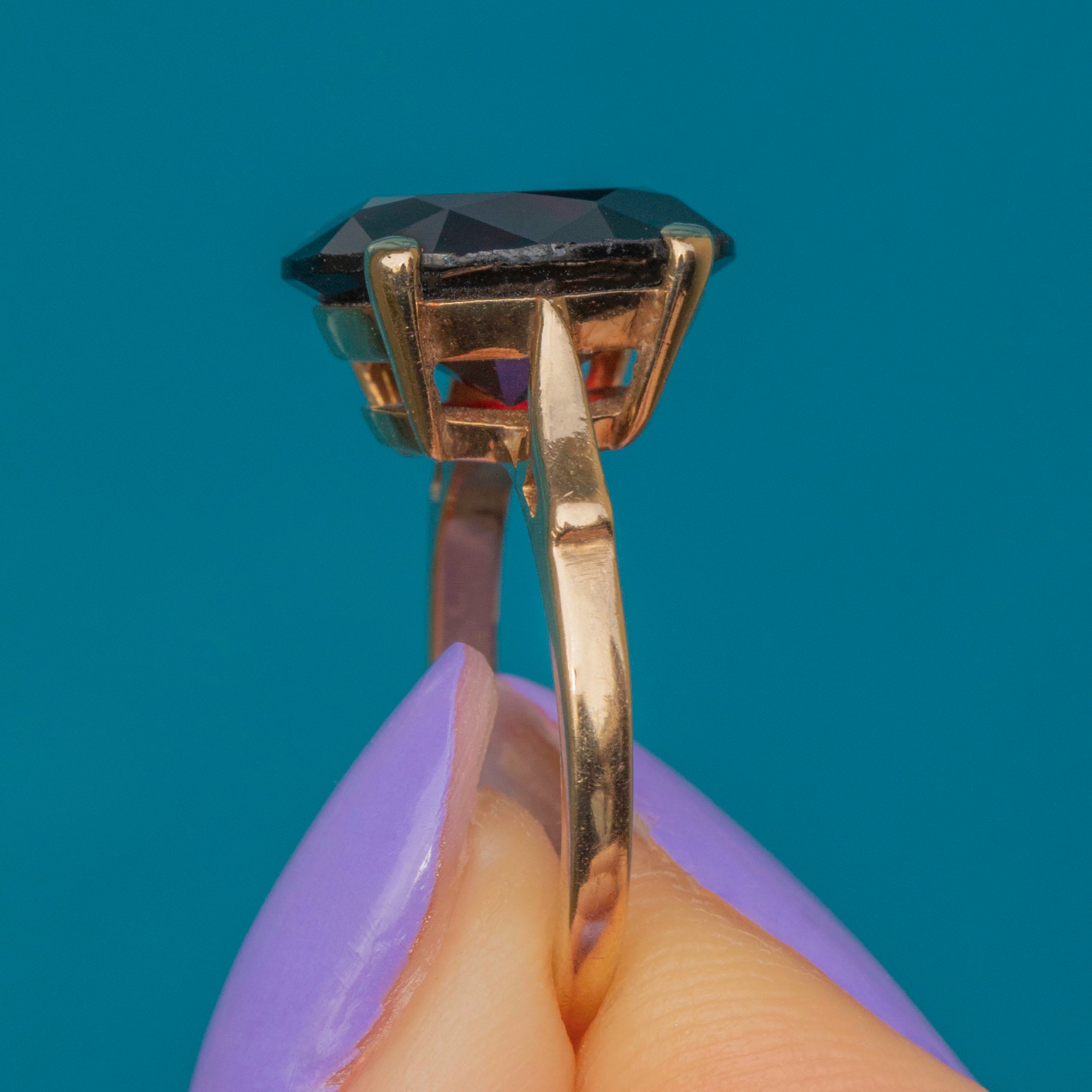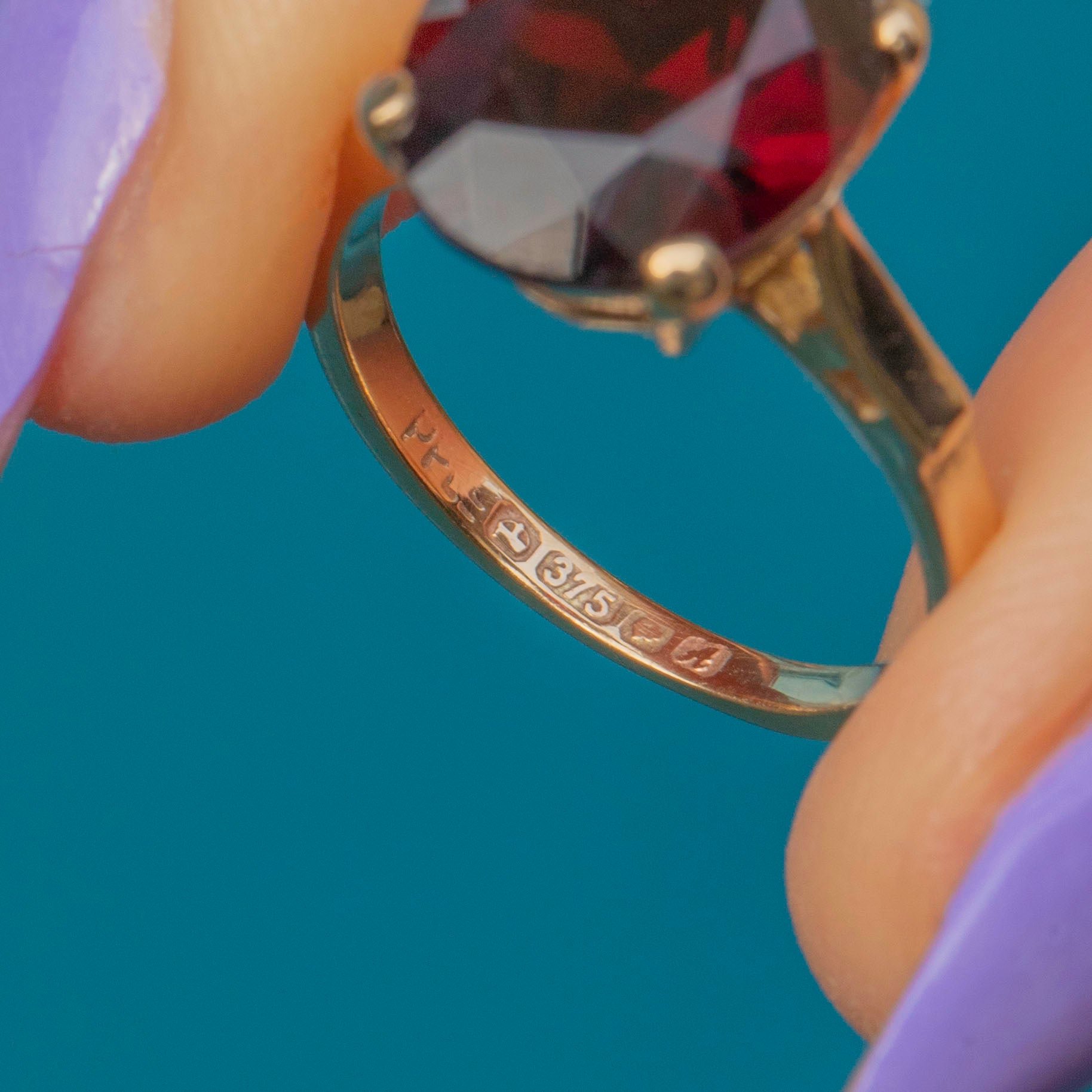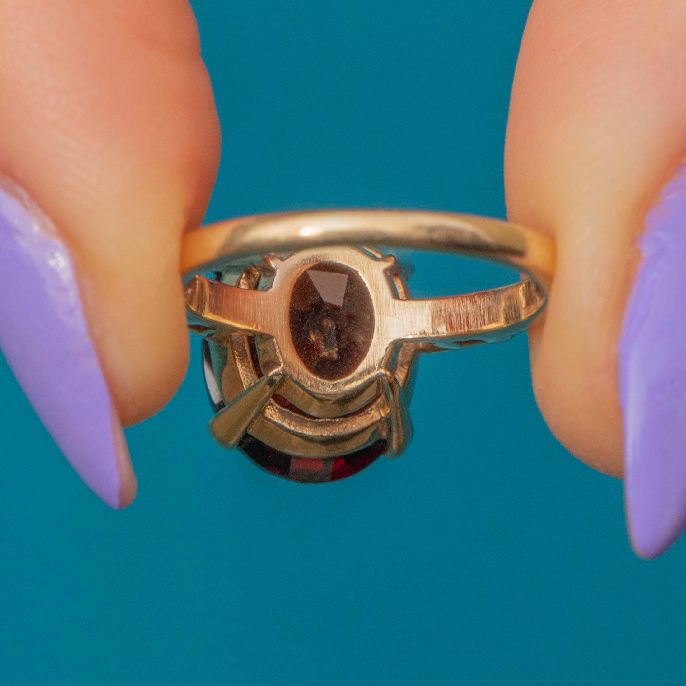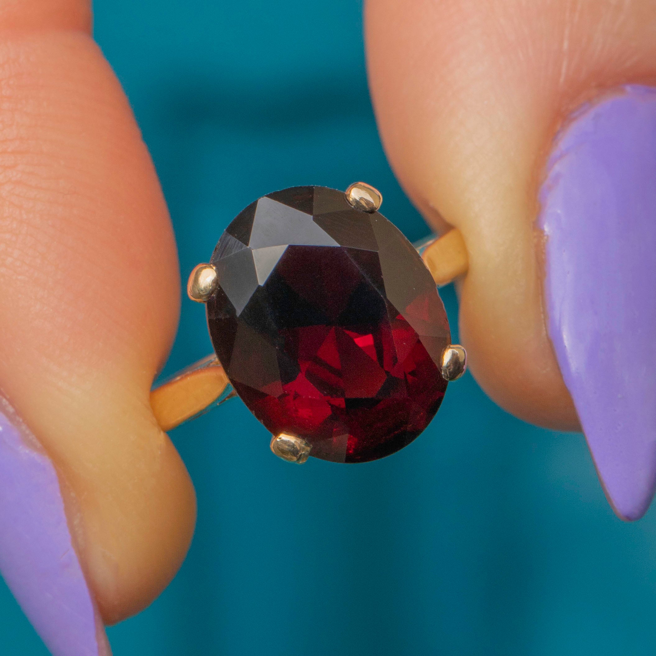 EXCELLENT: The Garnet is in superb condition with crisp facets and no visible chips or abrasions. The Gold band and claws are strong and secure, with only the lightest surface wear consistent with age. A well-preserved Vintage ring, ready to wear and enjoy.