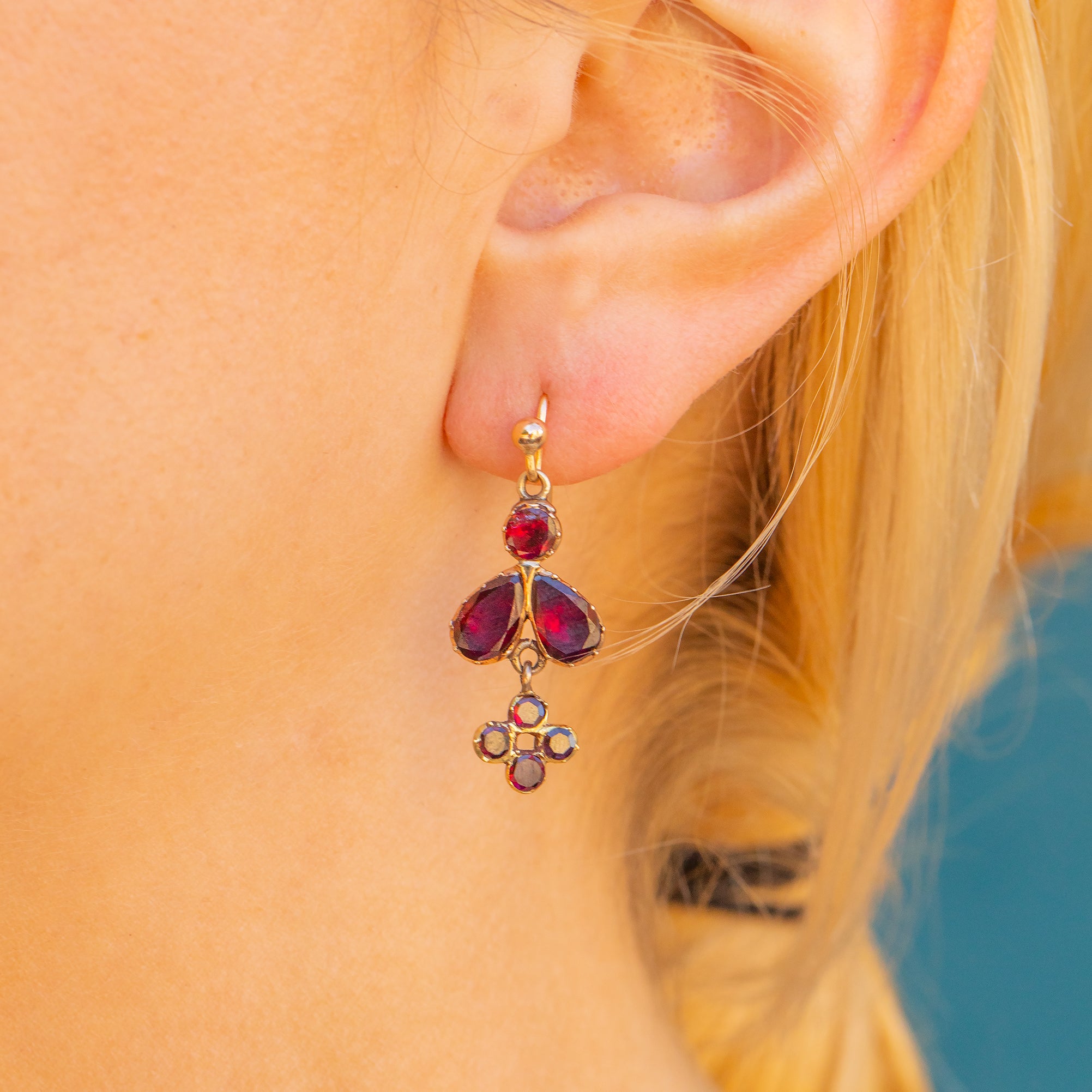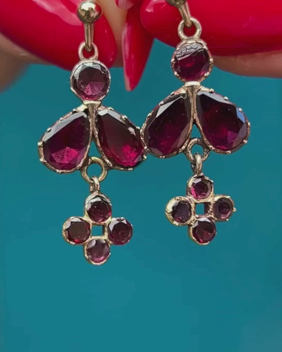 VERY GOOD. These Georgian 9ct Gold flat-cut Garnet drop earrings are in very good condition. Each component is securely connected and the earrings have maintained a lovely movement. The Garnets are secure within their settings and have a rich vibrance and sparkle. One of the top Garnets has a small hairline crack, but this is only noticeable under close inspection. With later added ear hooks, these Garnet drop earrings wear like a dream!