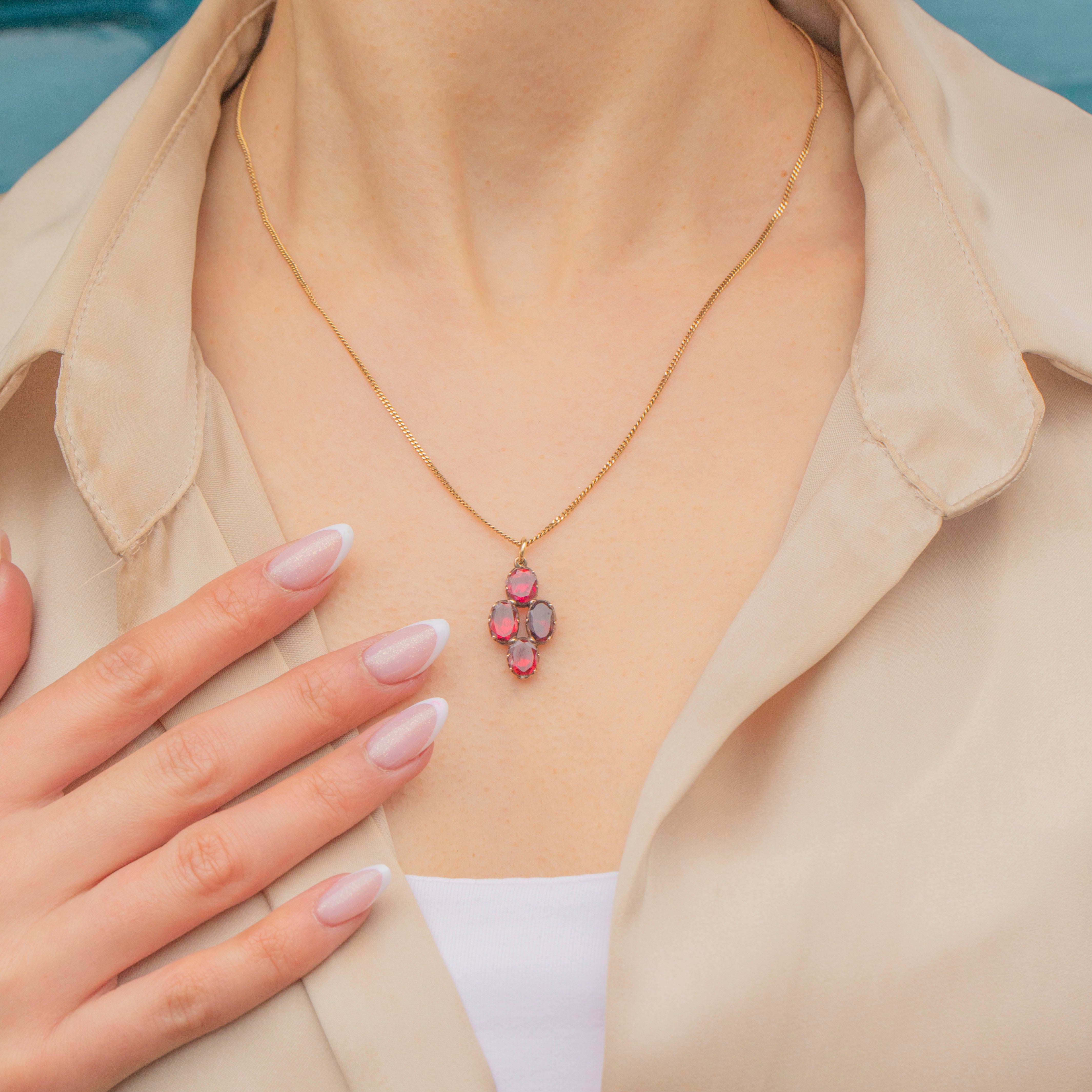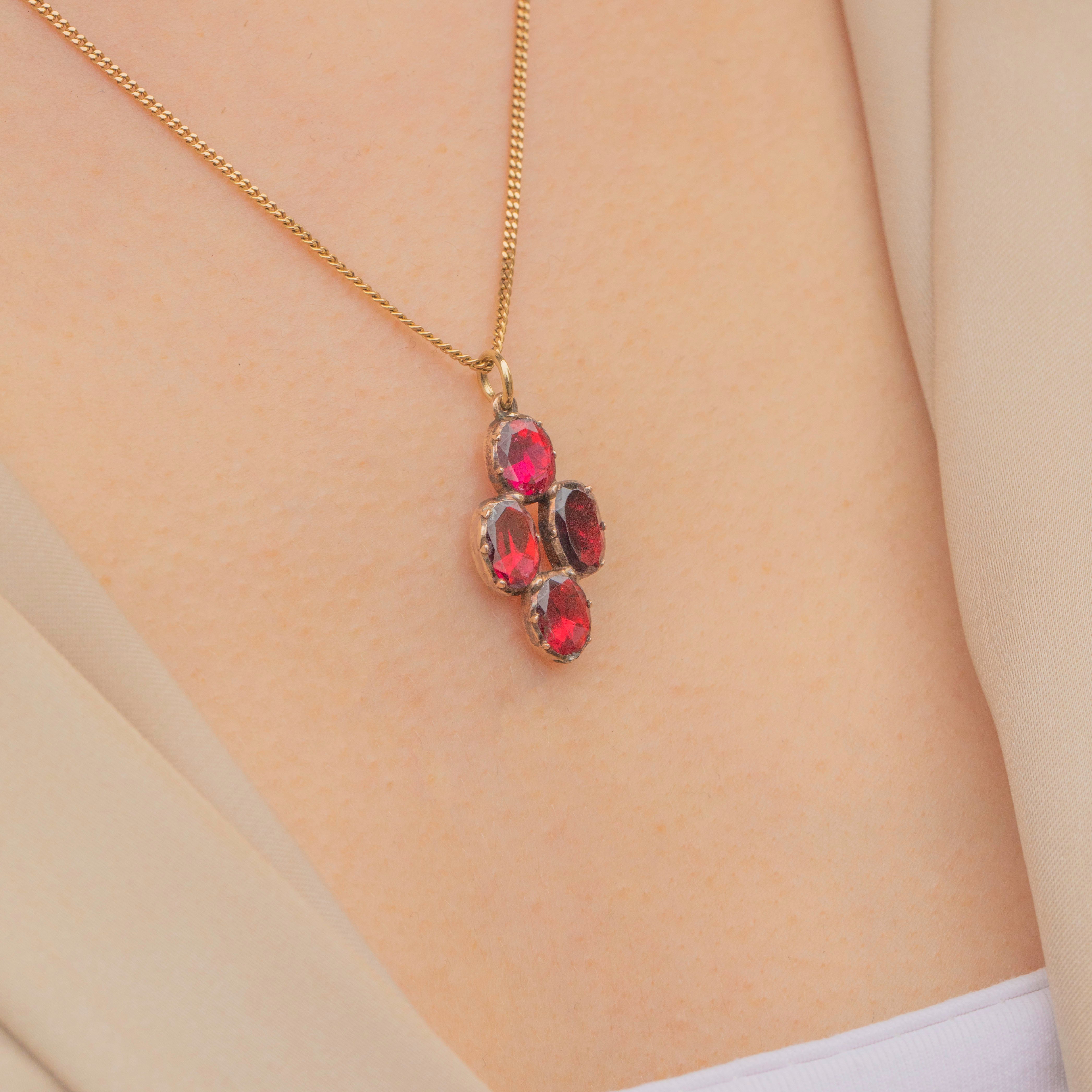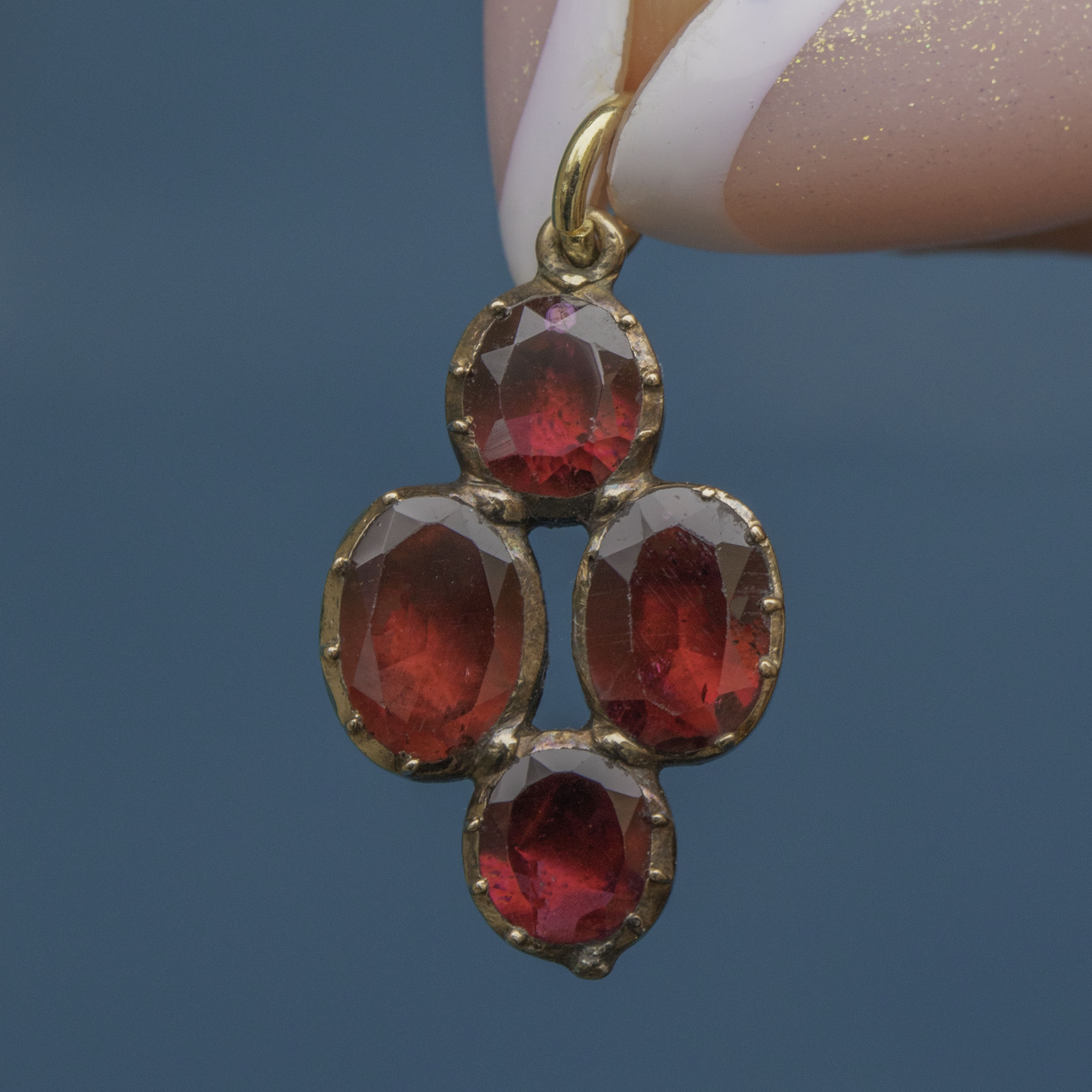 What a stunning 9ct Gold Georgian Garnet Charm—a true treat for the eyes! Adorned with a quartet of rich flat-cut Garnets, she forms an elegant diamond shape, glowing with deep crimson tones, a bunch of tantalising berries that are good enough to eat!