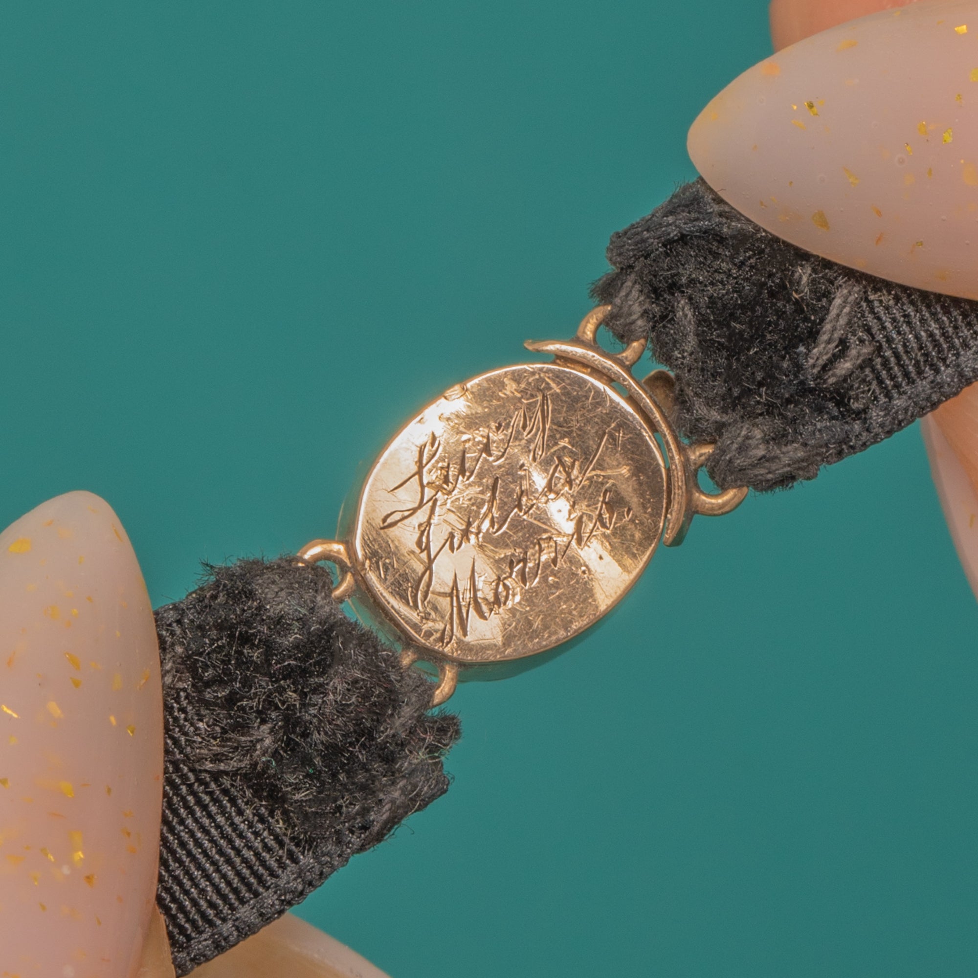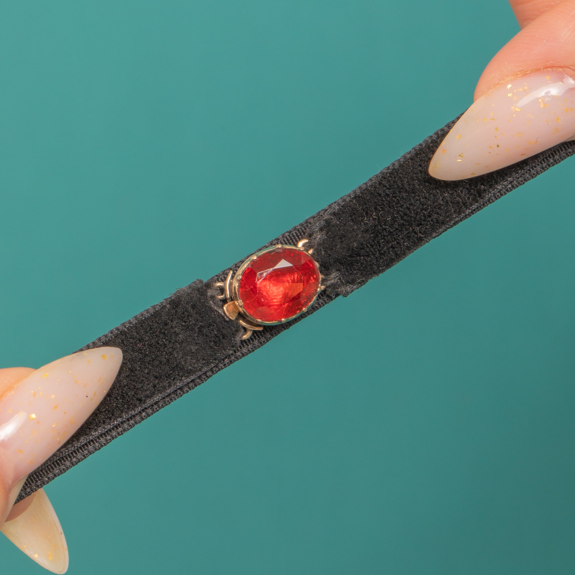 A beautifully simple and evocative Georgian black velvet ribbon choker centred by a deep, wine-red Garnet clasp. The rich hue of the oval faceted Garnet is heightened by its warm 9ct Gold setting, creating an elegant play of colour and light that sits delicately at the throat.