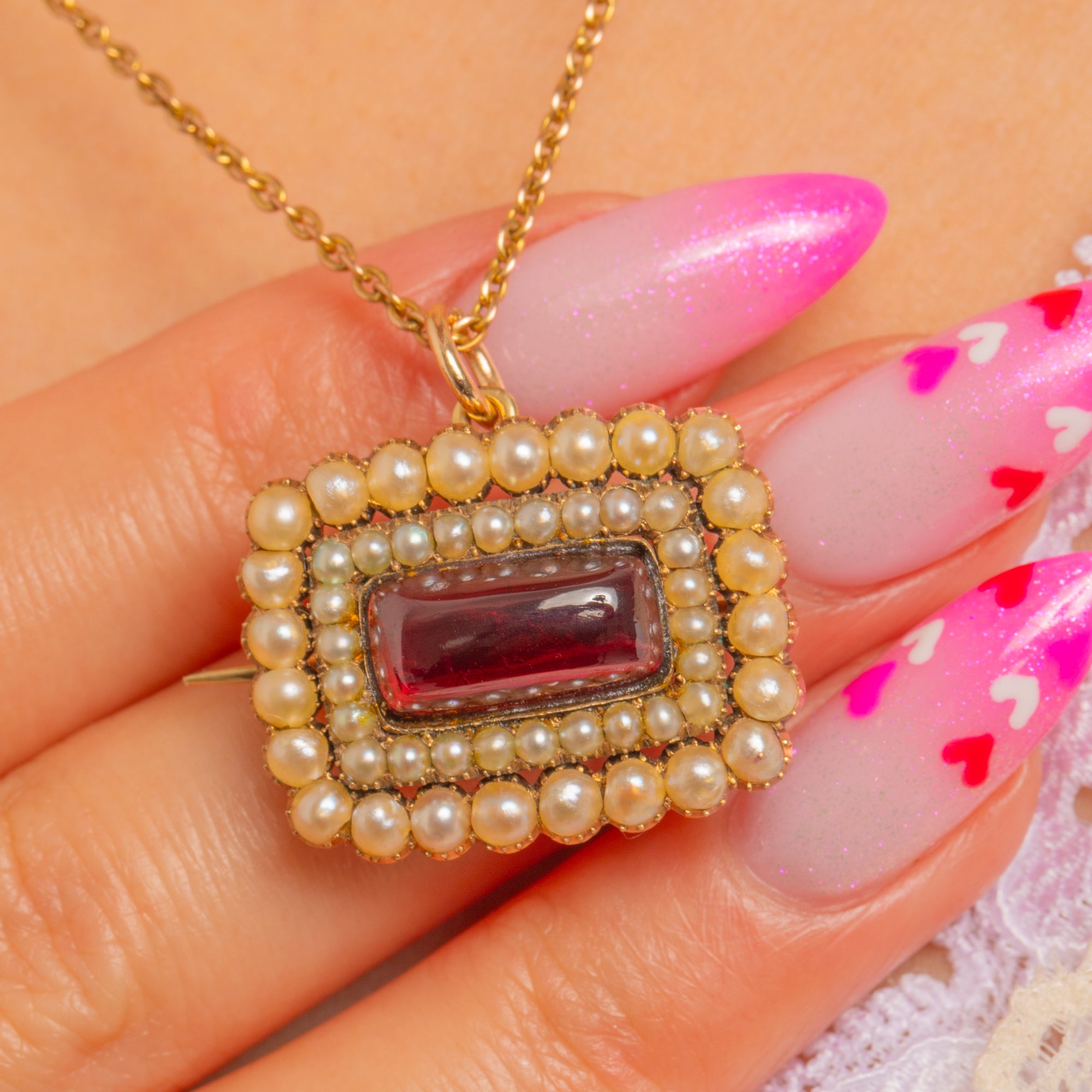 Georgian時代のロマンスを象徴するこのロケットペンダントは、濃密な色彩を湛えたシュガーローフ・ガーネットを中央に据え、その高いドームが、柔らかな光沢を放つ天然真珠の輪に包まれています。温かみのある9金で手作業により仕立てられた長方形のシルエットと、隙間なく並べられた真珠が、光と質感の美しい調和を生み出し、19世紀初頭の洗練された優雅さを体現しています。