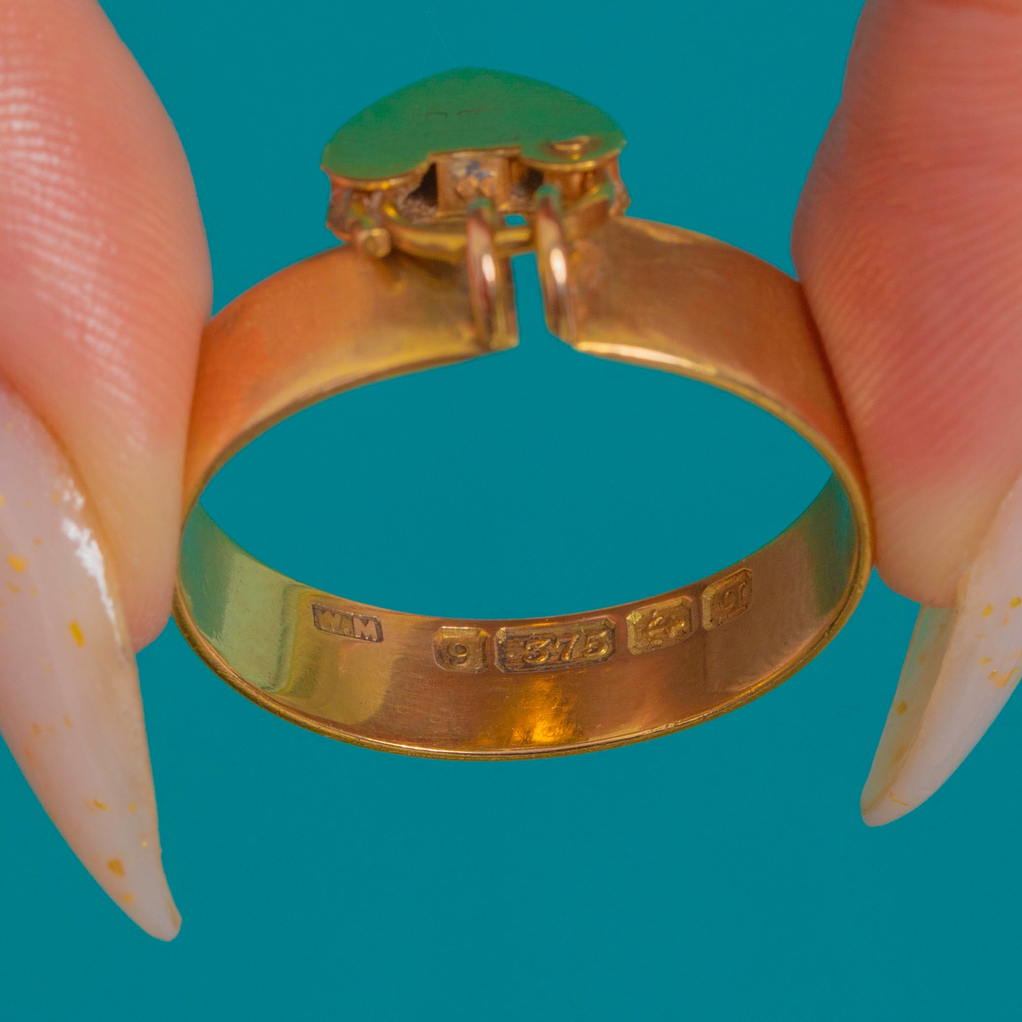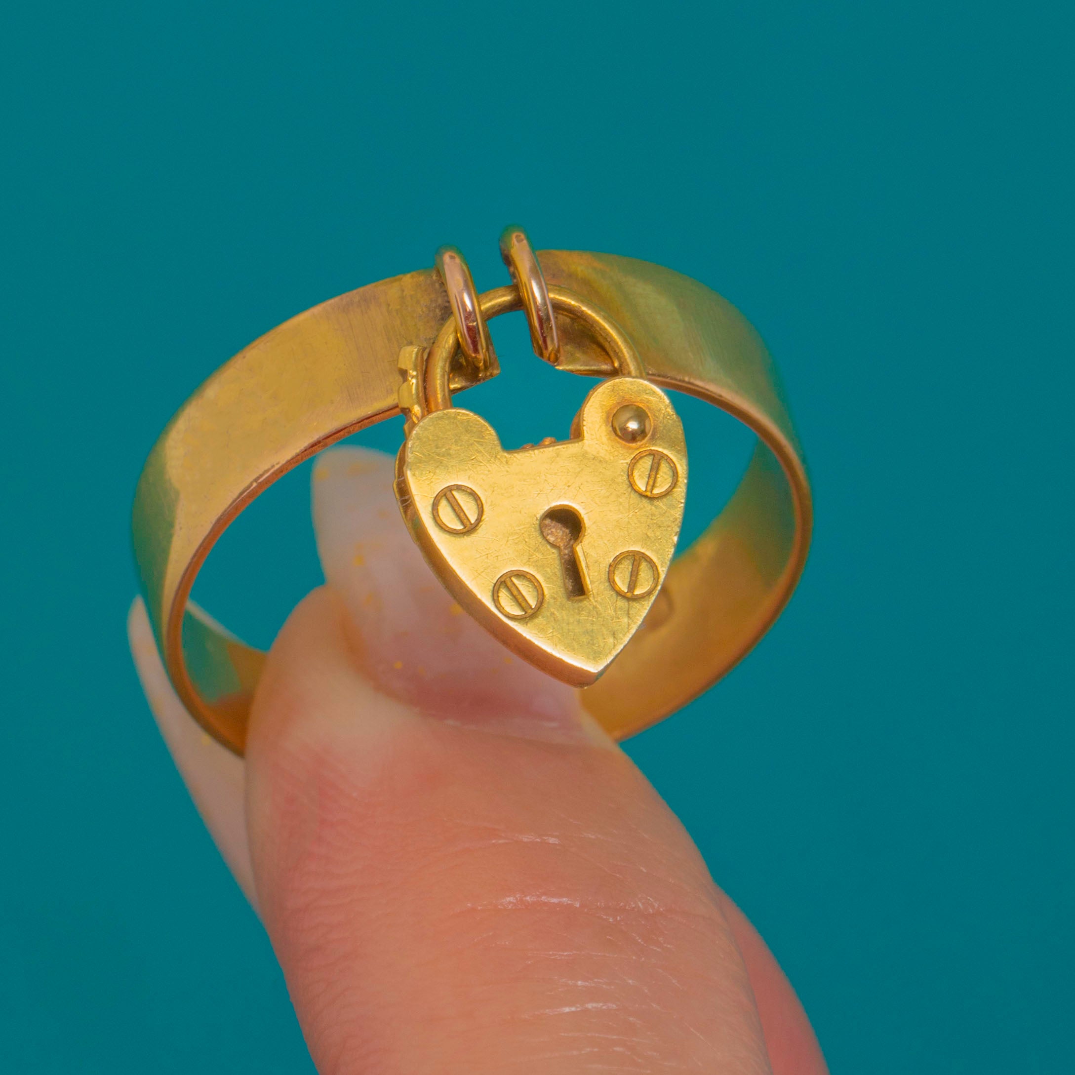 Sweet, symbolic and wonderfully wearable, this 9ct Gold heart padlock ring captures the language of love in a sleek, everyday silhouette. The polished flat band is adorned with a dainty articulated heart, detailed with a tiny keyhole and neat rivet motifs for that authentic love‑token charm.