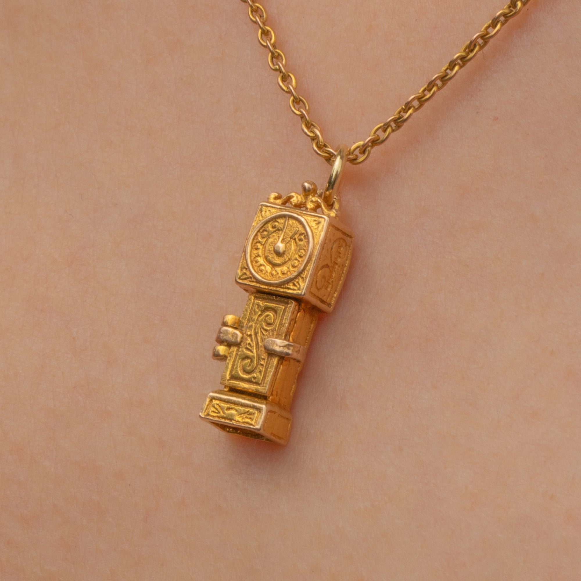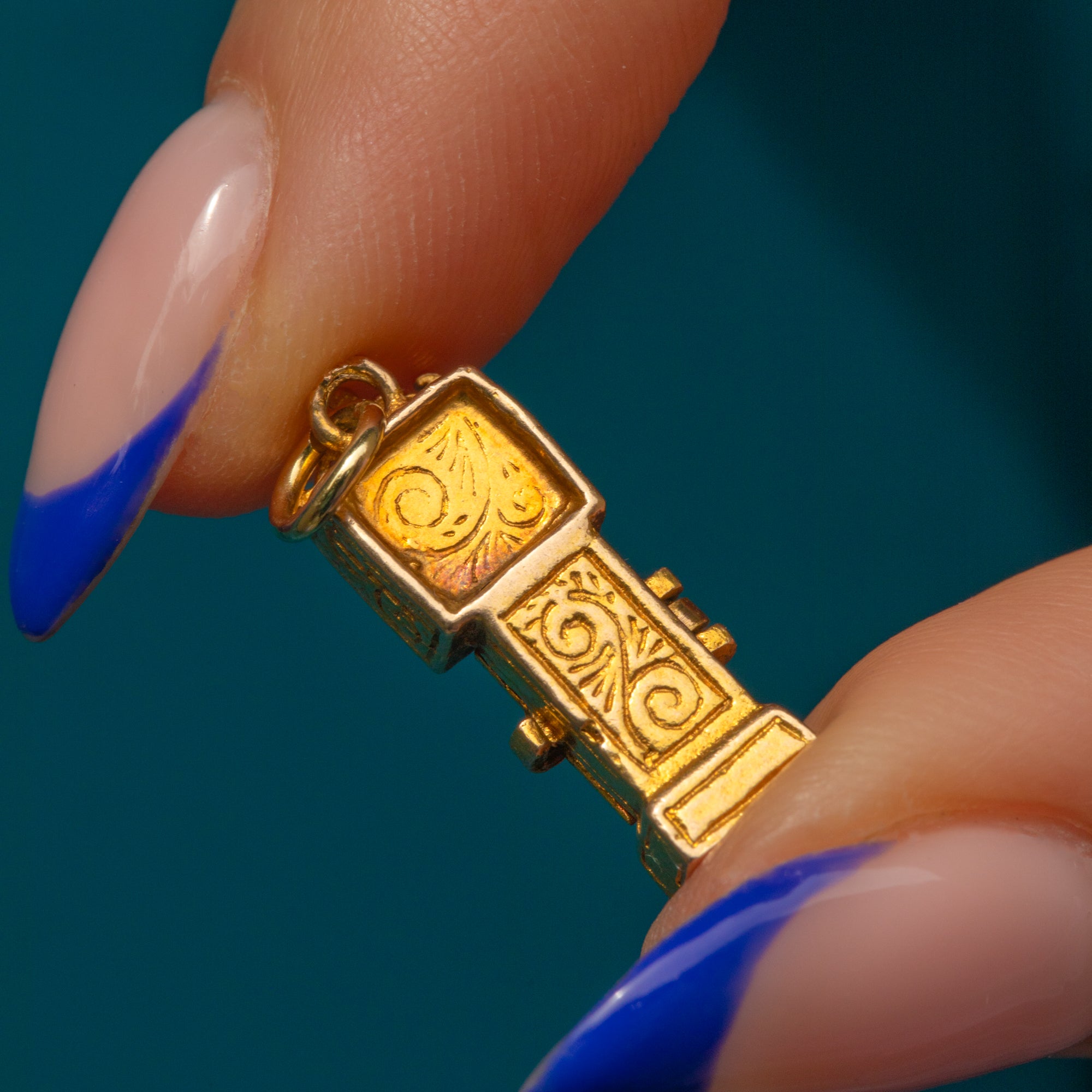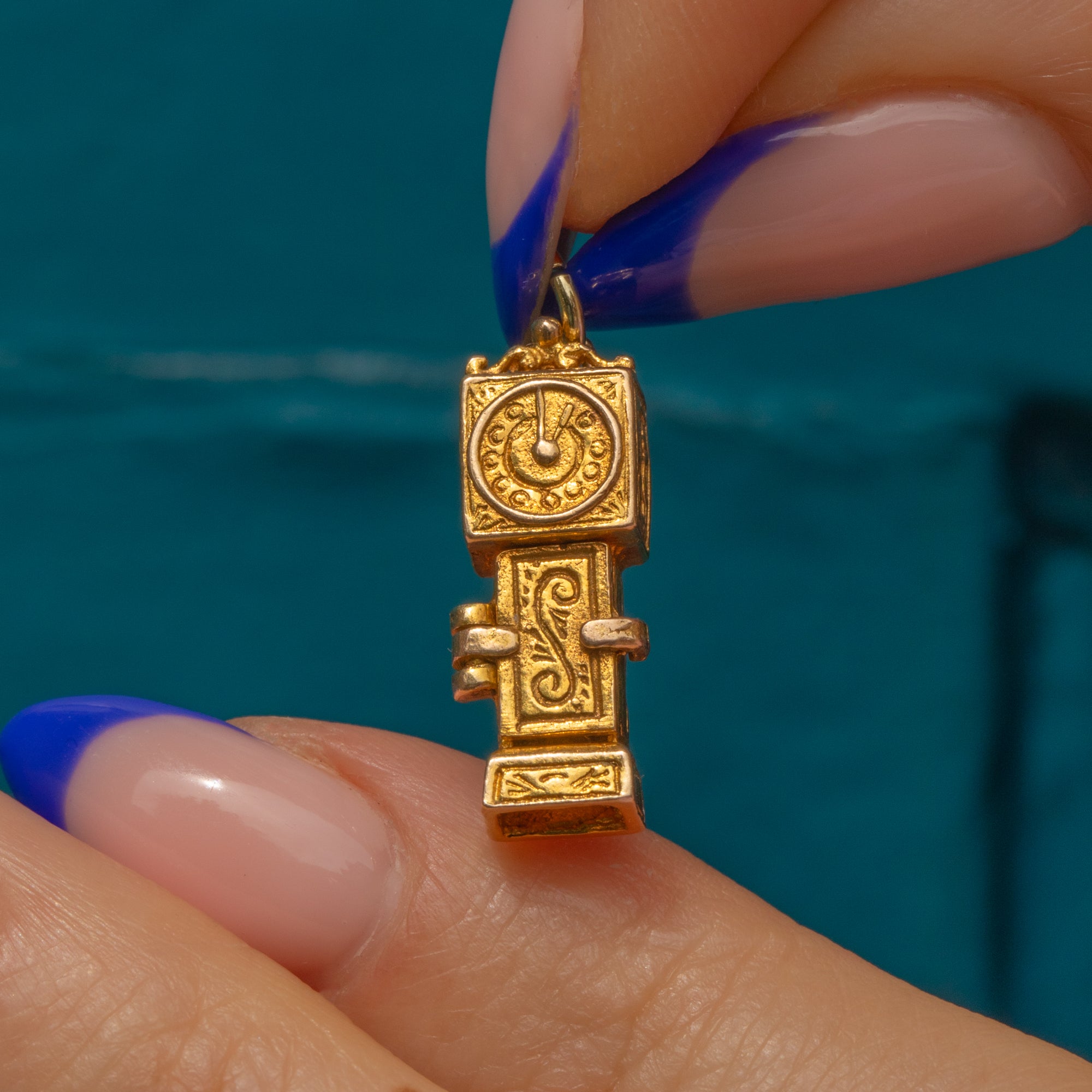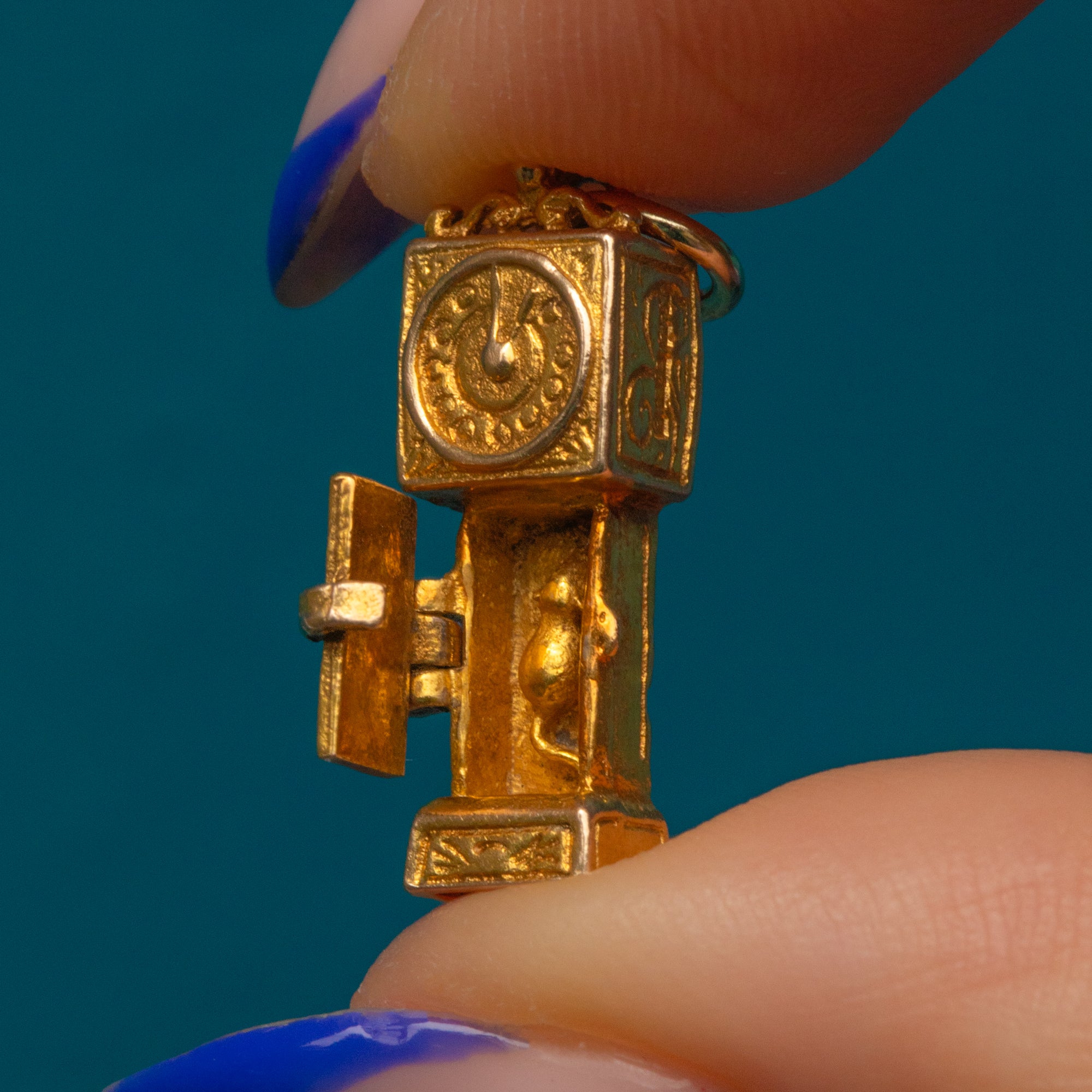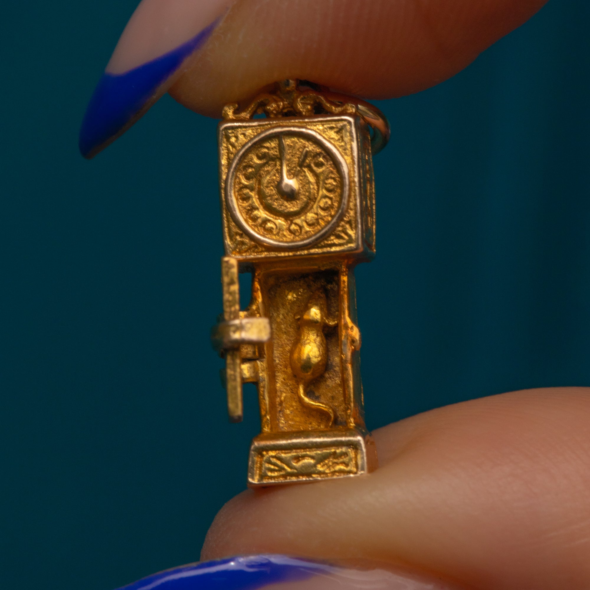 EXCELLENT. This 9ct Gold hickory dickory dock clock charm is ready to be worn and enjoyed straight from the box. The piece is fully hallmarked and the centre opens up to reveal a little mouse inside. This treasure has been beautifully engraved and can be cherished for decades more.