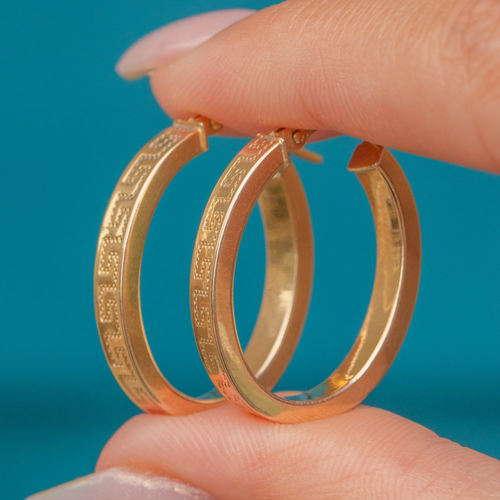 EXCELLENT: The Gold is bright and glossy, and the engravings have remained crisp. With the clasps in perfect working order, these hoops can be worn with utmost confidence.