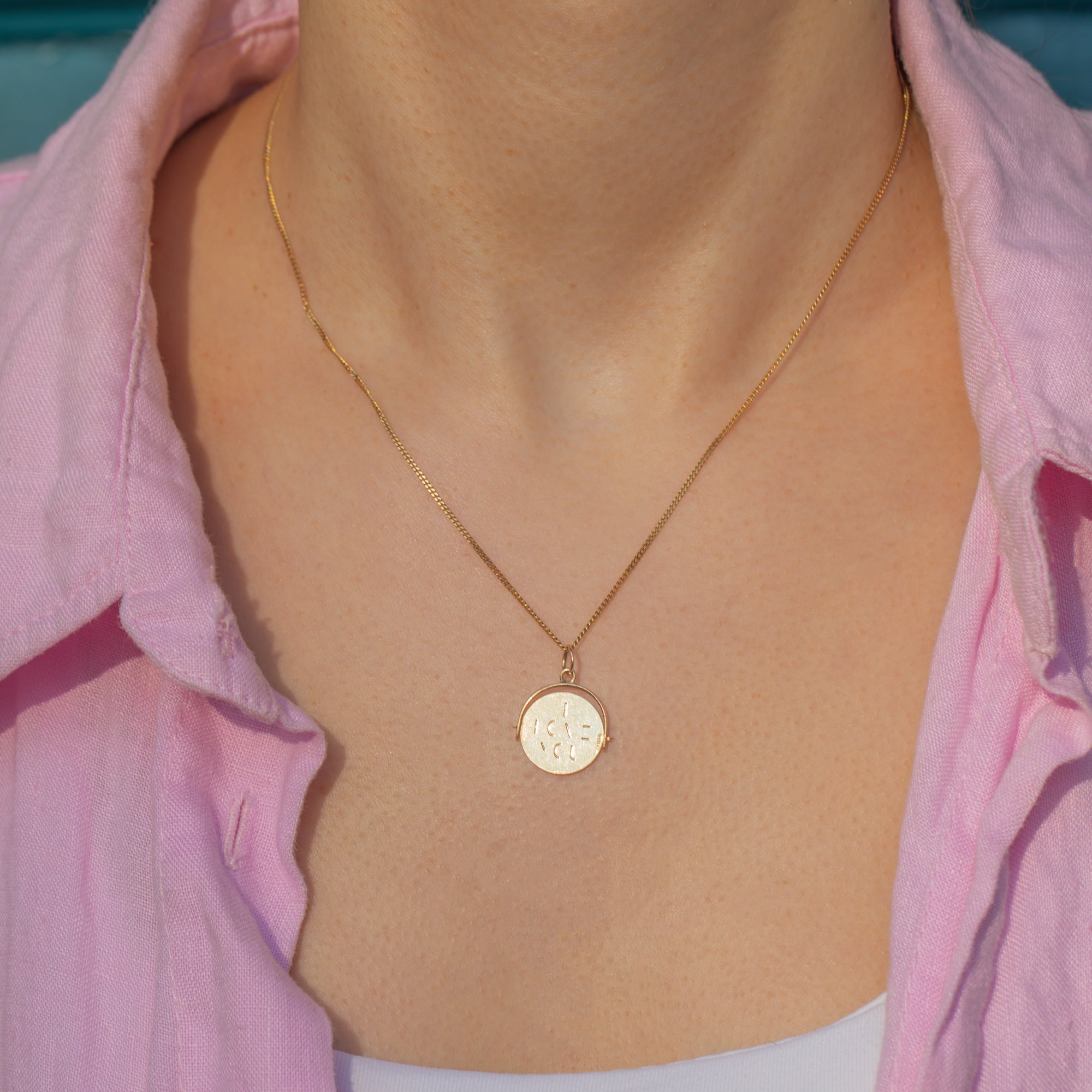 If you are looking for the perfect love token, look no further than this 9ct Gold I Love You spinner charm! A lovely tactile piece, this vintage charm features a freely spinning disc that spells out the word "I love you" when in motion.