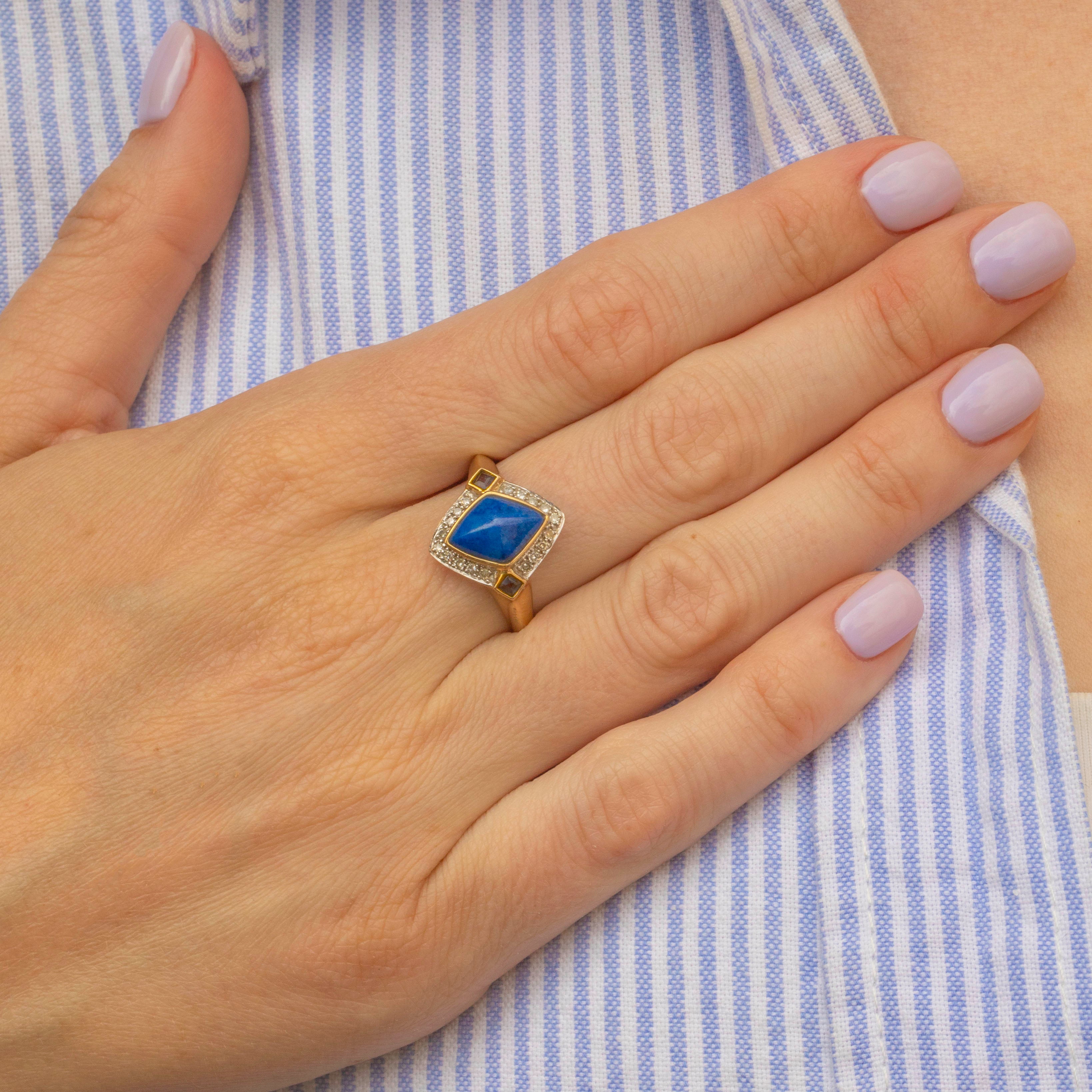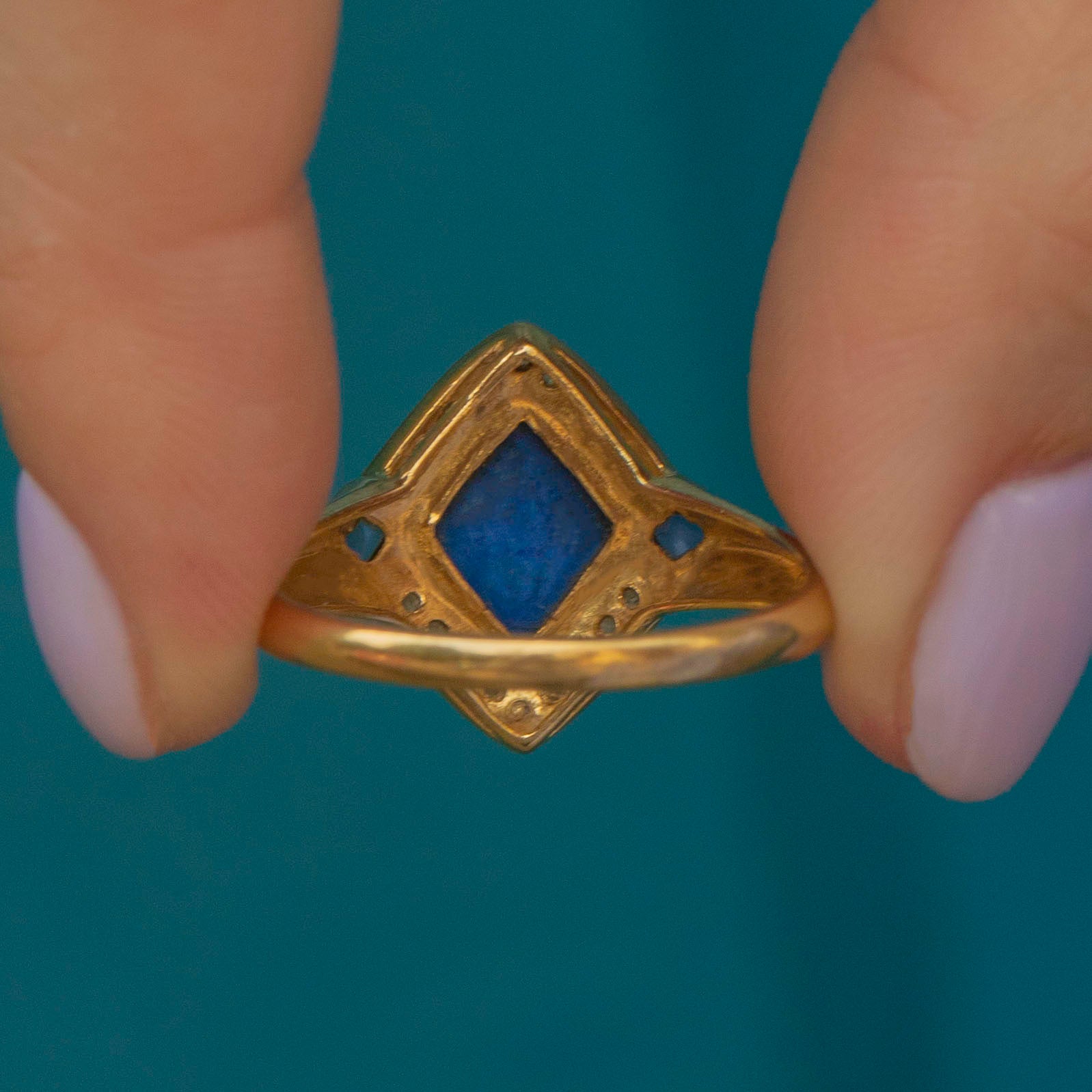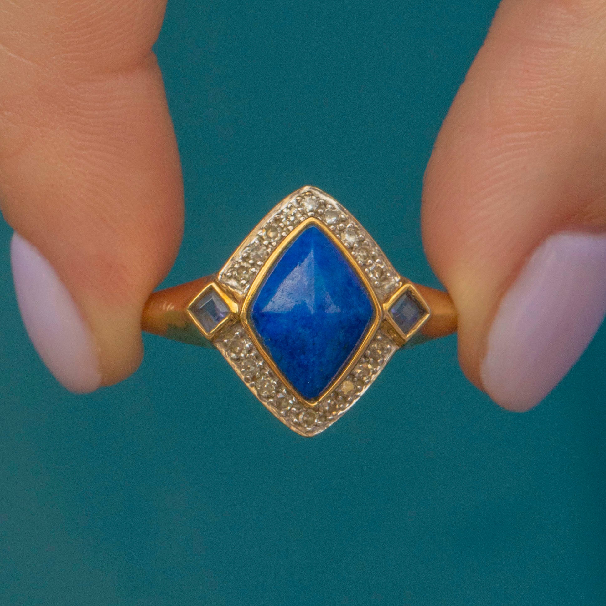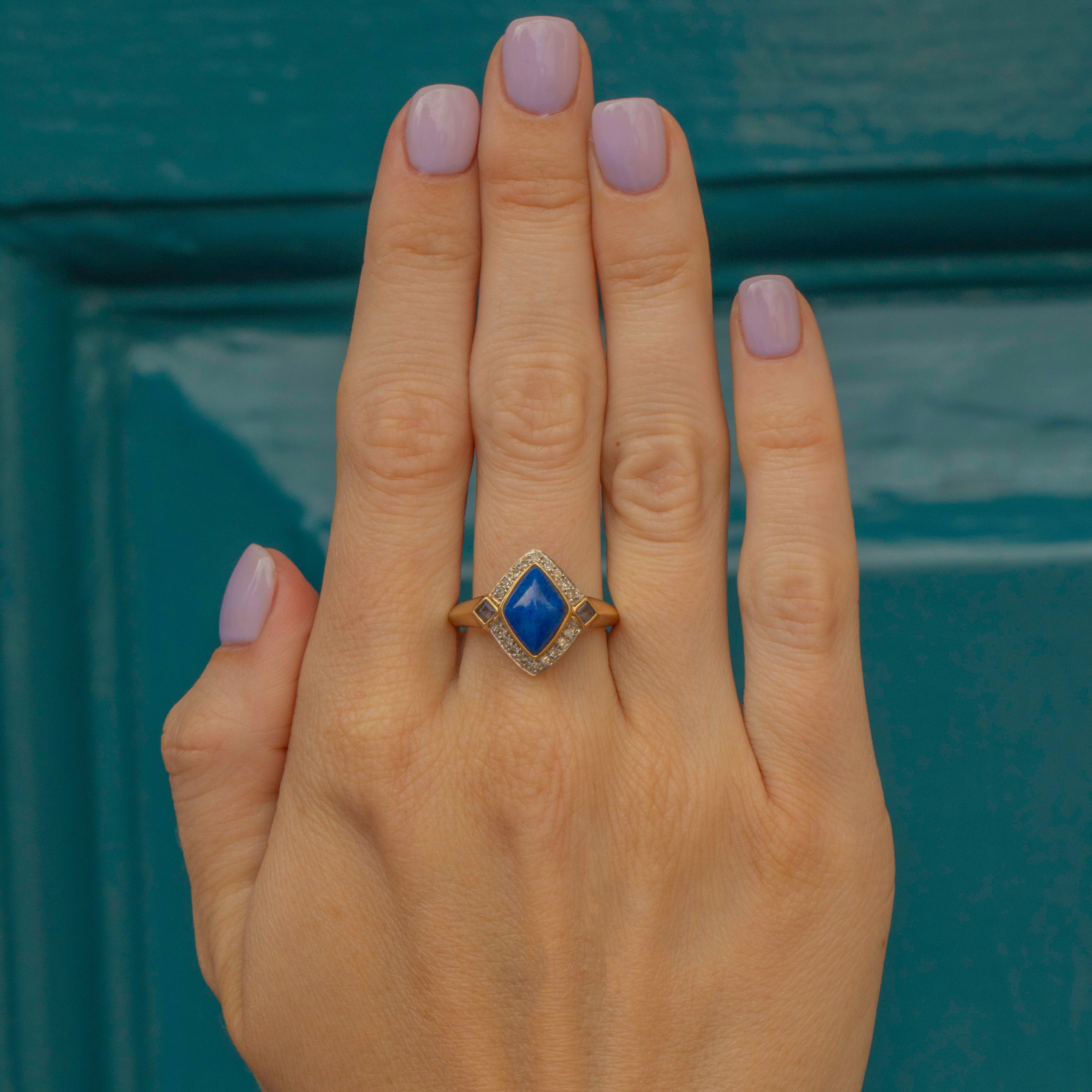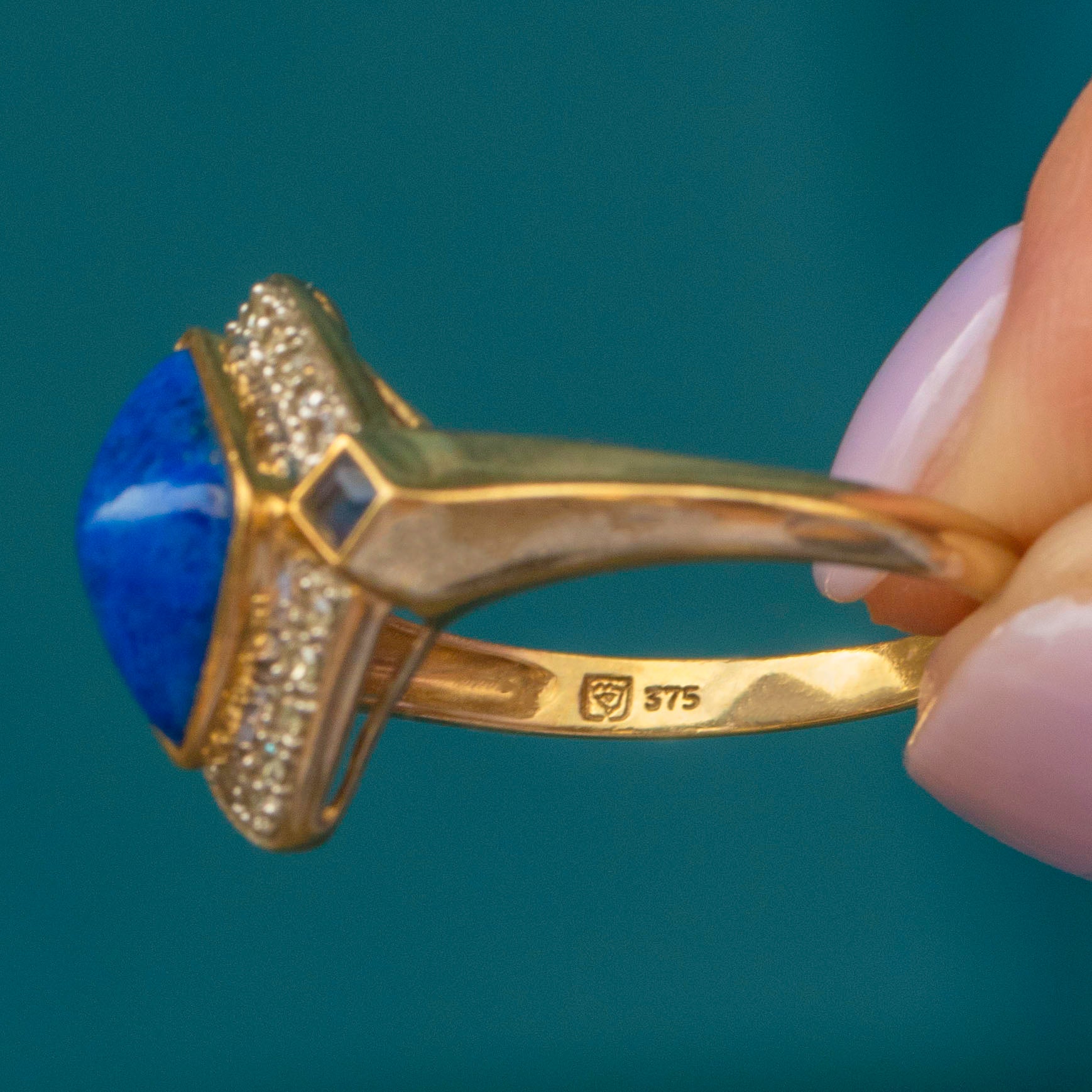 A fabulous 9ct Gold Lapis Lazuli Diamond cluster ring! This unique lozenge shaped ring is sure to add a statement to your collection, with a large cobalt blue Lapis Lazuli gemstone surrounded by twinkling Diamonds.
