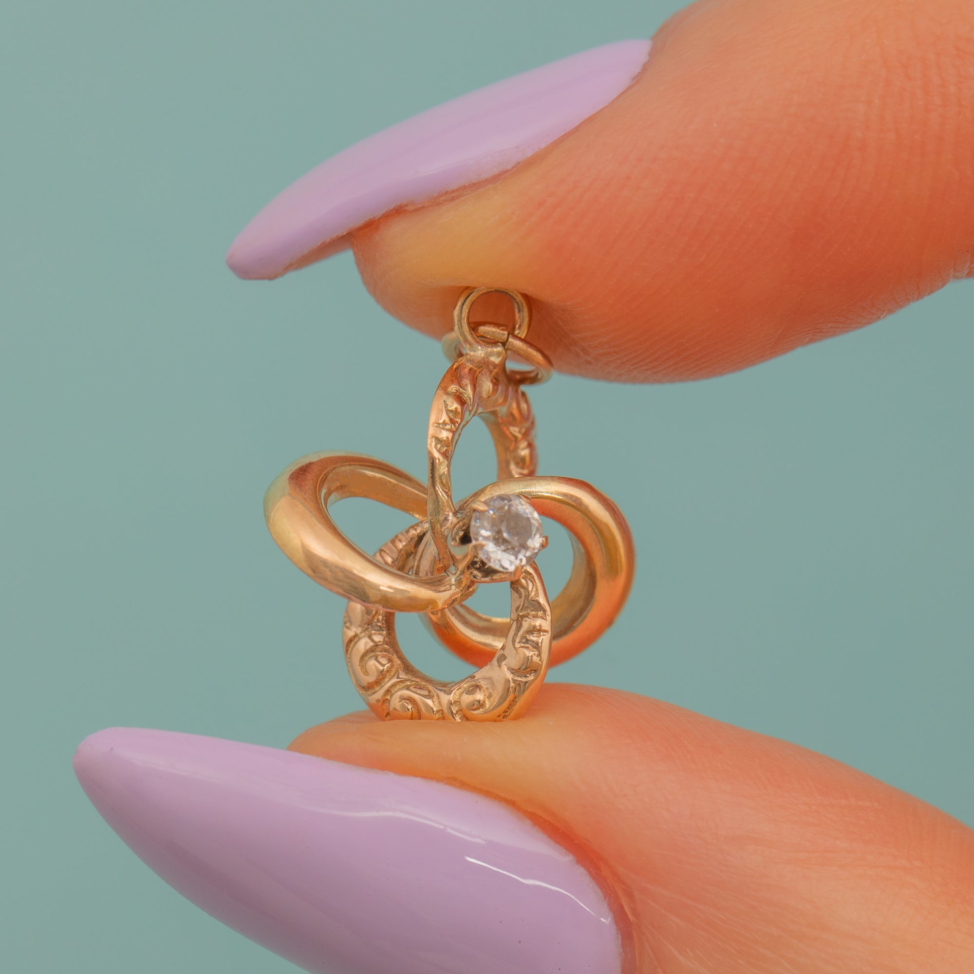 Simply suspend her from a fine chain and this romantic vintage lover's knot charm will rest delicately upon your décolletage!