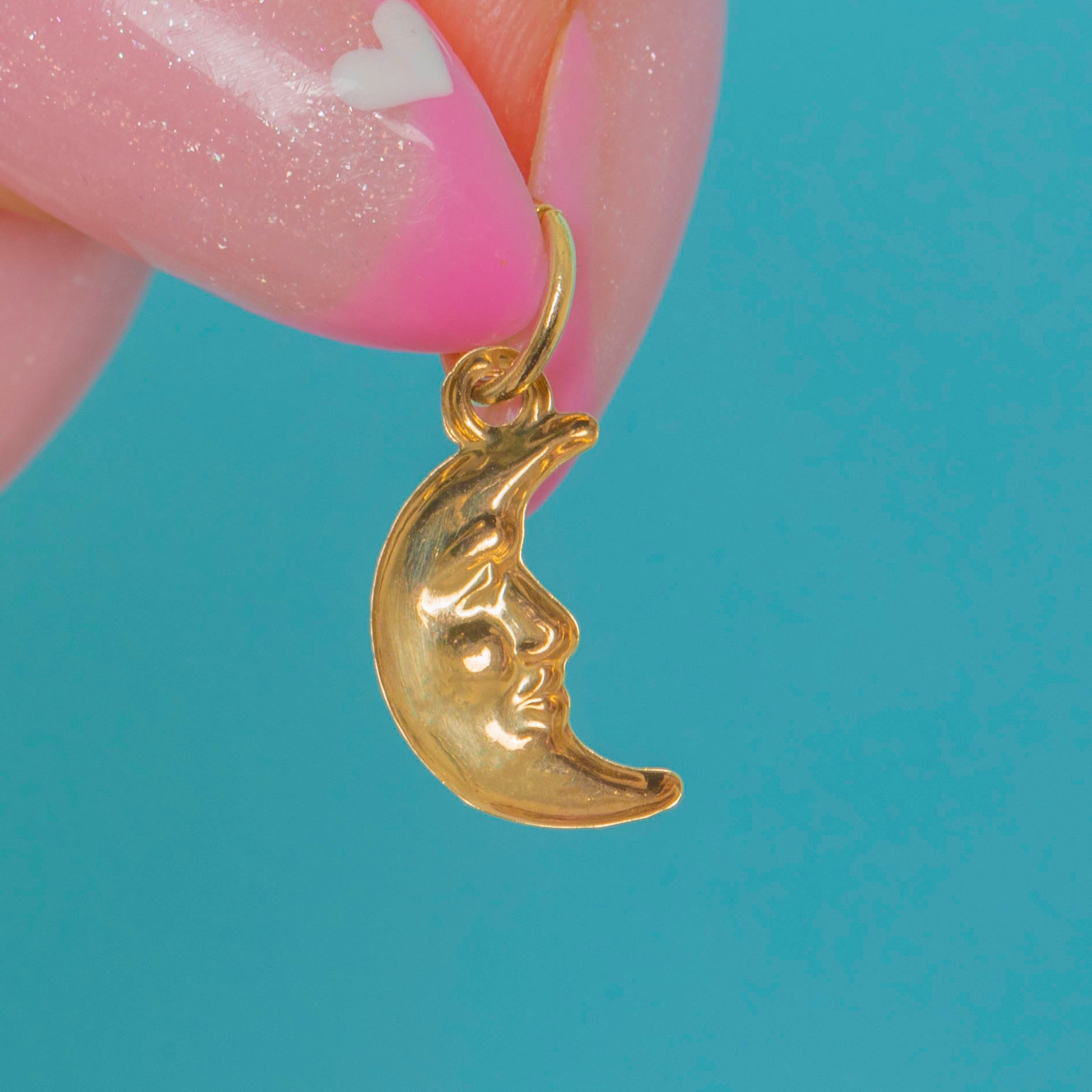 A dainty 9ct Gold Man-in-the-Moon charm with a sweet celestial motif. Lightly modelled with a serene crescent face, this tiny charm is full of character and charm, a playful nod to the stars that’s perfect for everyday wear.