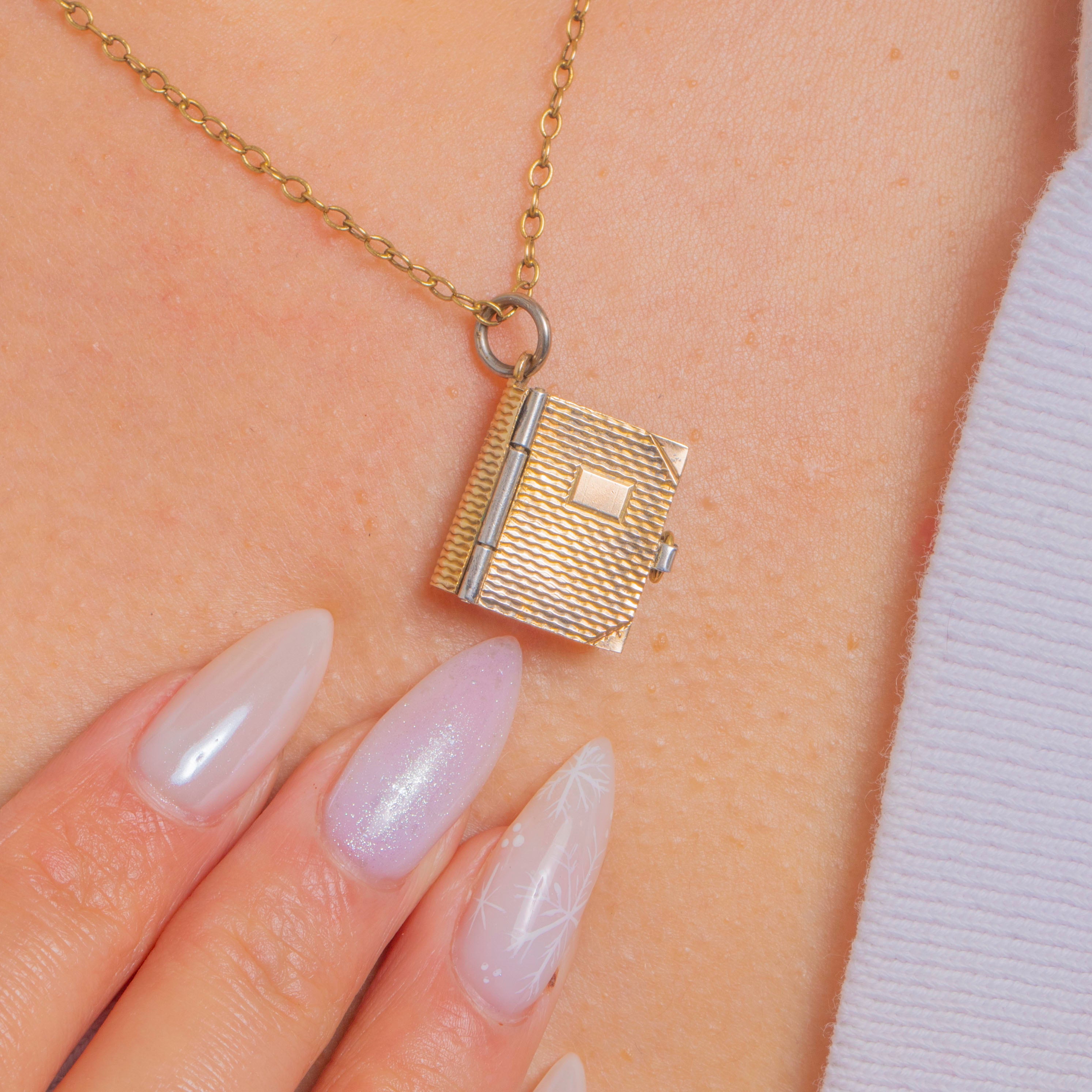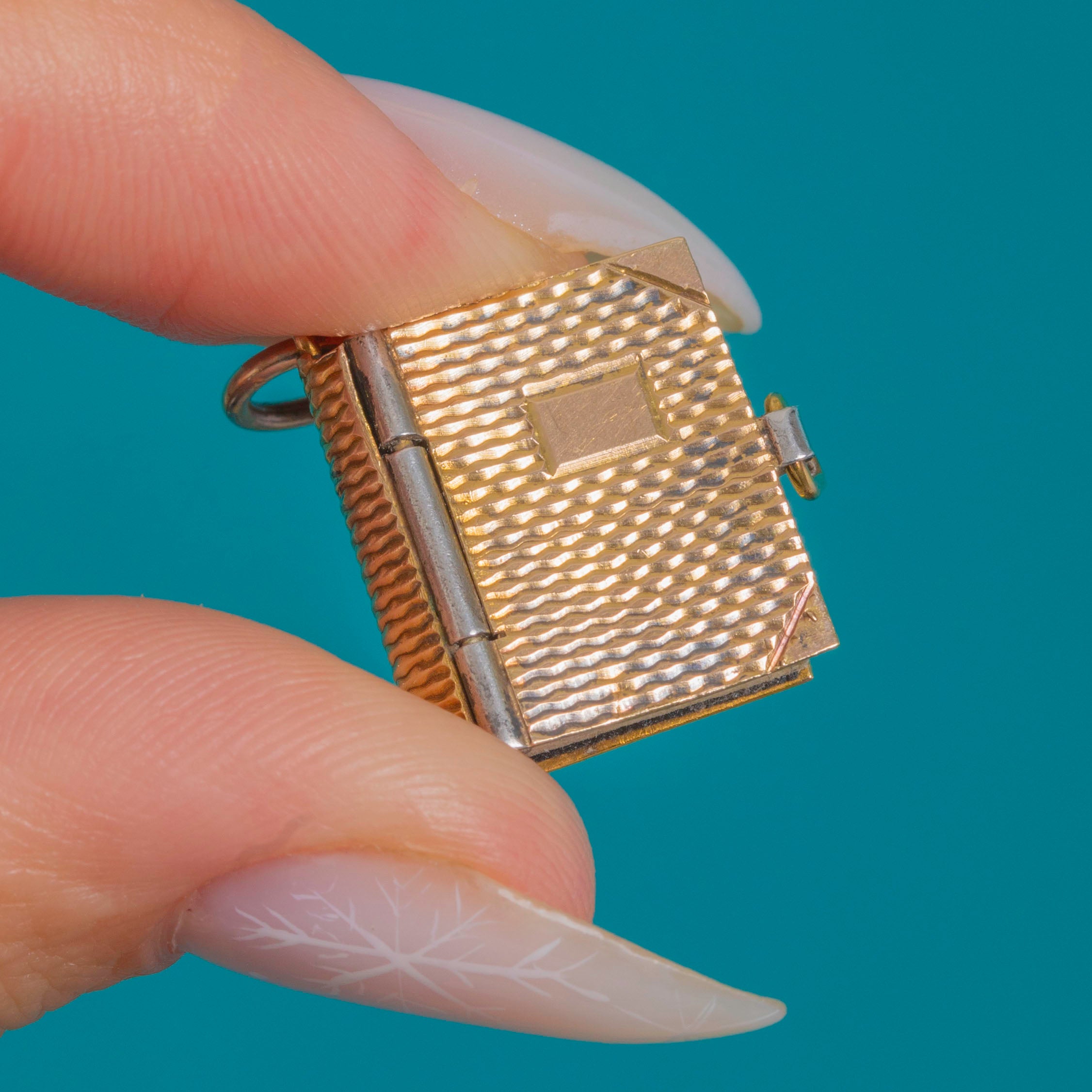 A delightful Victorian 9ct Gold book charm, its petite covers finished with crisp engine-turned detailing and an applied rectangular cartouche for a refined, tailored look. Chamfered corner strap accents frame the design, with a neat side thumb tab that completes the miniature “diary” silhouette with elegant precision.