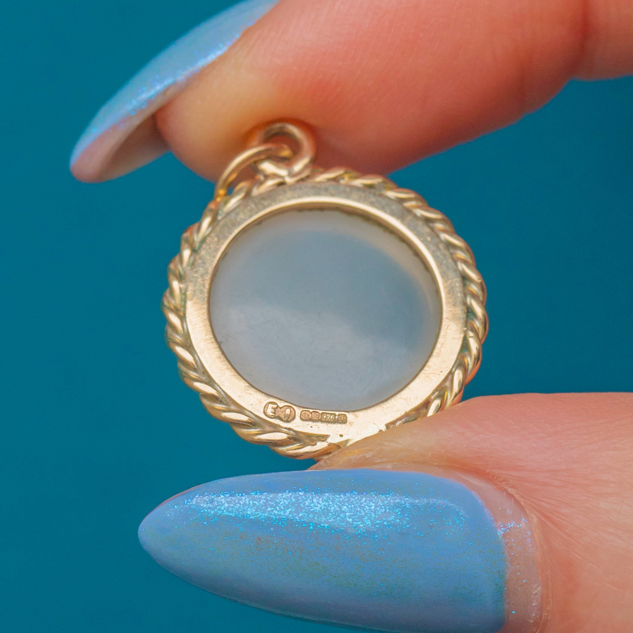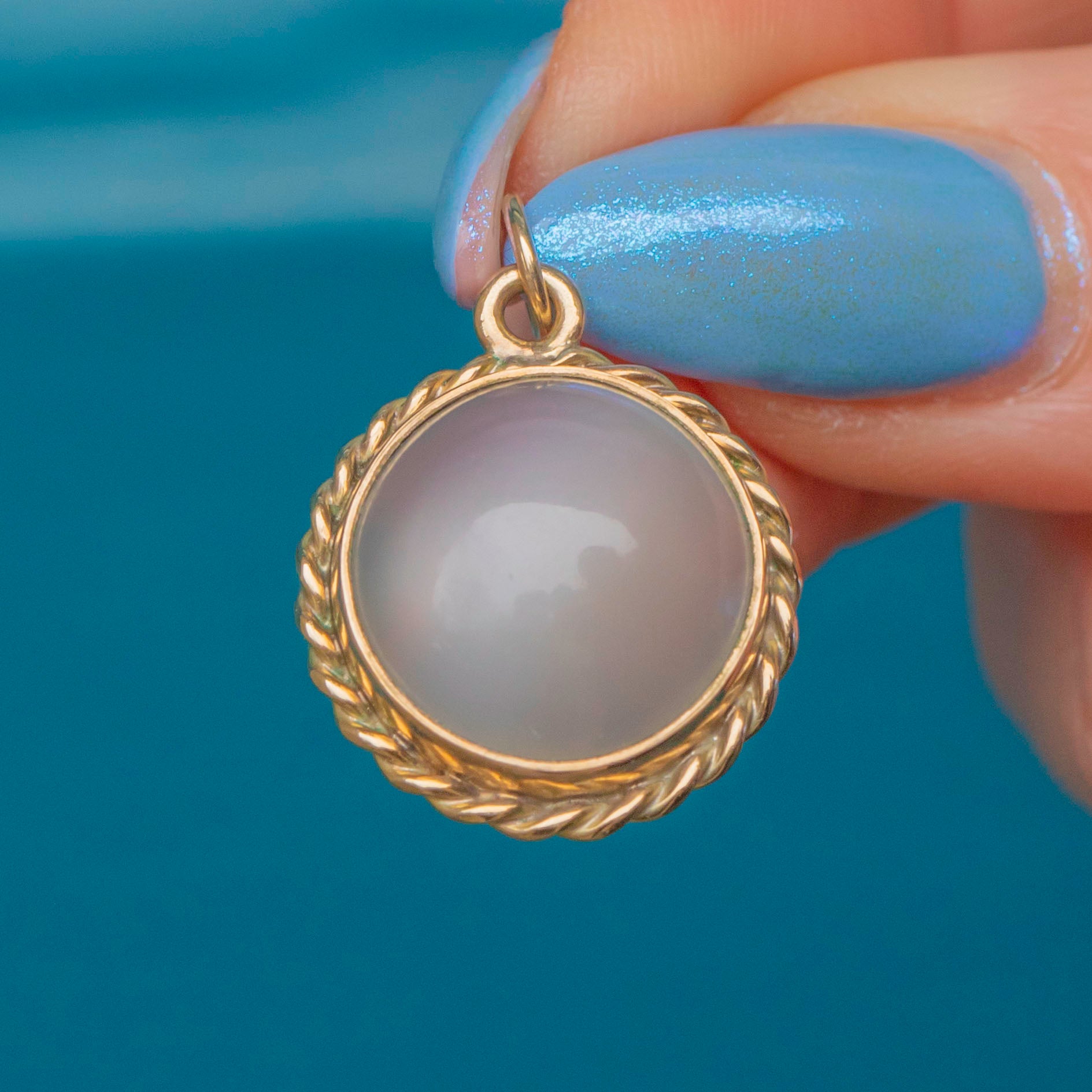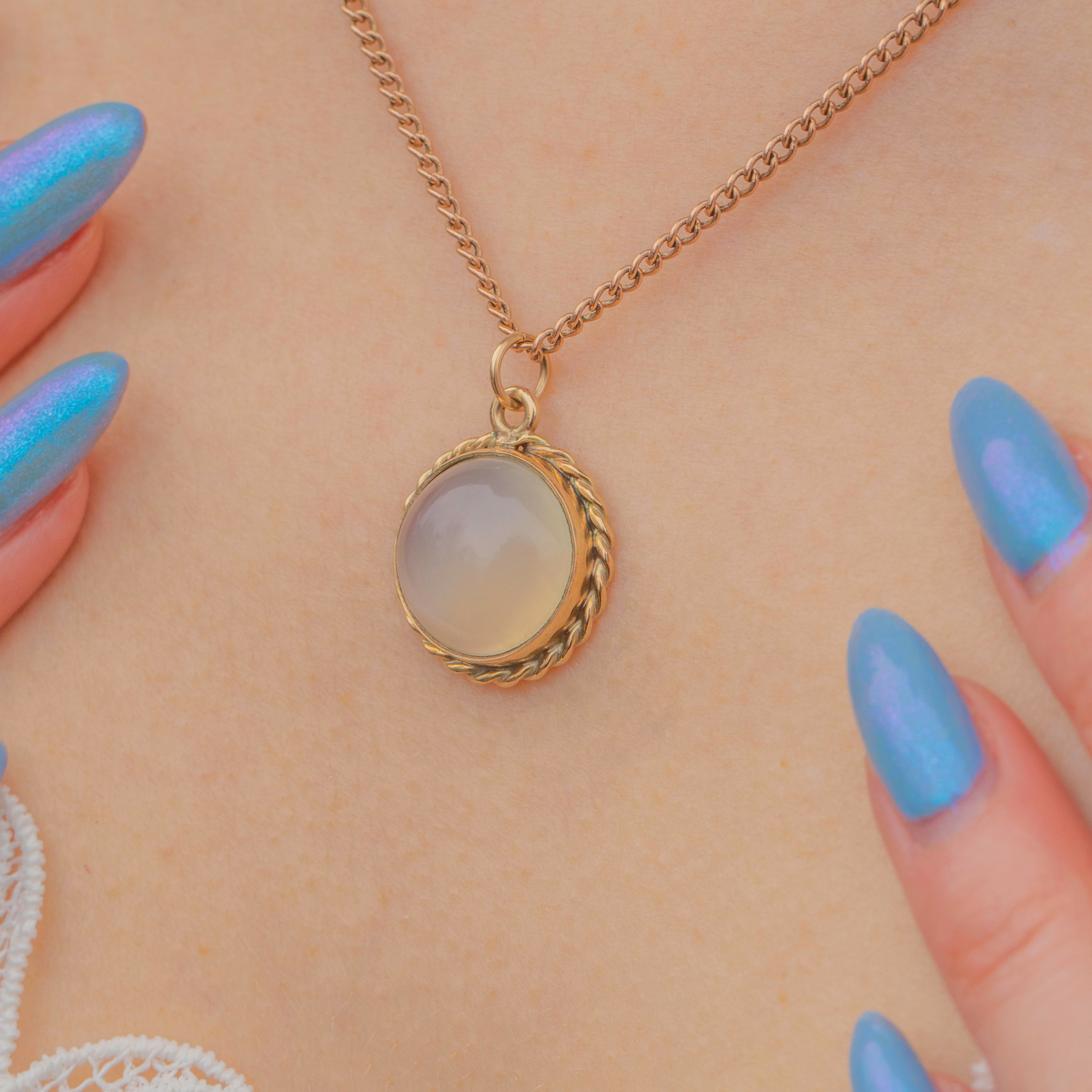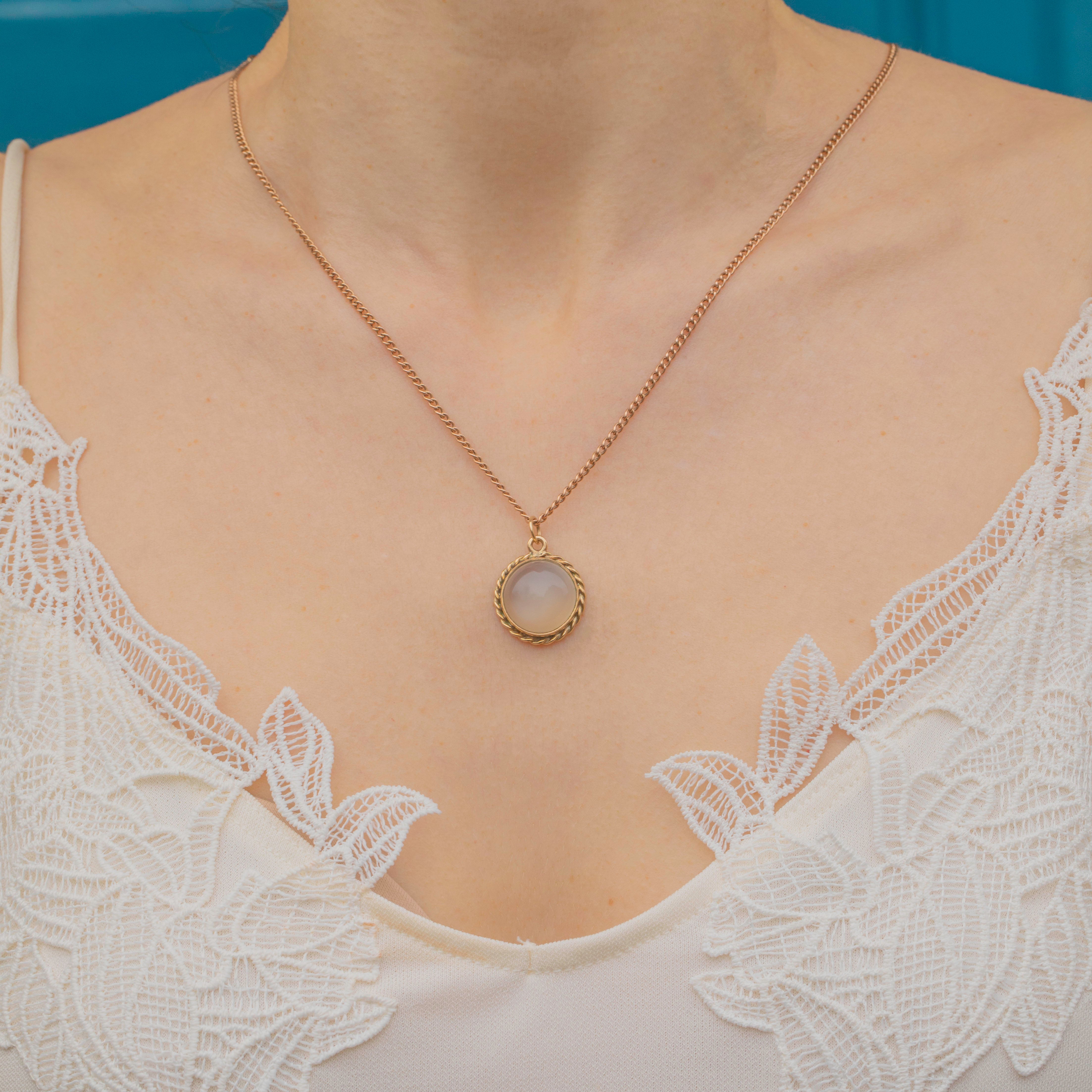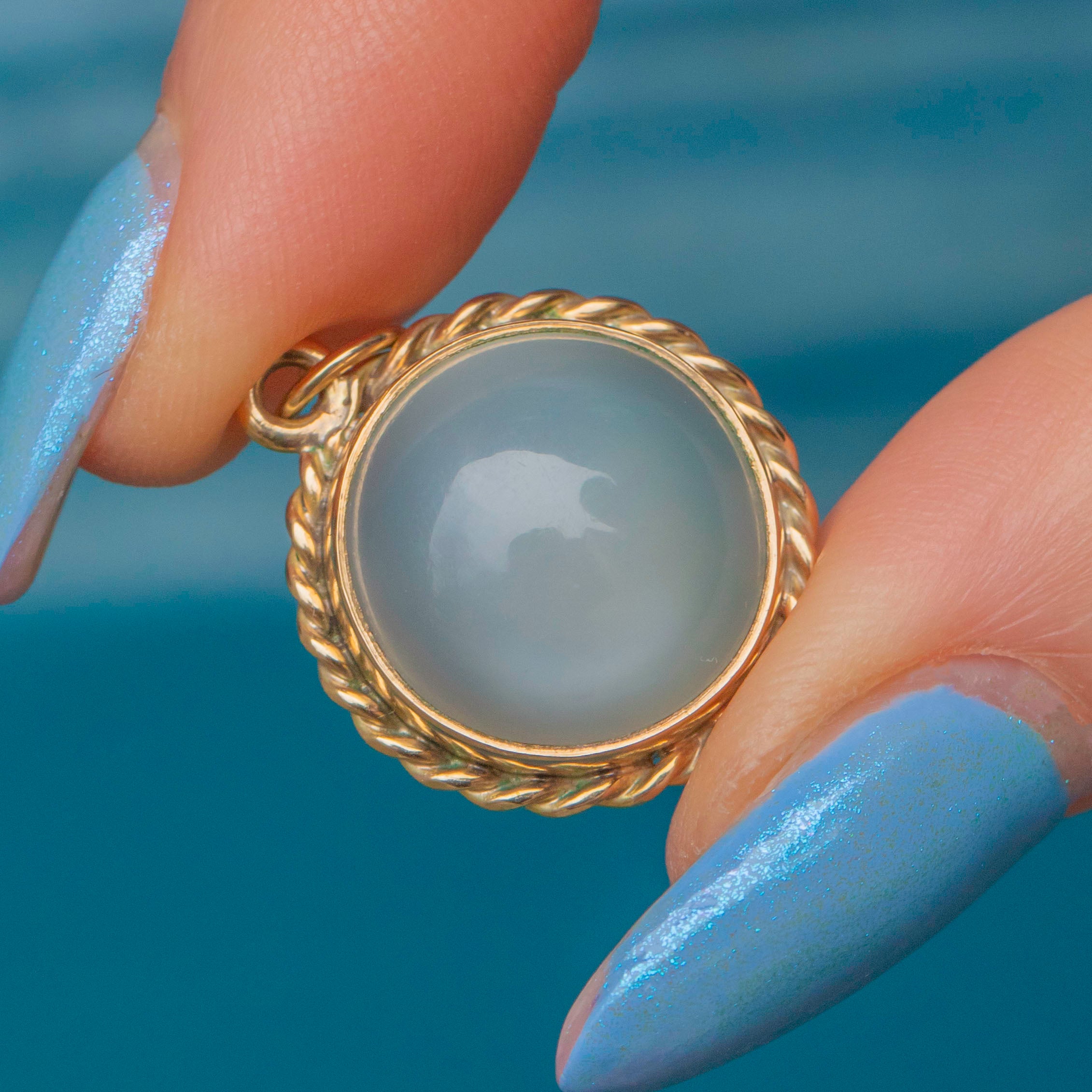 The cabochon cut of the stone offers a smooth and polished finish and is accentuated by the neat rope border providing a decorative finish. This vintage Moonstone pendant is the perfect size for everyday wear and will instantly elevate your outfit!