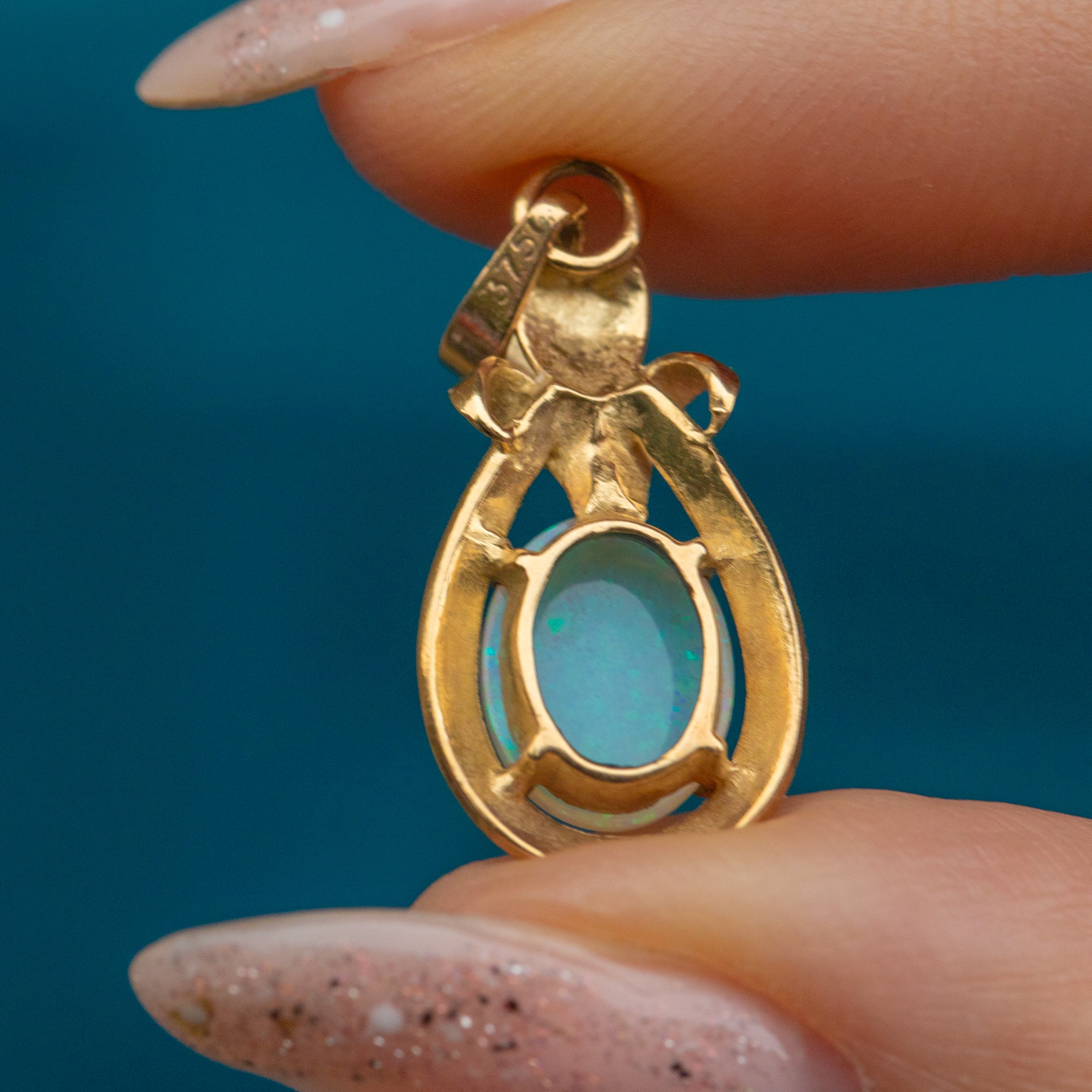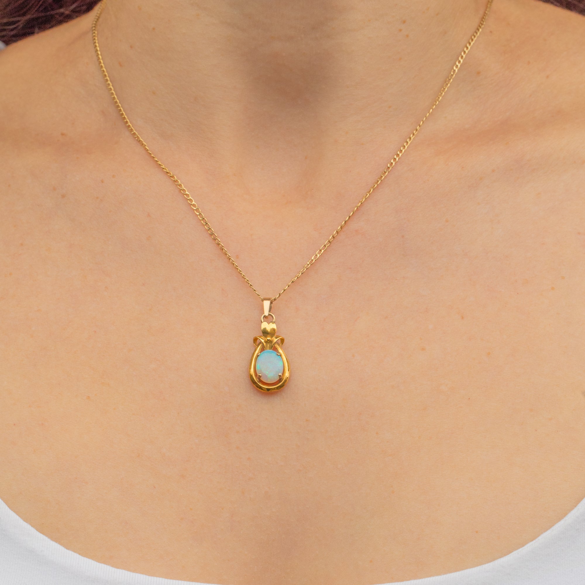 This 9ct Gold natural solid Opal pendant is the magical piece your jewellery collection has been missing! An ethereal milky 0.70ct natural Opal is snug within her buttery 9ct Gold setting, exhibiting electric shimmers in the light.