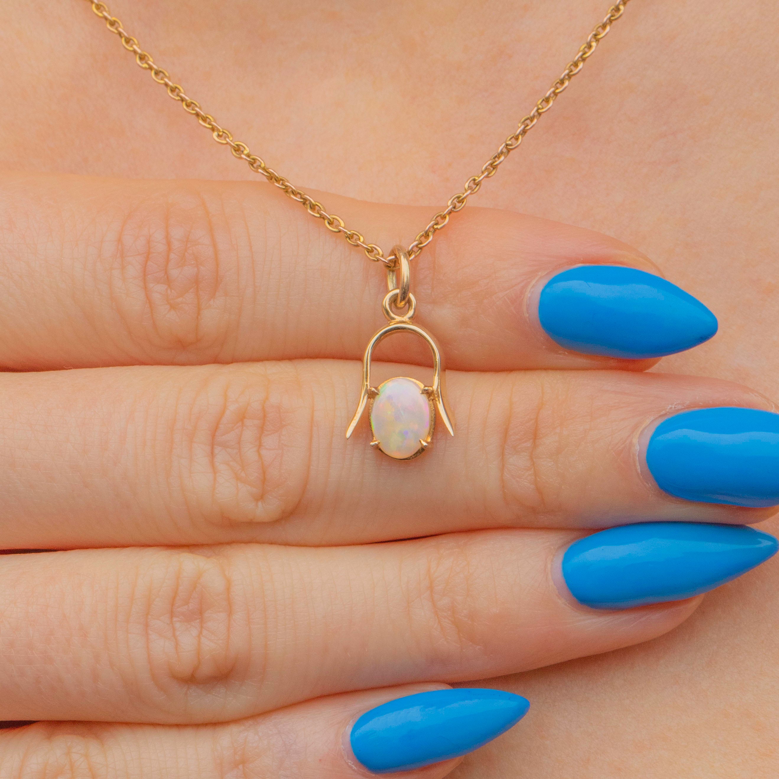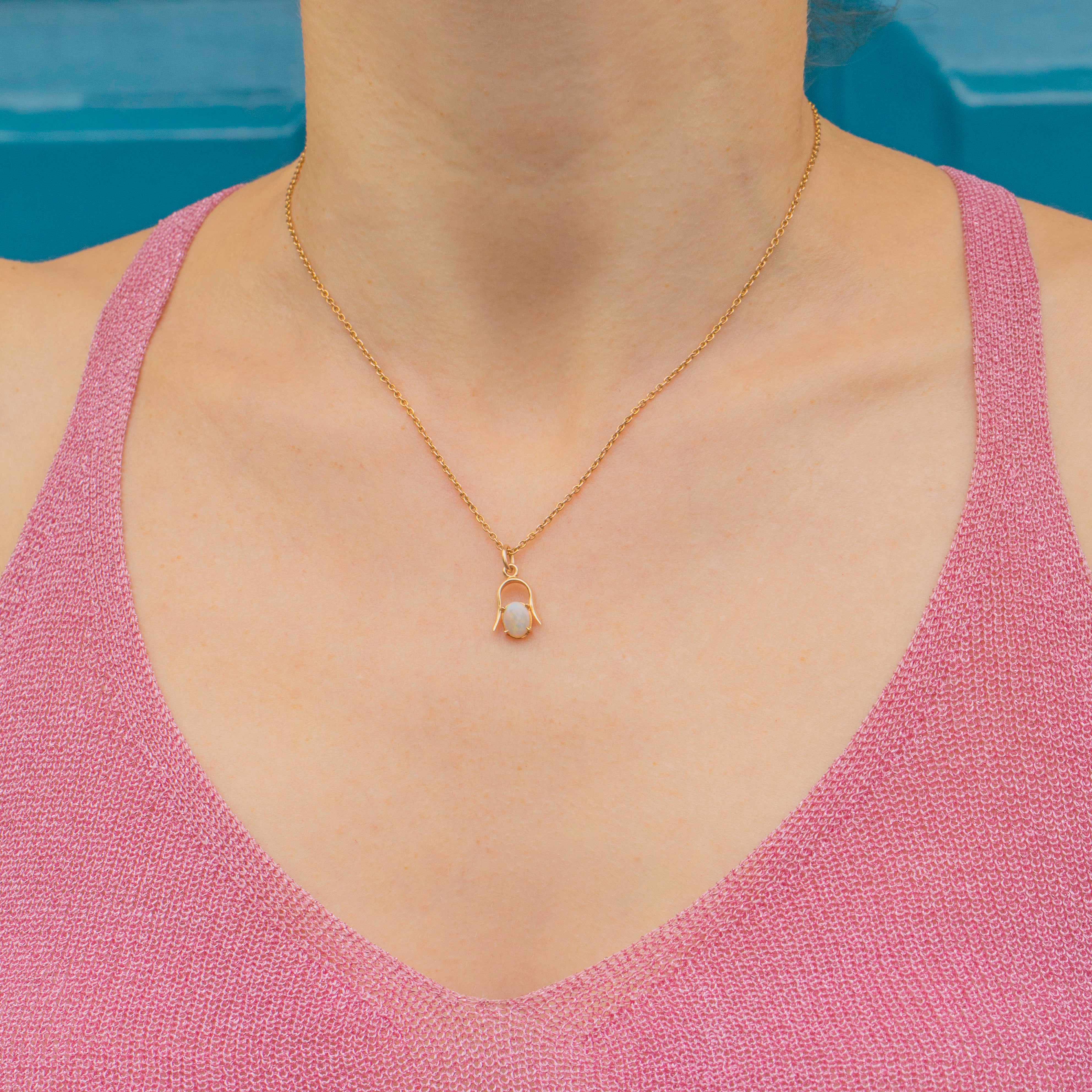 Crafted from sumptuous 9ct Gold, this vintage Opal pendant possesses an ethereal quaity. A charm for those drawn to cosmic mystery, she is a timeless piece that will provide your décolletage with an enchanting elegance.