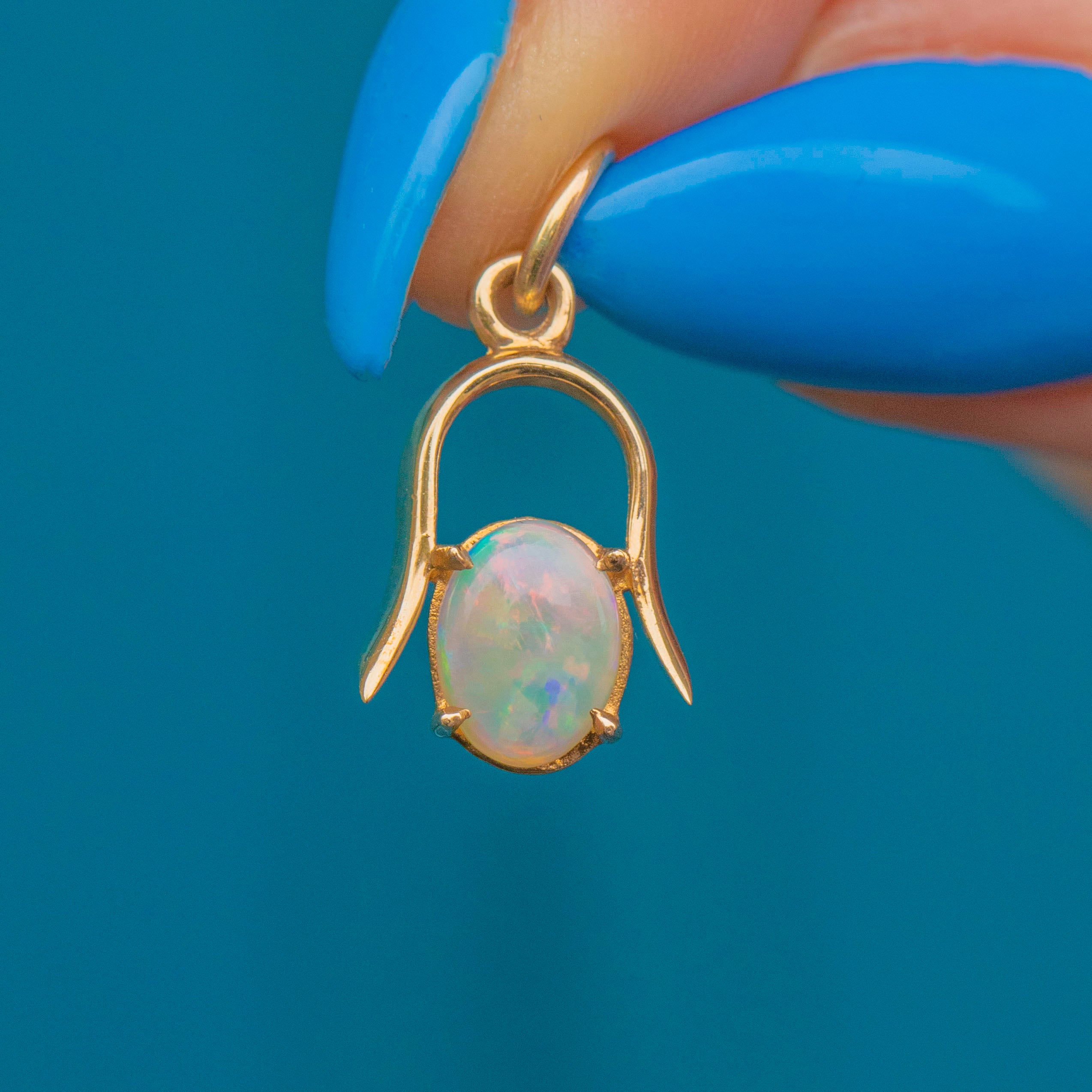 This 9ct Gold Opal bell charm captures the essence of a distant midnight toll. Her curvaceous bell shape is adorned with a mesmerising 0.55ct Opal and shimmers with delicate rainbow hues.